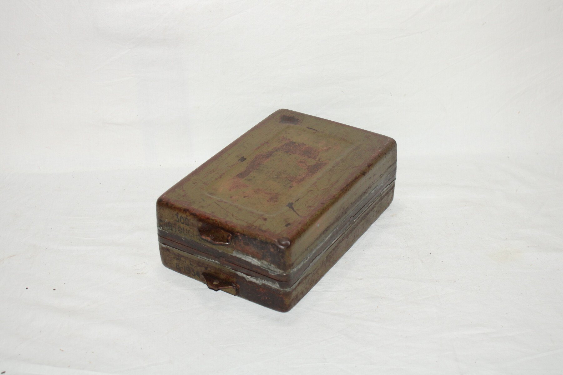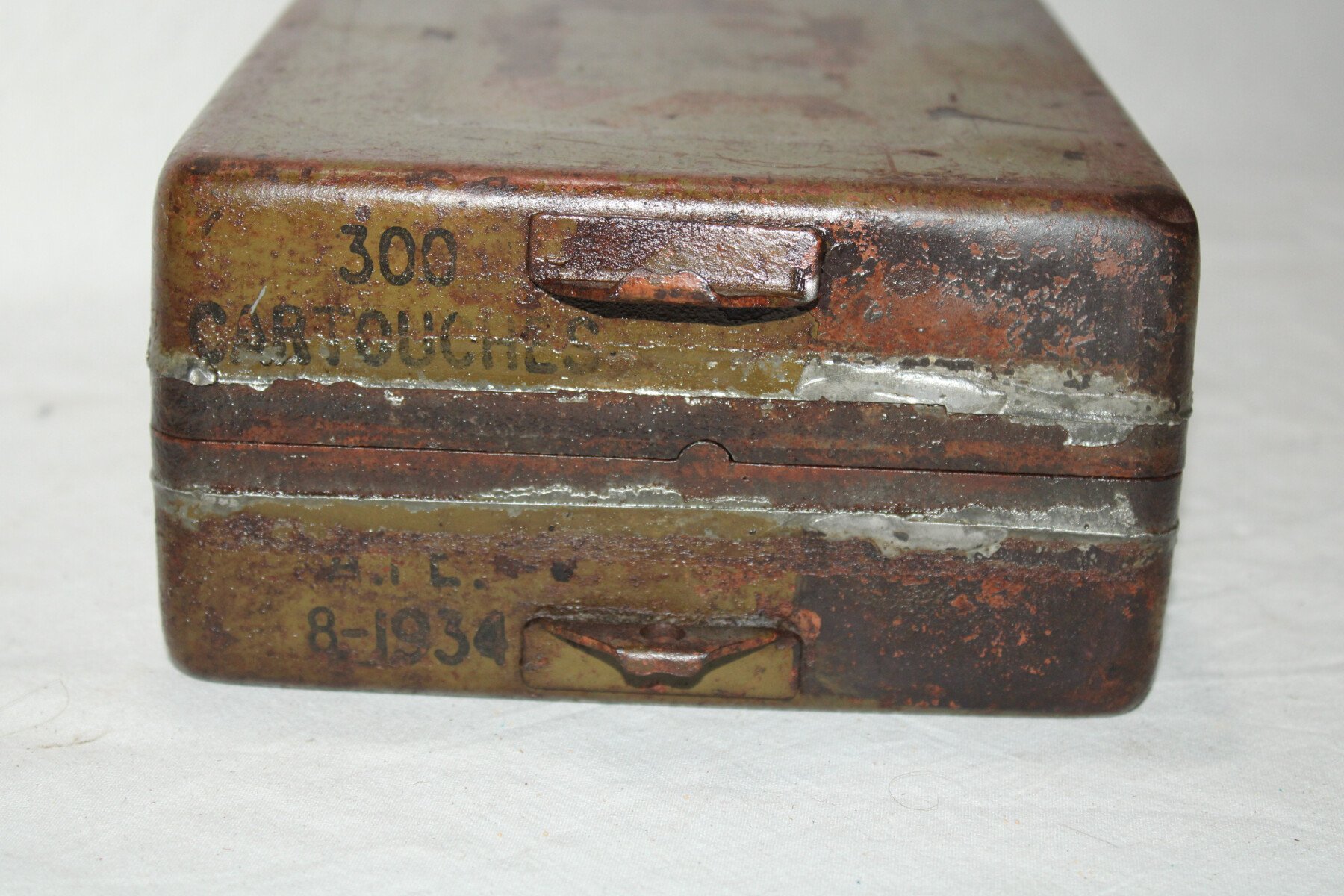 Caisse étanche pour 300 cartouches de 7.5mm pour la ligne Maginot. Daté 8/1934. Poigné absente. Non percé.