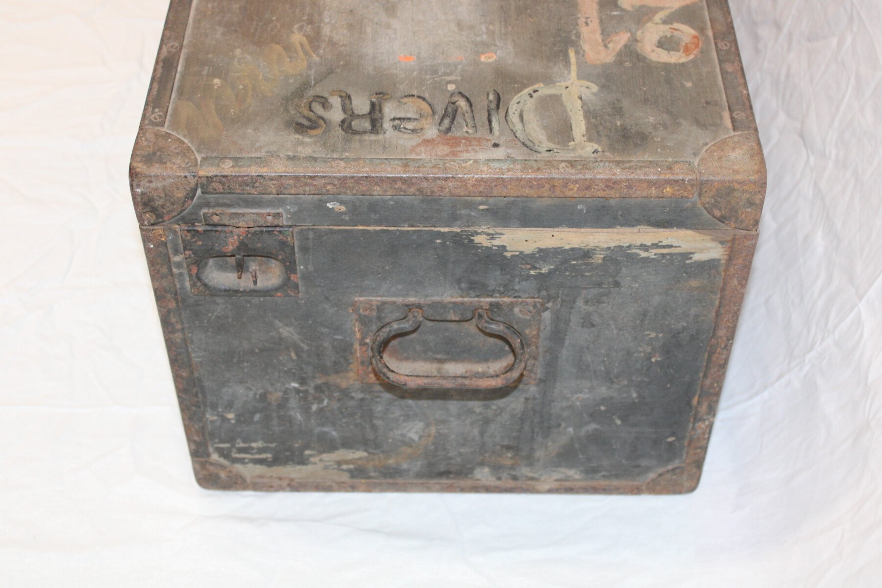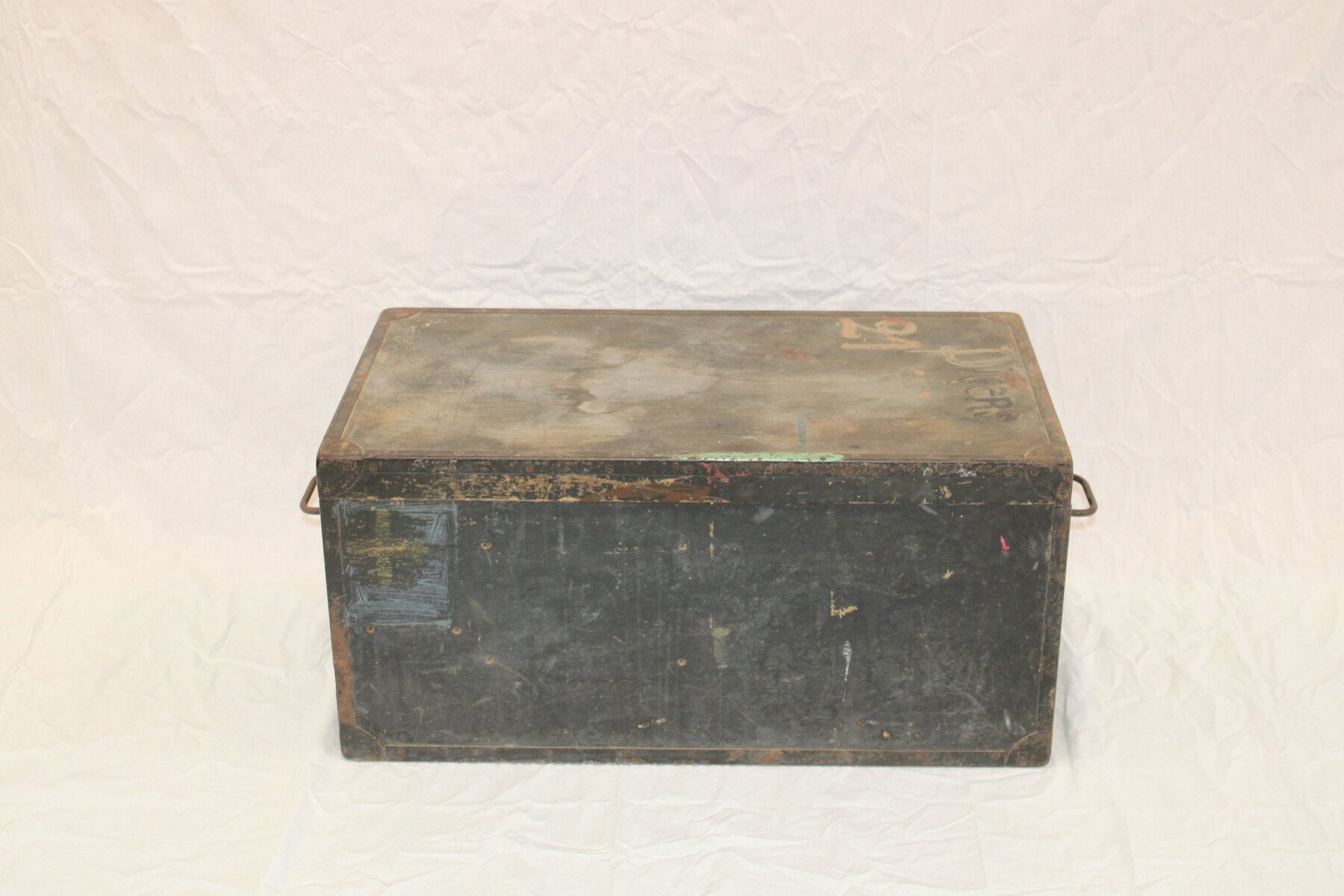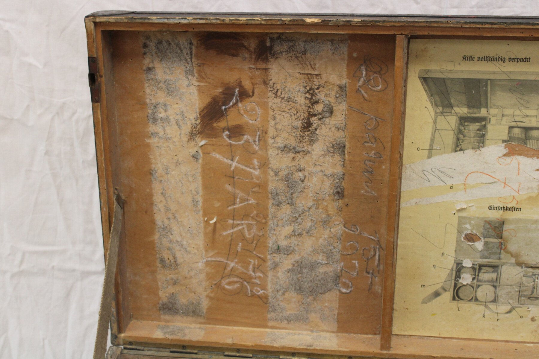 Peu commune caisse de transport pour masque anti gaz, Gasschutz Vorrat kasten. Vide de son contenu. Les compartiments ont été retirés. ( utilisation civile après guerre pour du rangement ??). L'étiquette est encore en partie bien visiible. Léger dommage dans le fons de la caisse. La peinture d'origine en extérieur est encore présente à plus de 80%. Dimension Hauteur: 34,5 cm, Longueur : 73,5 cm, Largeur: 41 CM. Expédition possible.