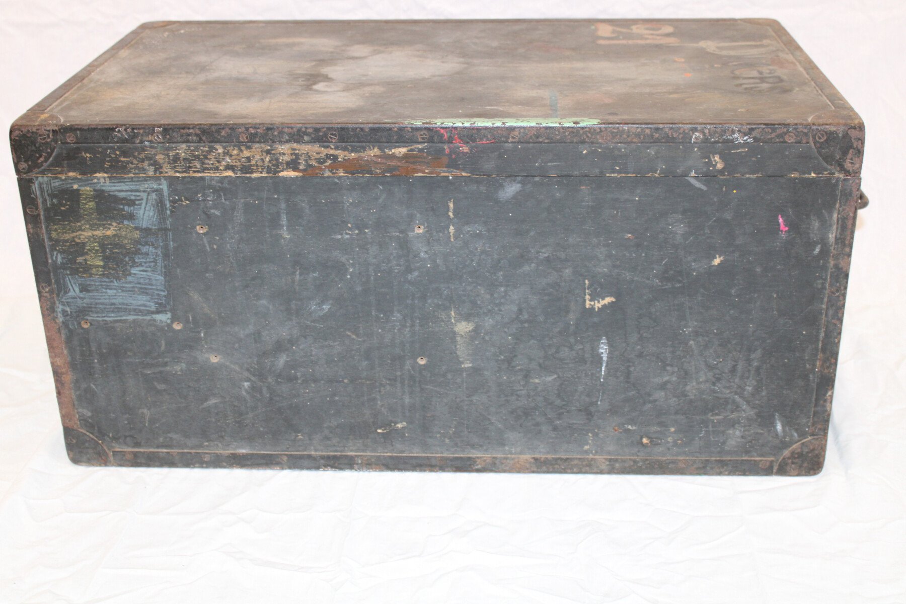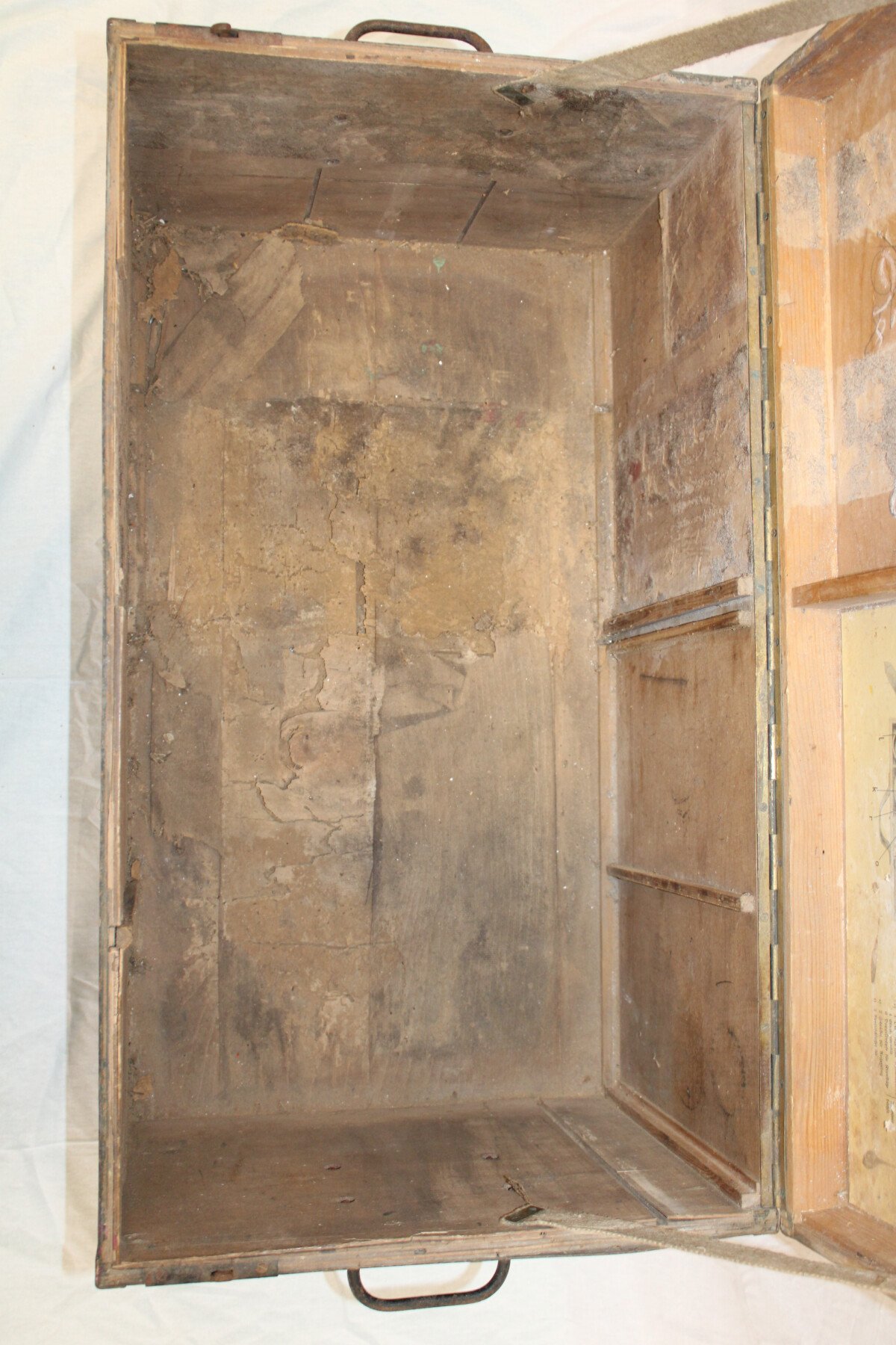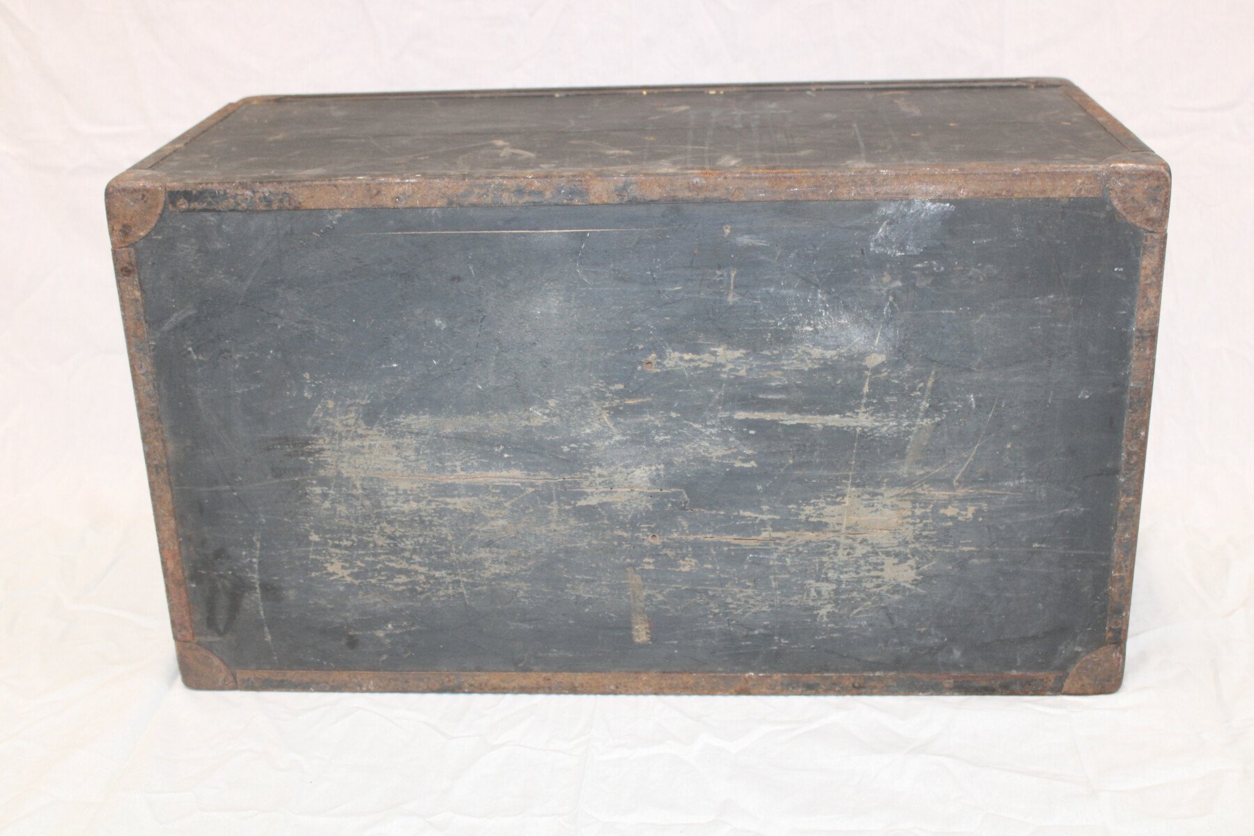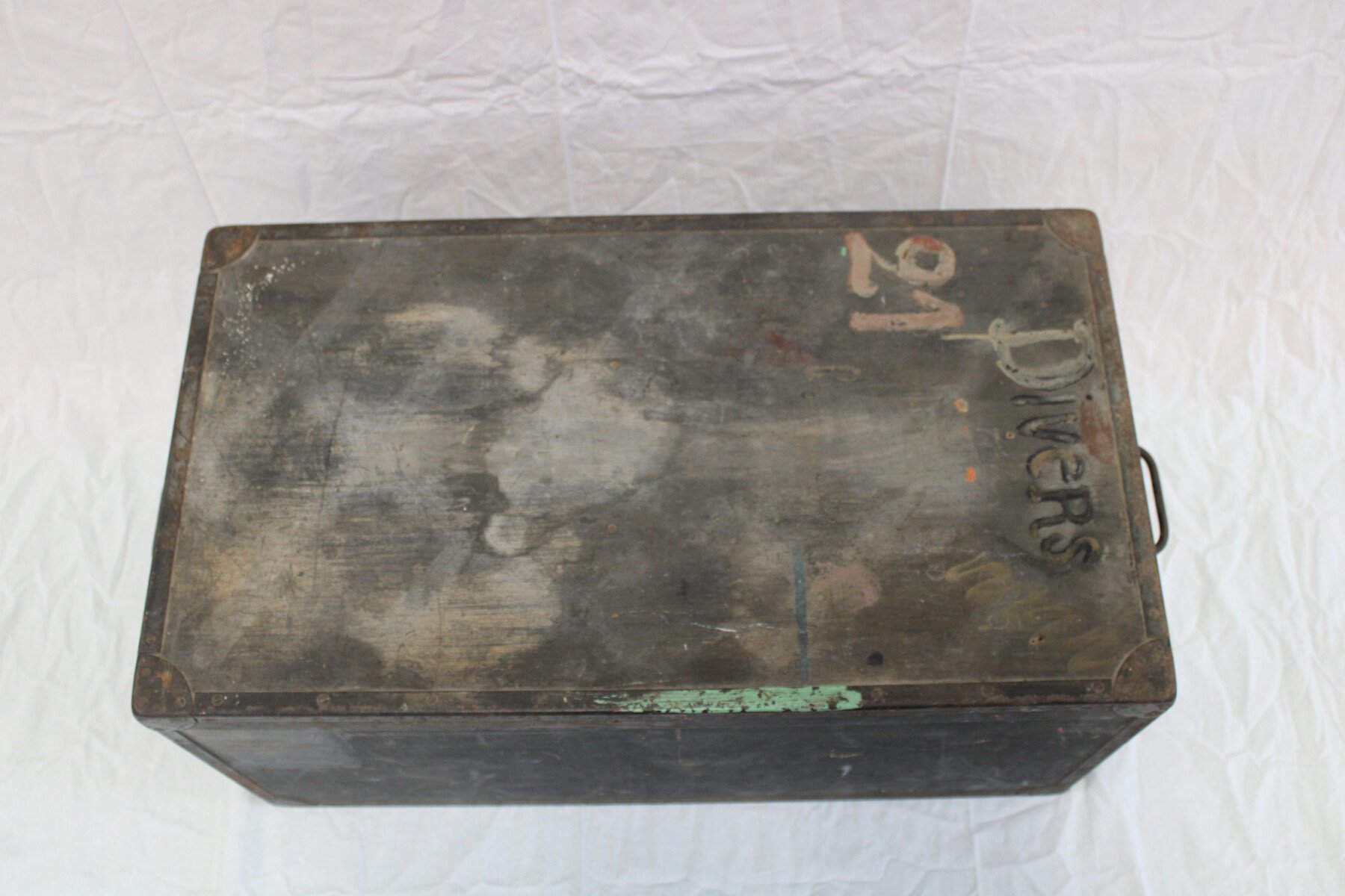 Peu commune caisse de transport pour masque anti gaz, Gasschutz Vorrat kasten. Vide de son contenu. Les compartiments ont été retirés. ( utilisation civile après guerre pour du rangement ??). L'étiquette est encore en partie bien visiible. Léger dommage dans le fons de la caisse. La peinture d'origine en extérieur est encore présente à plus de 80%. Dimension Hauteur: 34,5 cm, Longueur : 73,5 cm, Largeur: 41 CM. Expédition possible.