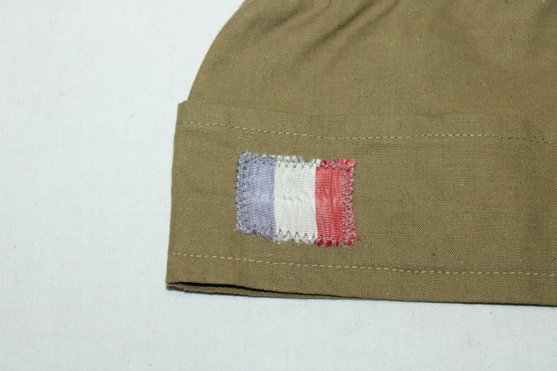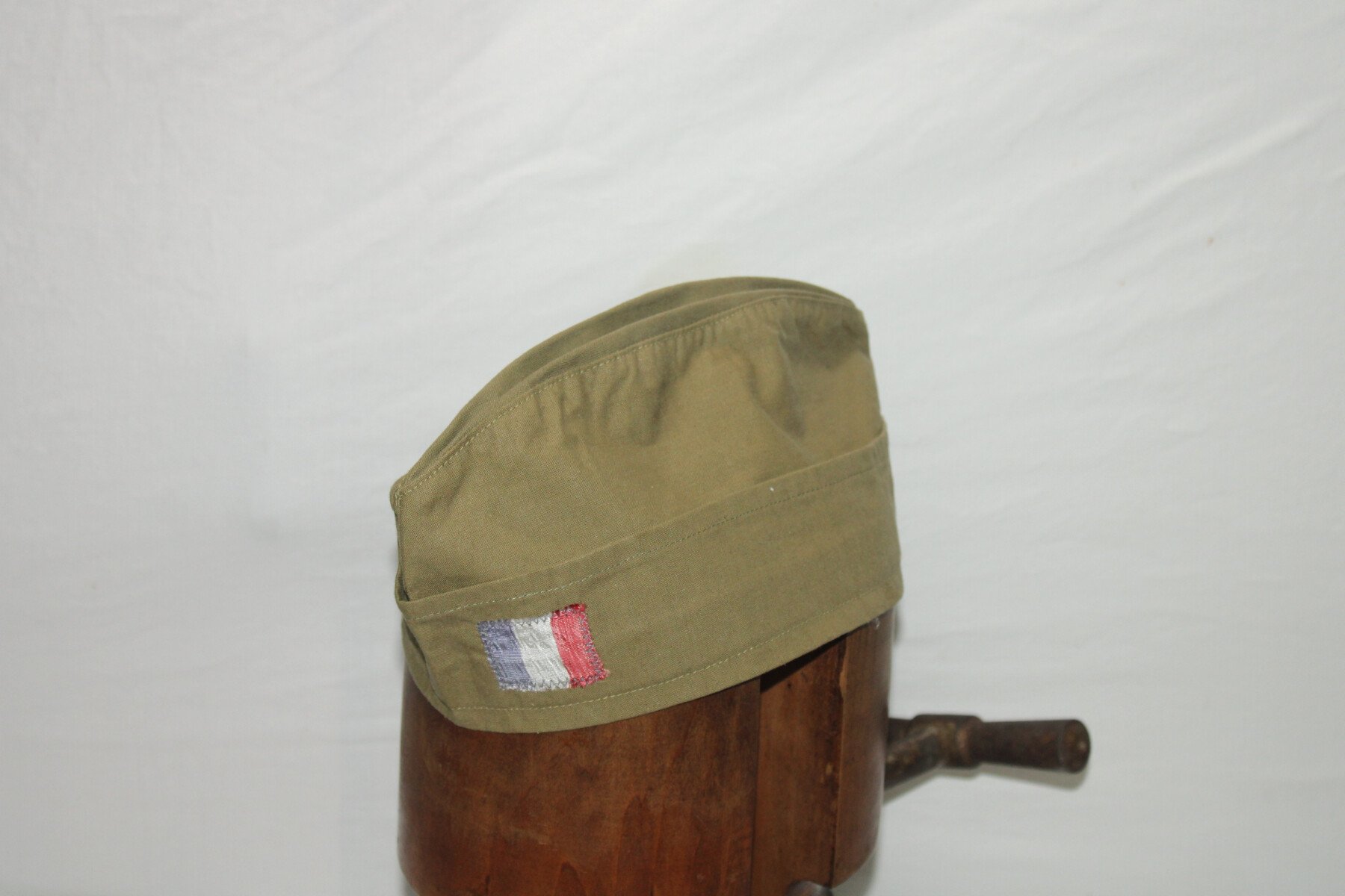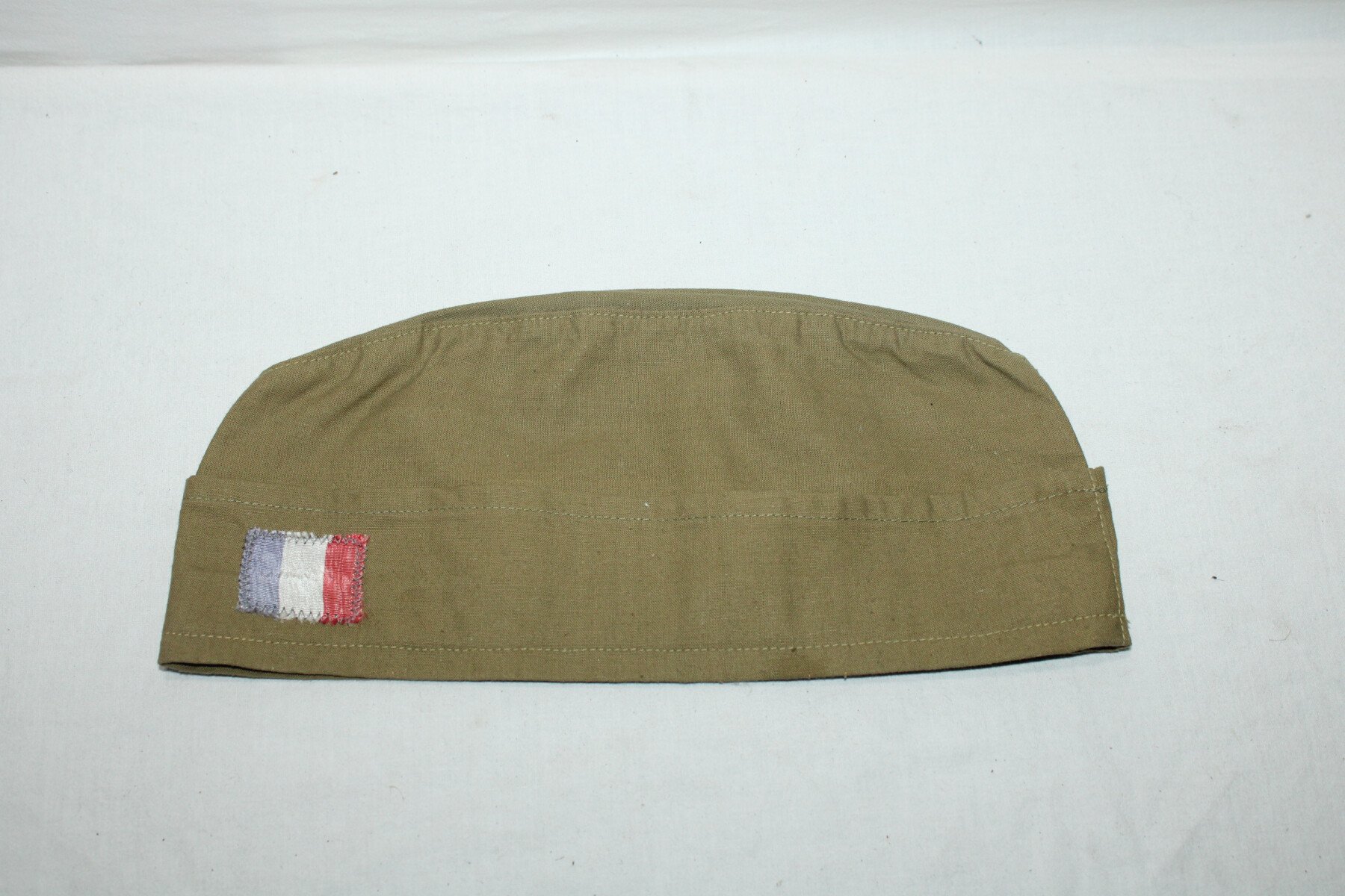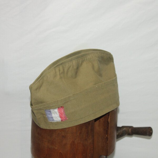 Calot en toile verte (surement sur une base taillé d'une chemise modèle 35 ou 41) avec un drapeau Français cousus à l'avant. Taille 58 environs.