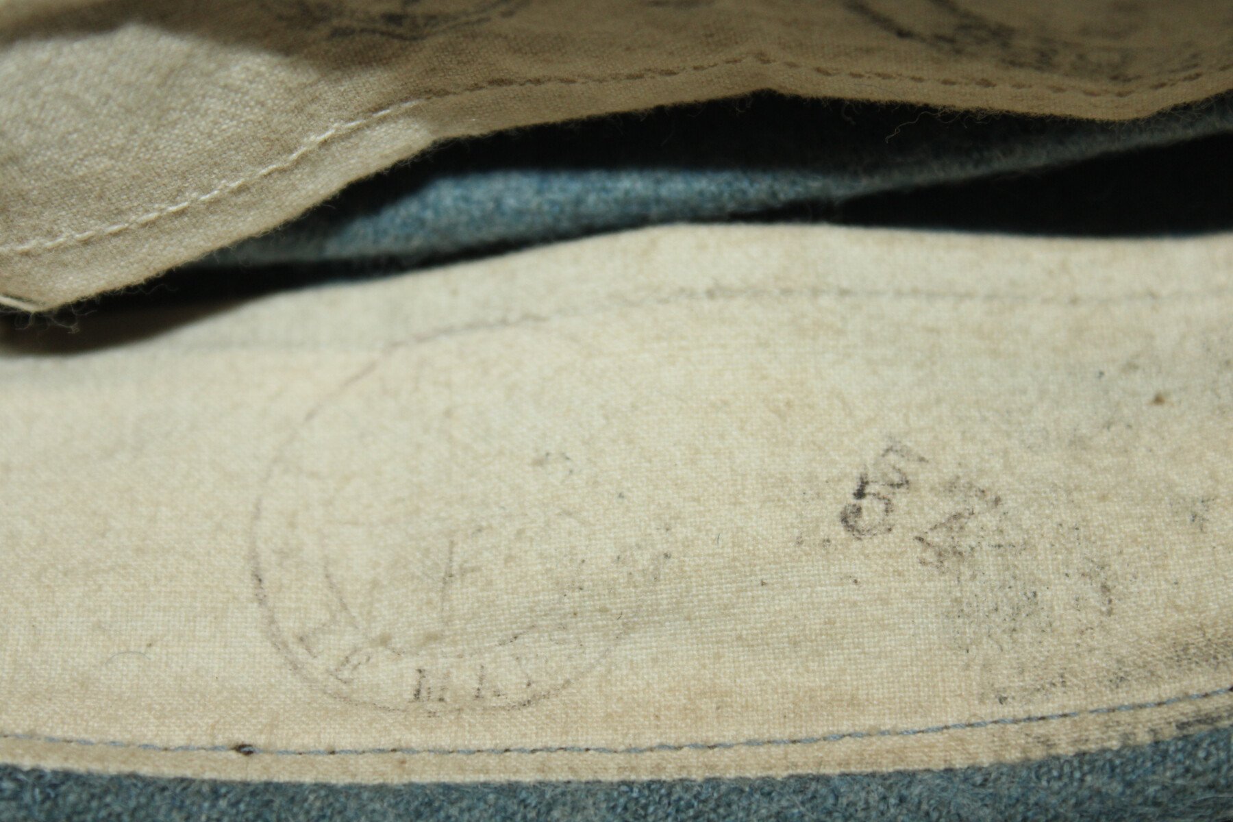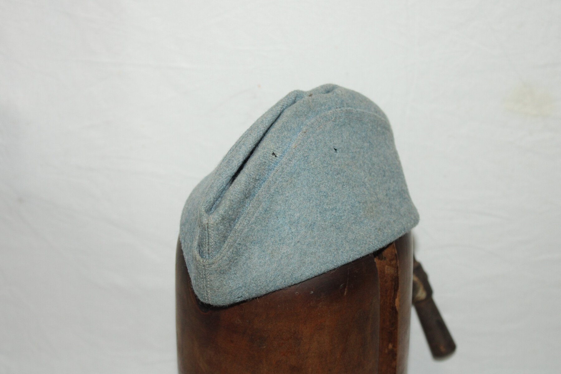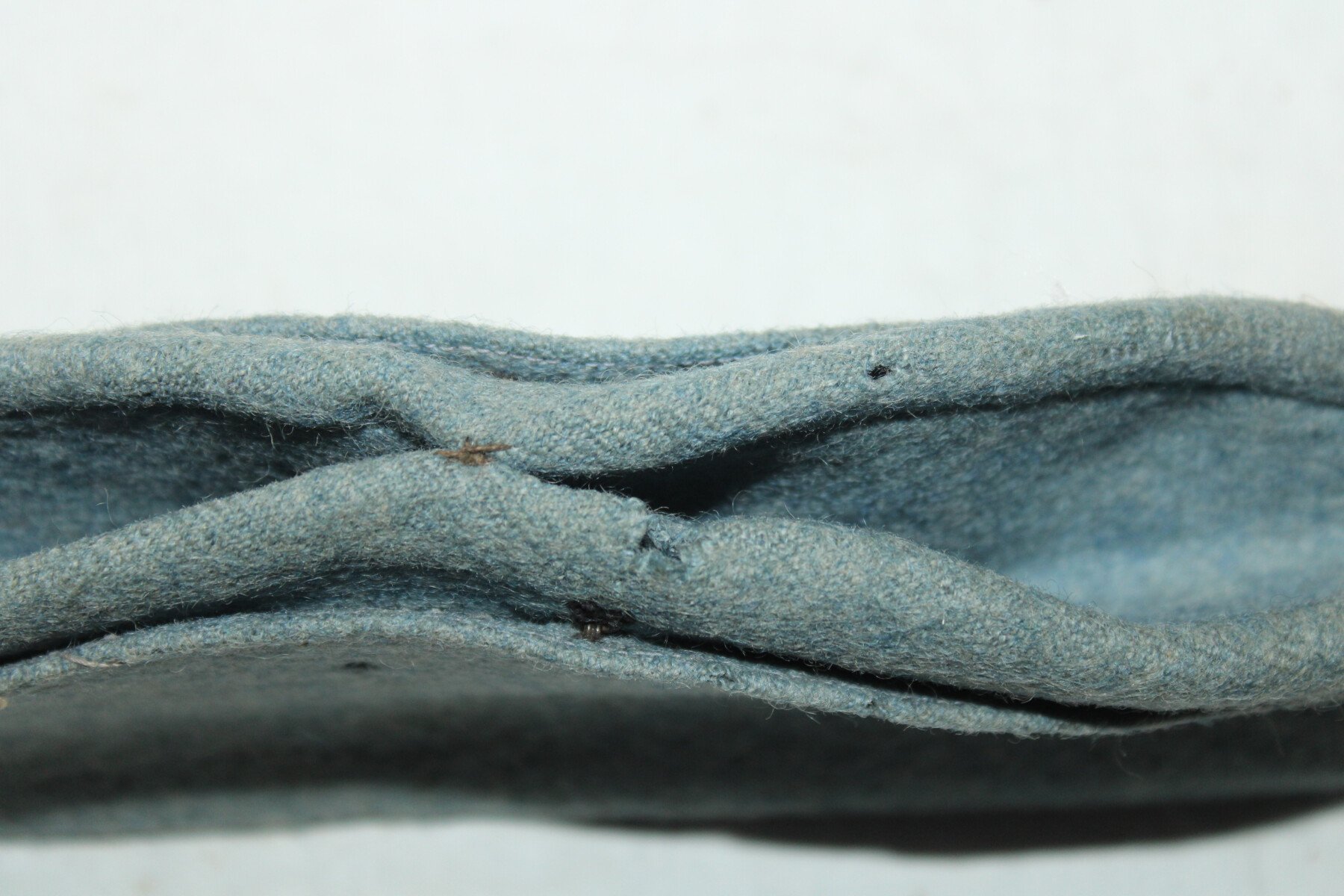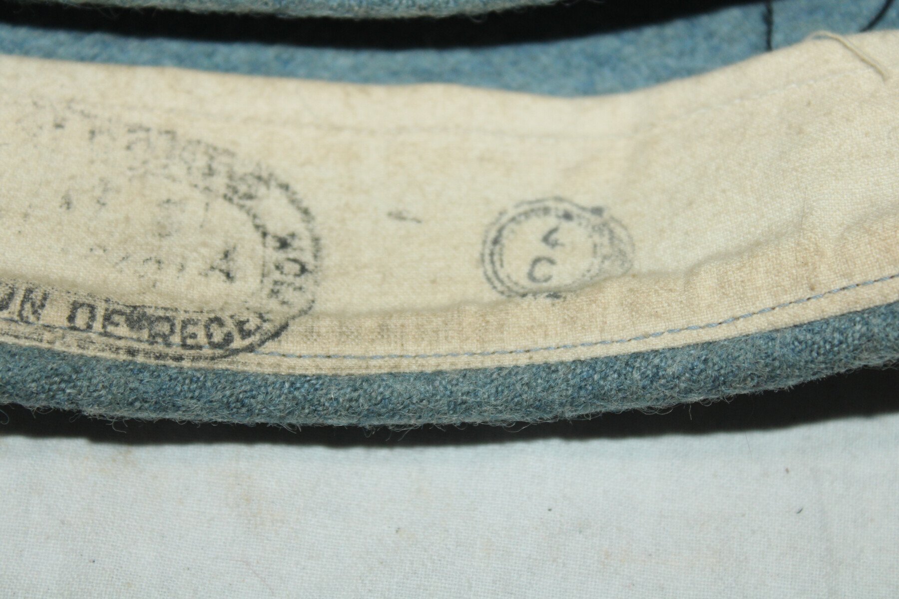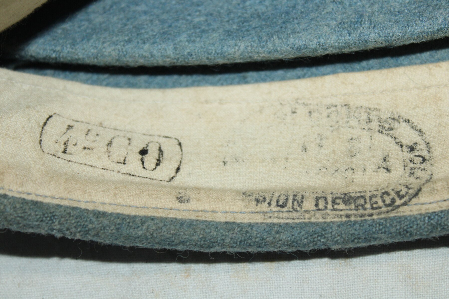 Calot troupe modèle 1891/1915 en drap de laine bleu horizon, état d'usage, plusieurs petit trous. Tamponné 4e CO. Tampon de date présent peu lisible. Taille 54 environ.