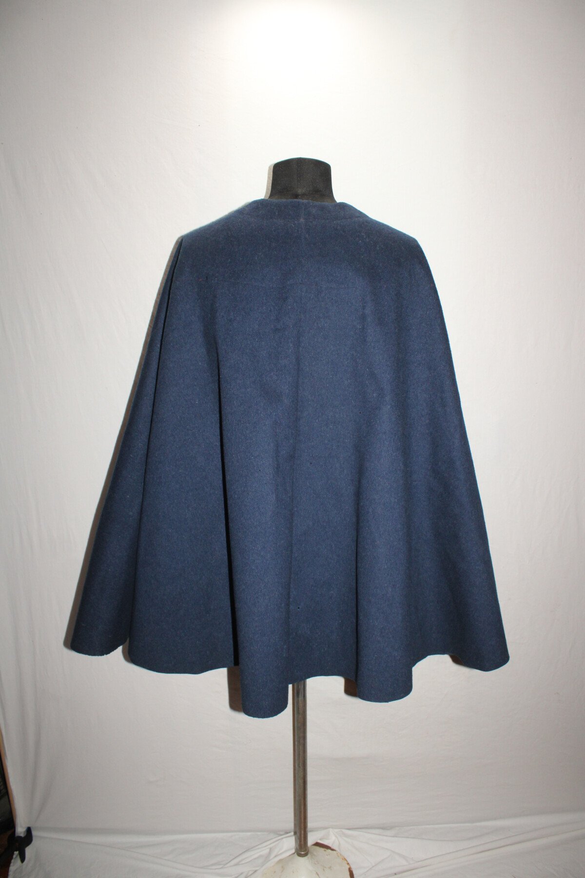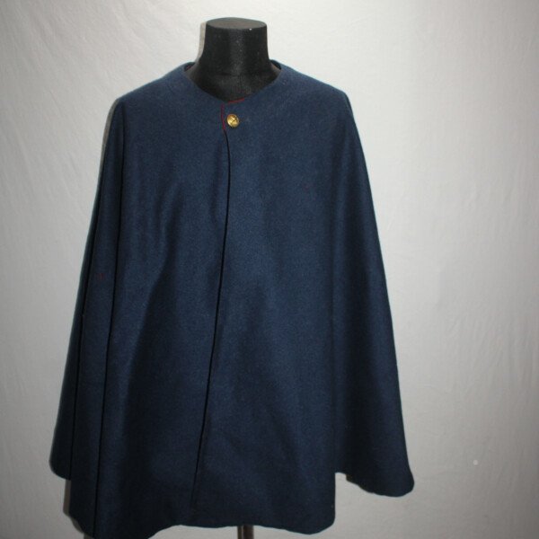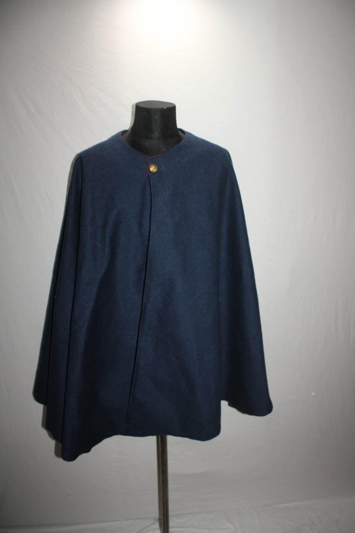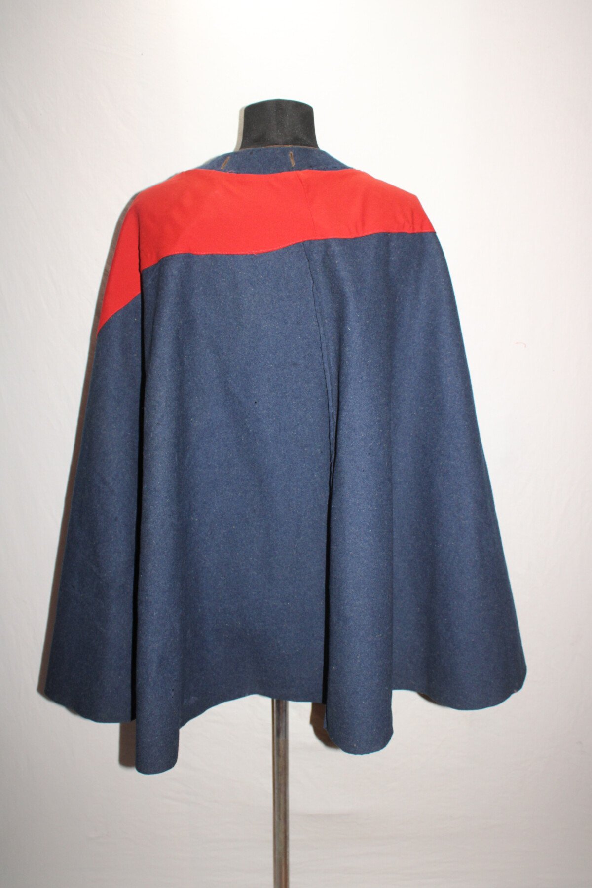 Cape en drap de laine gris de fer bleuté doublé rouge sur une partie. Un bouton de l'artillerie. Boutonnières au col. Nombreux petit trous. 84cm de haut.