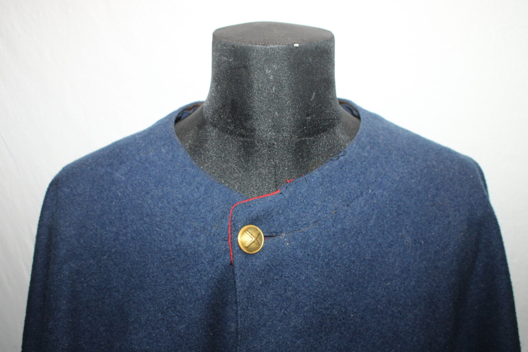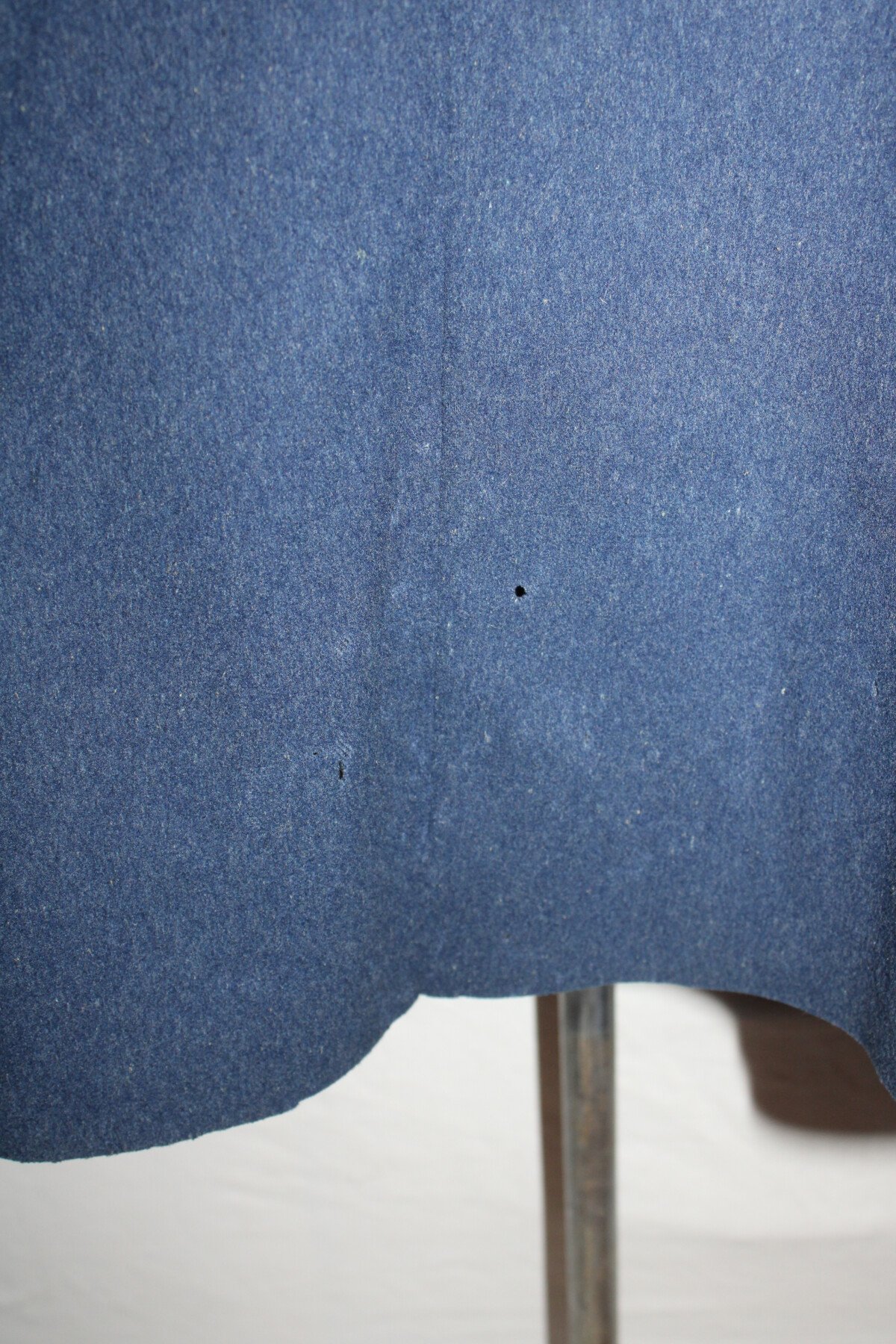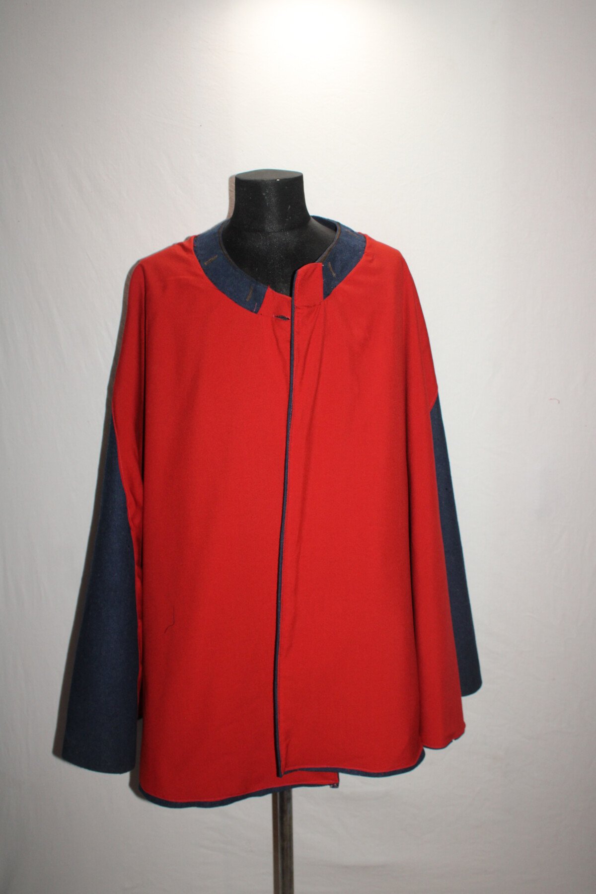 Cape en drap de laine gris de fer bleuté doublé rouge sur une partie. Un bouton de l'artillerie. Boutonnières au col. Nombreux petit trous. 84cm de haut.