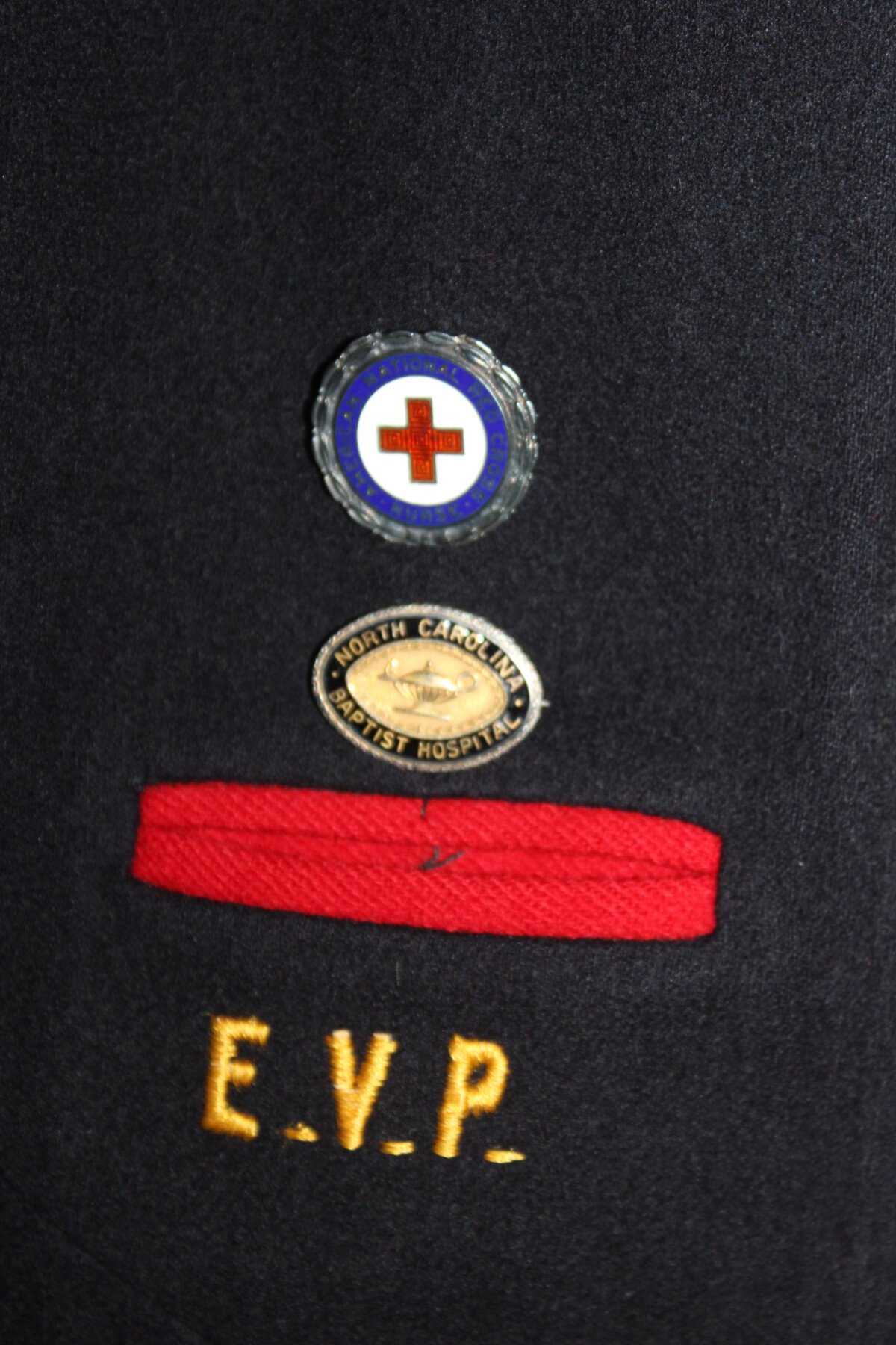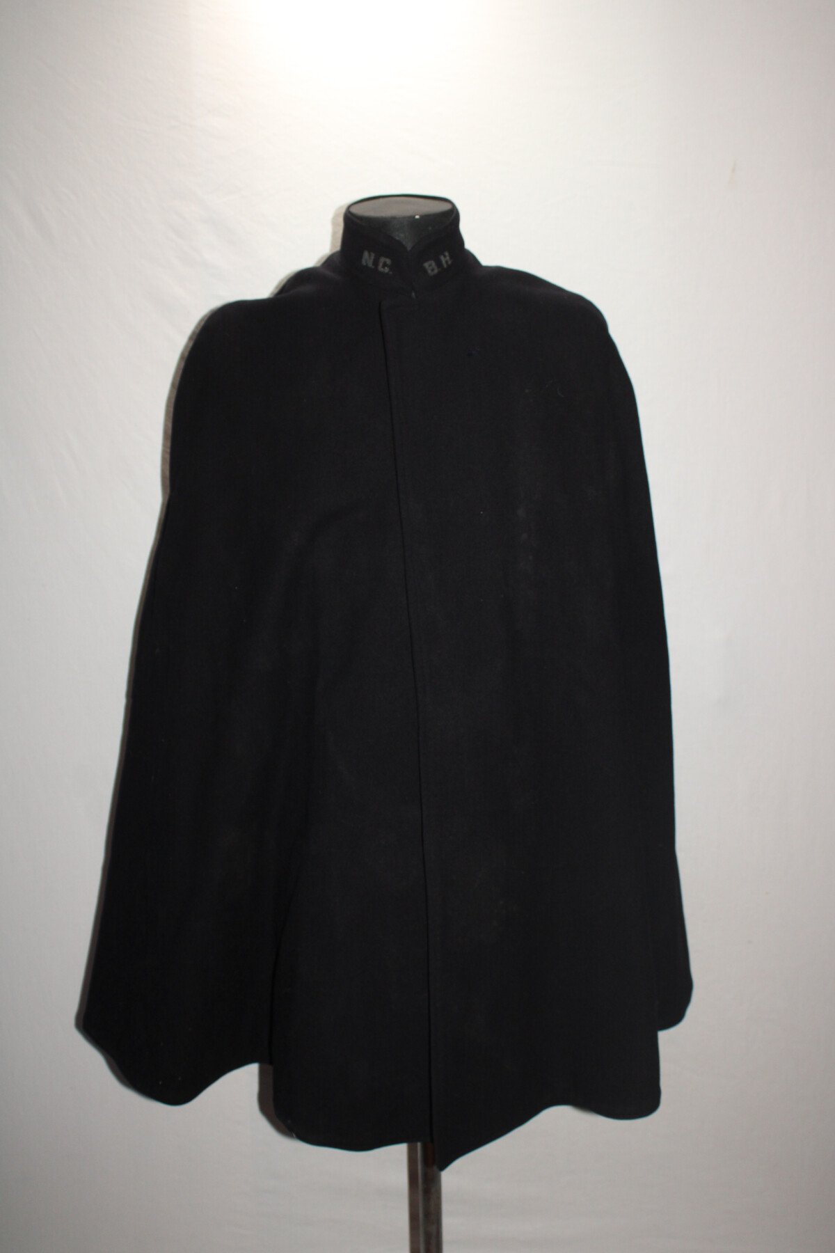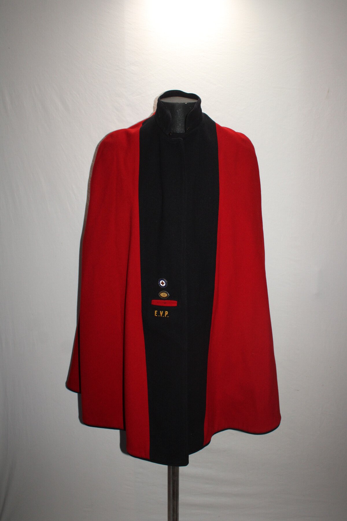 Cape en laine bleu doublé rouge de Nurse américaine. Au col brodée en canetille N.C B.H. Etiquette du fabricant Stein Uniform, Baltimore. Initiale EVP brodée. Deux broches à l'intérieur, Américan National red cross nurse, marqué W sterling 189293 et North carolina baptist hospital, gravée EVP 46. Boutons avant absent.