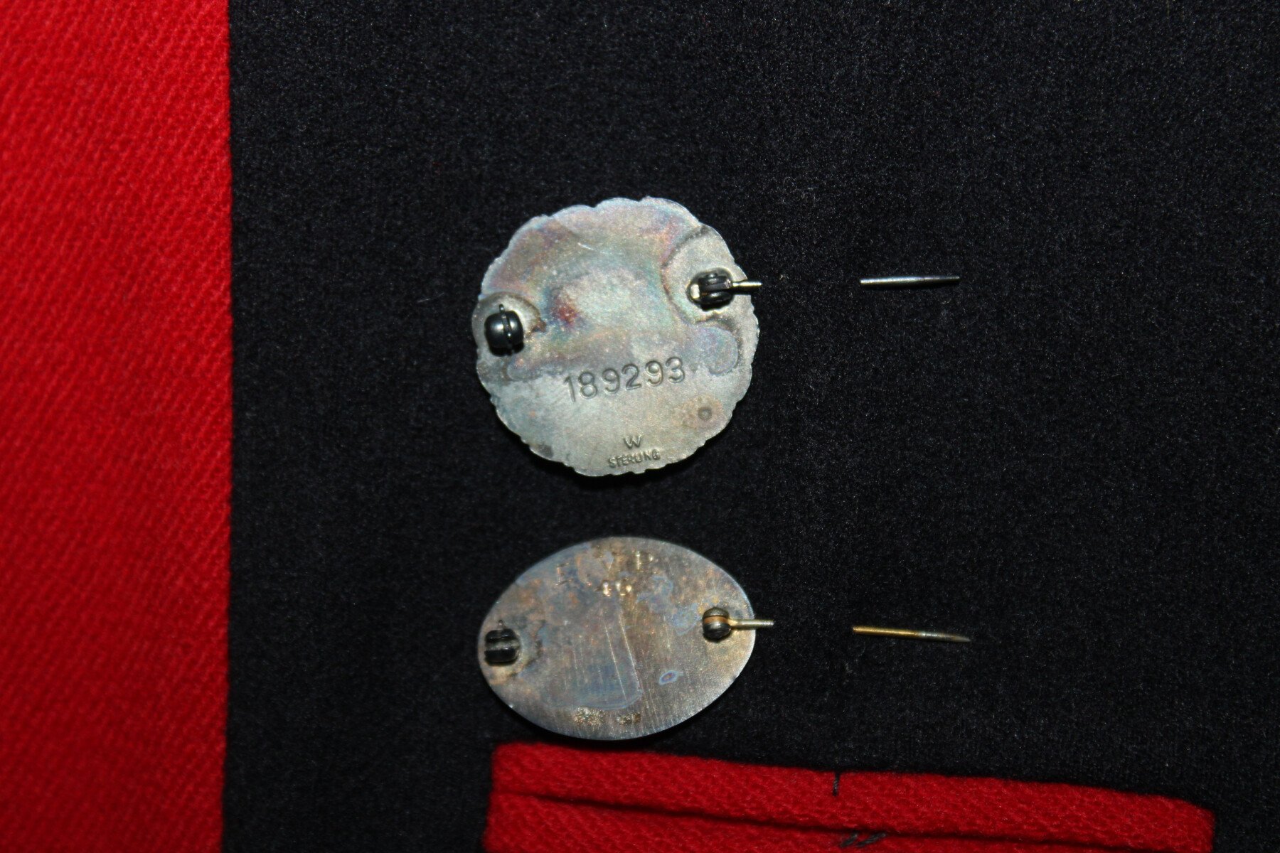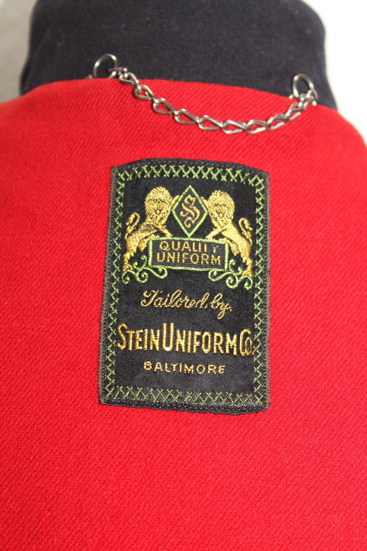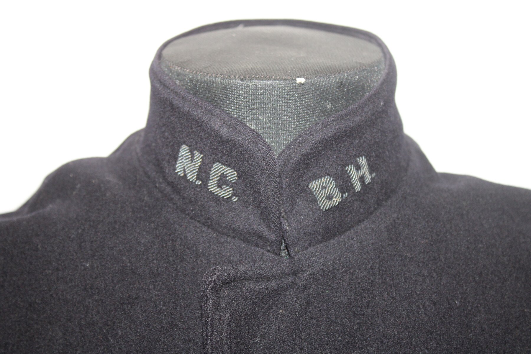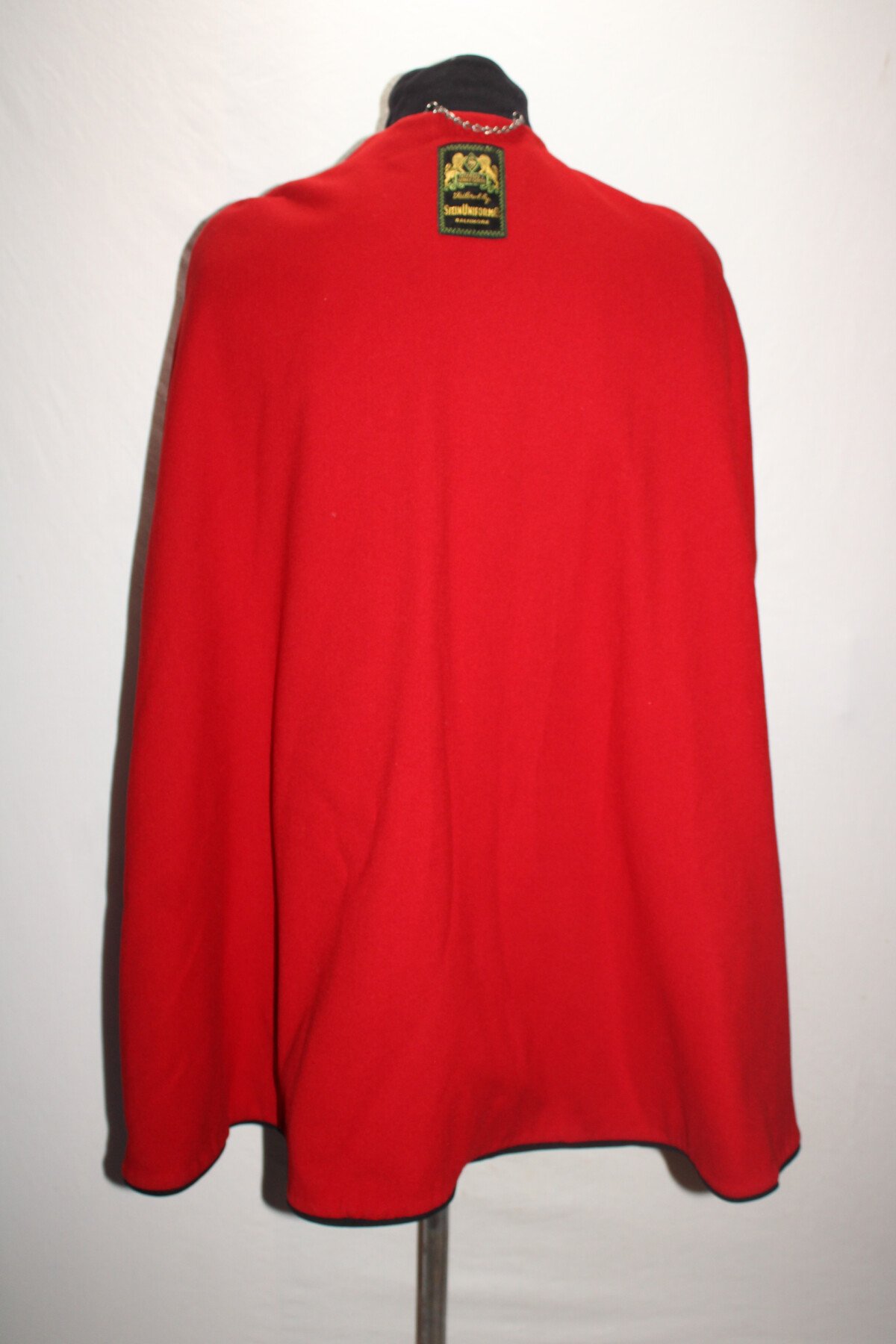 Cape en laine bleu doublé rouge de Nurse américaine. Au col brodée en canetille N.C B.H. Etiquette du fabricant Stein Uniform, Baltimore. Initiale EVP brodée. Deux broches à l'intérieur, Américan National red cross nurse, marqué W sterling 189293 et North carolina baptist hospital, gravée EVP 46. Boutons avant absent.