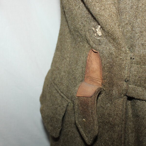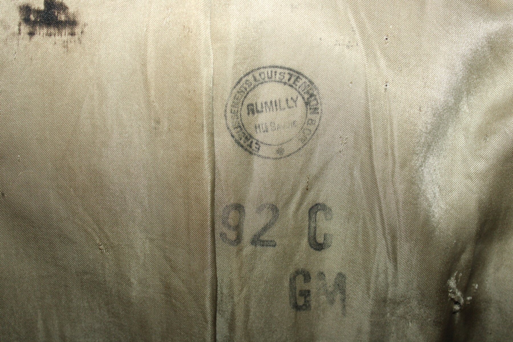 Capote modèle 1941 de l'armée d'armistice. Un trou sur la manche visible, une usure en haut du rabat. Boutons de passants de ceinturon absent ainsi que ceux de rabat dans le dos. Taille 92C GM. Petit boutons en bois. Raccourcie en bas de quelques centimètres. Pas de date visible. Taille: largeur d'épaules 44 cm à plat. Longueur de manche: 63 cm. Hauteur totale: 104 cm.