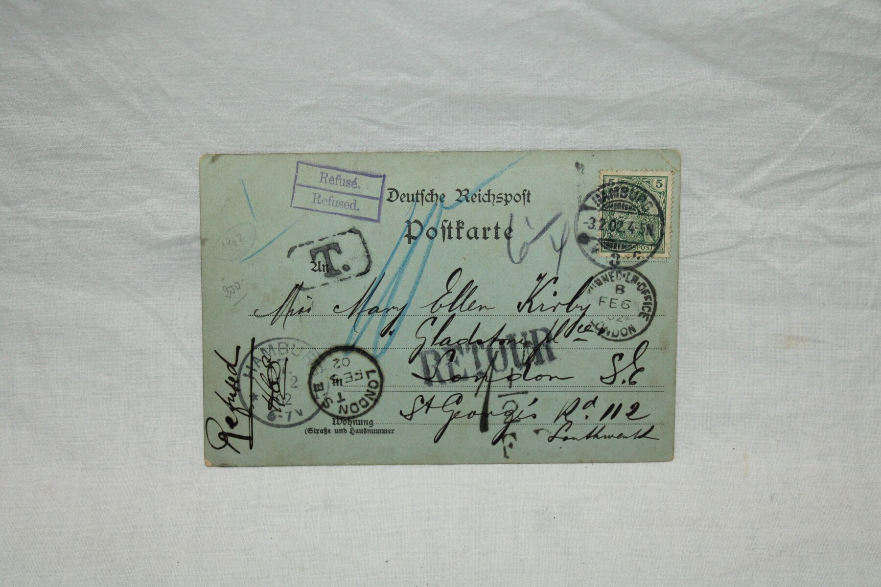 Carte postale envoyée en 1902 à un citoyen britannique, écrite ét retournée à l'envoyeur.