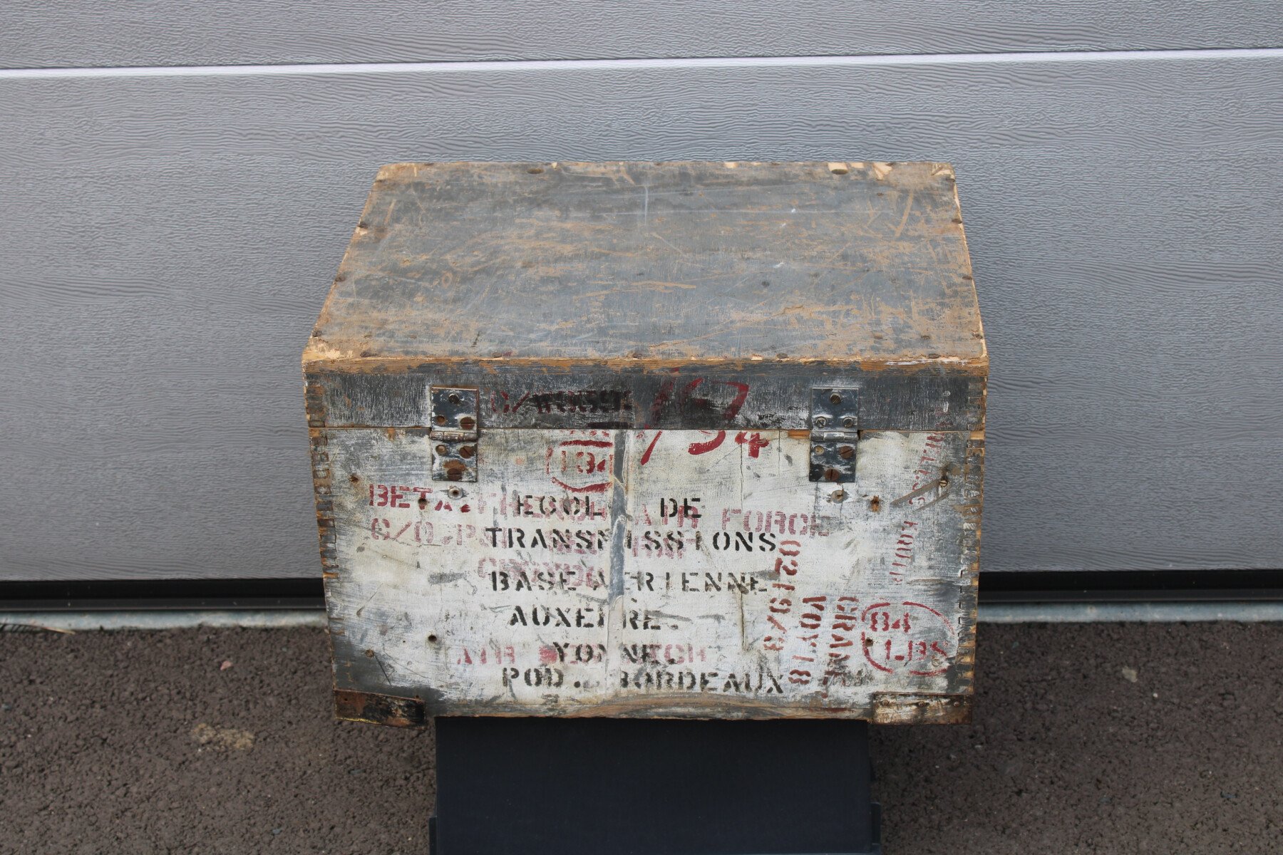 caisse en bois de conditionnement pour matériel de transmission de la Royal Air Force. Beau marquage AM pour air ministry encore présent. réutilisation par l'armée de l'air française (...
