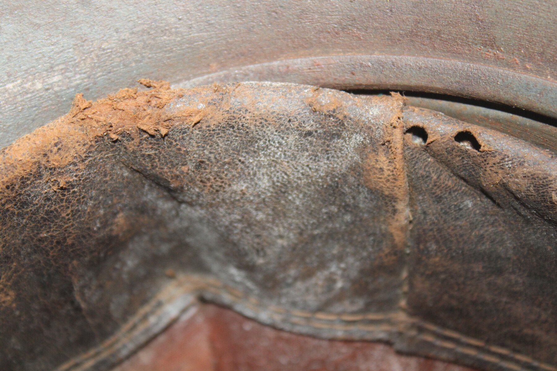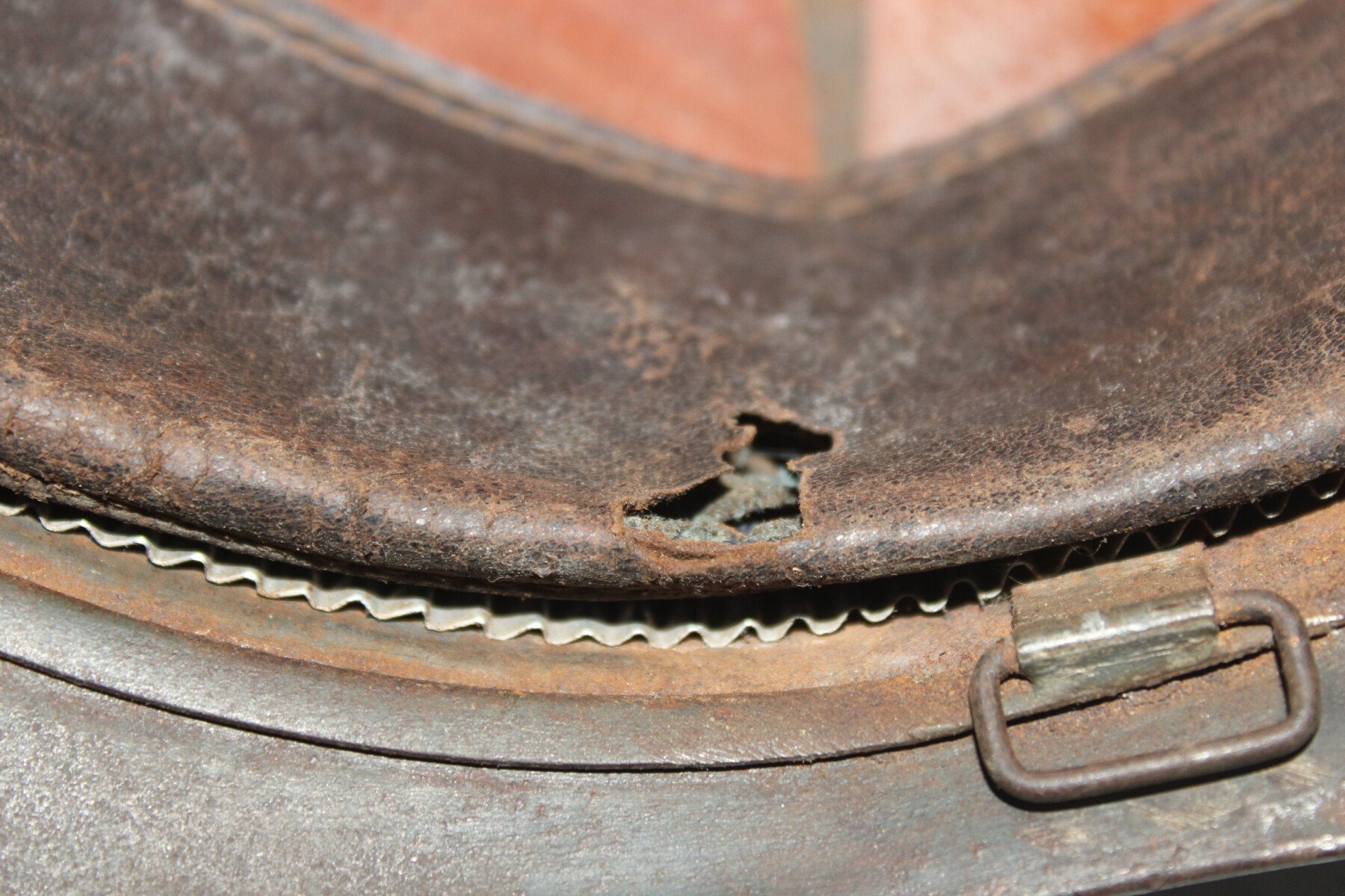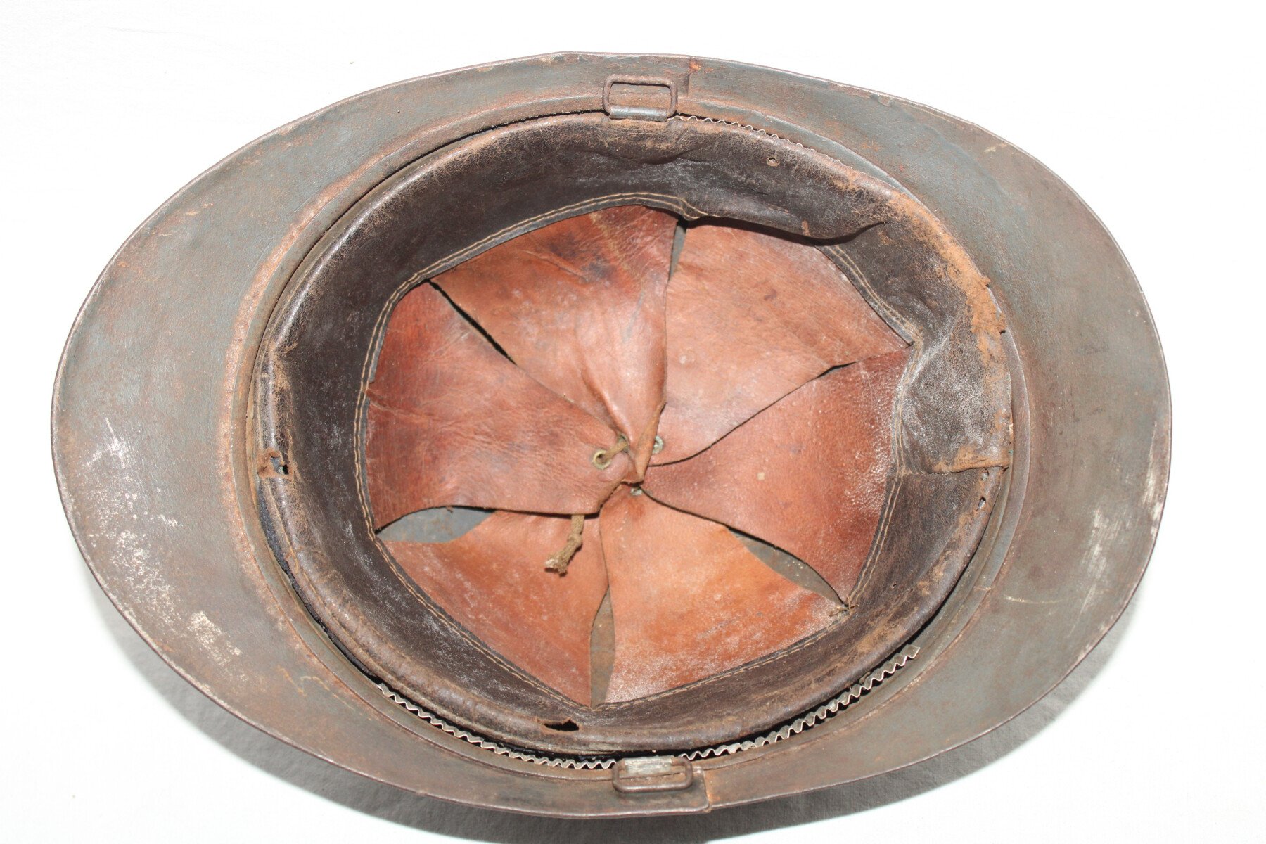 Casque Adrian modèle 15 sans attribut. Peinture bleu. Cuir intérieur du deuxième type de couleur fauve. Coque A3.