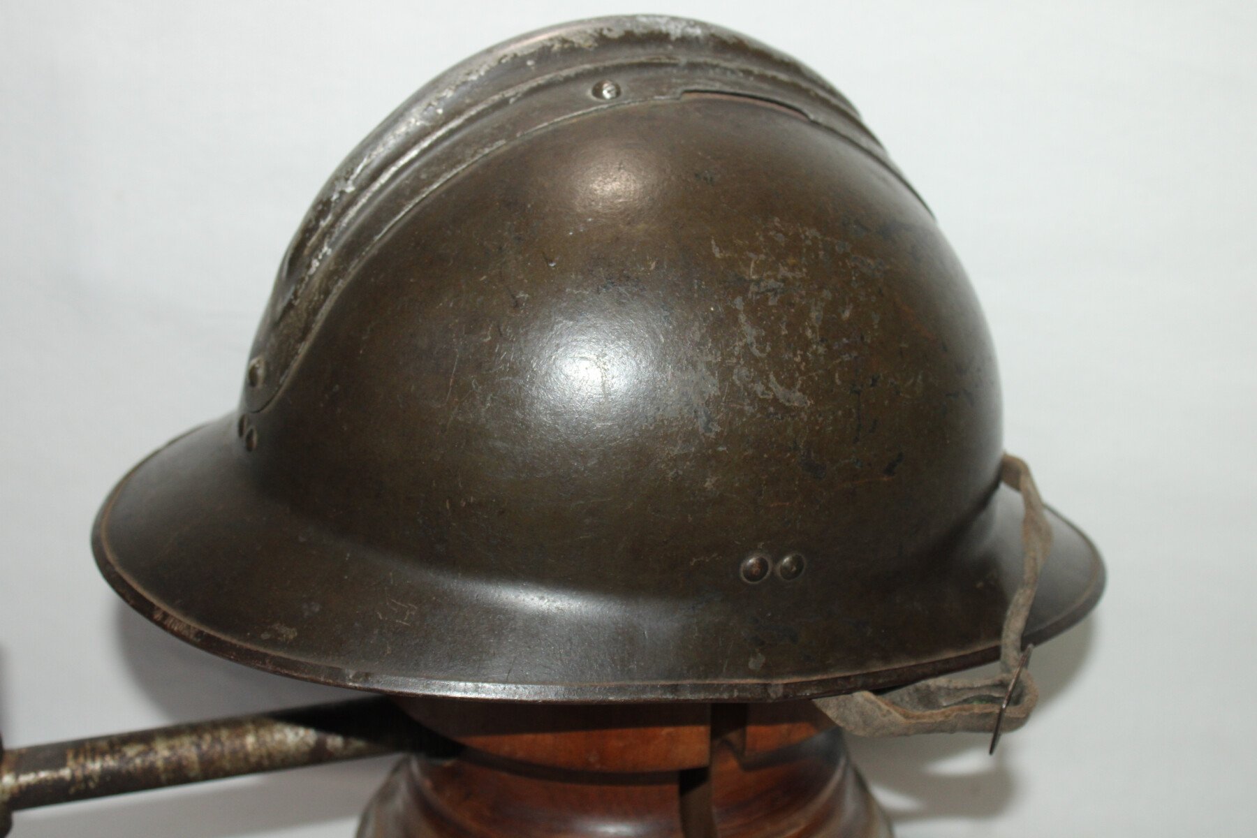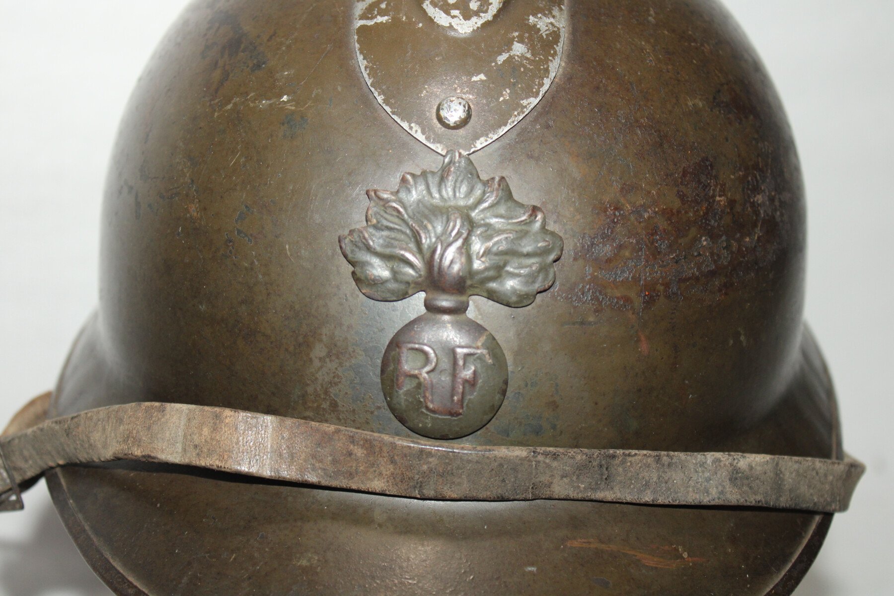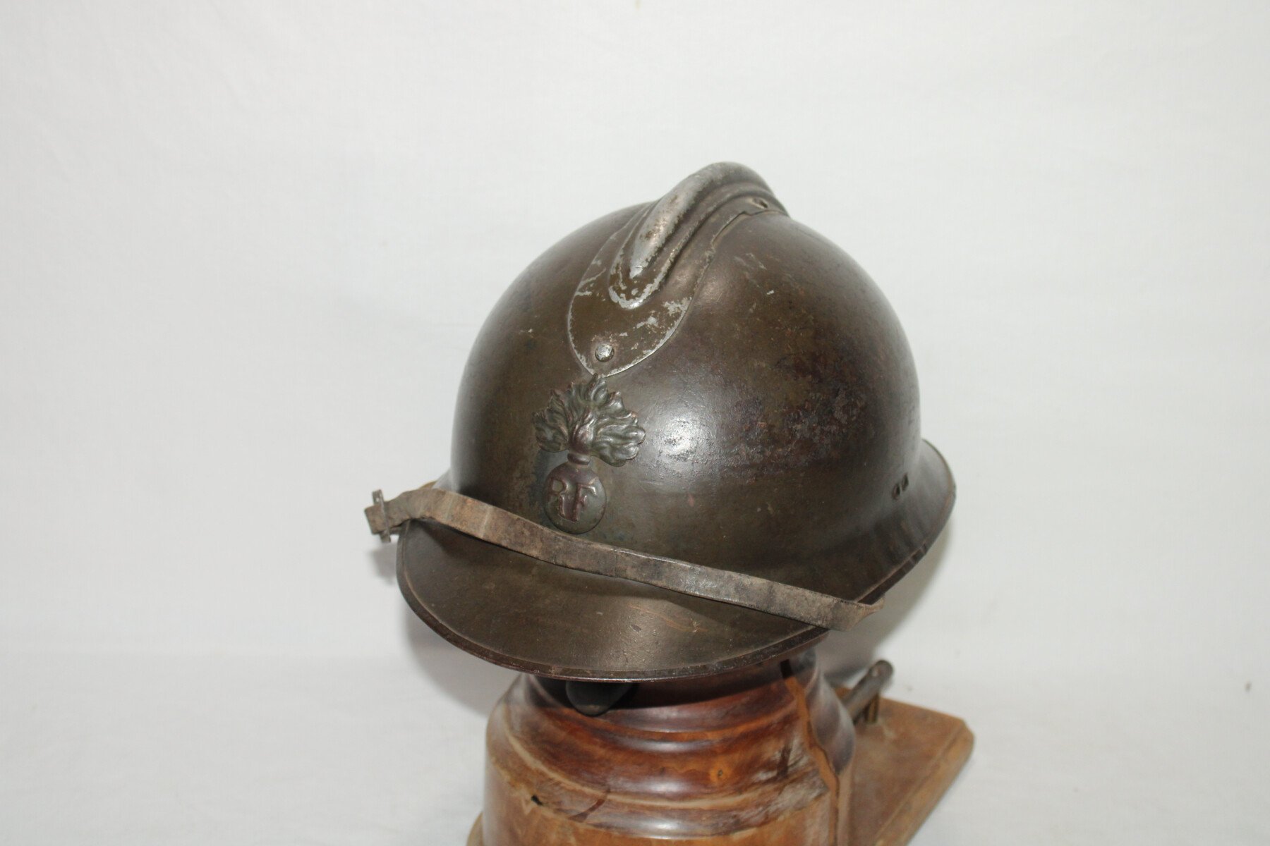 Casque Adrian modèle 1926 avec attribut modèle 15 de l'infanterie, trace d'un insigne sante 15. Cuir intérieur en bon état, de couleur noir en taille 55-56, plusieurs agrafe absente ou décousus. Coque taille C daté 1938. Jugulaire présente.