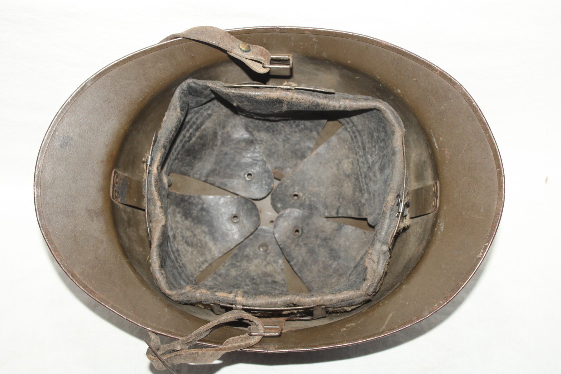Casque Adrian modèle 1926 avec attribut modèle 15 de l'infanterie, trace d'un insigne sante 15. Cuir intérieur en bon état, de couleur noir en taille 55-56, plusieurs agrafe absente ou décousus....