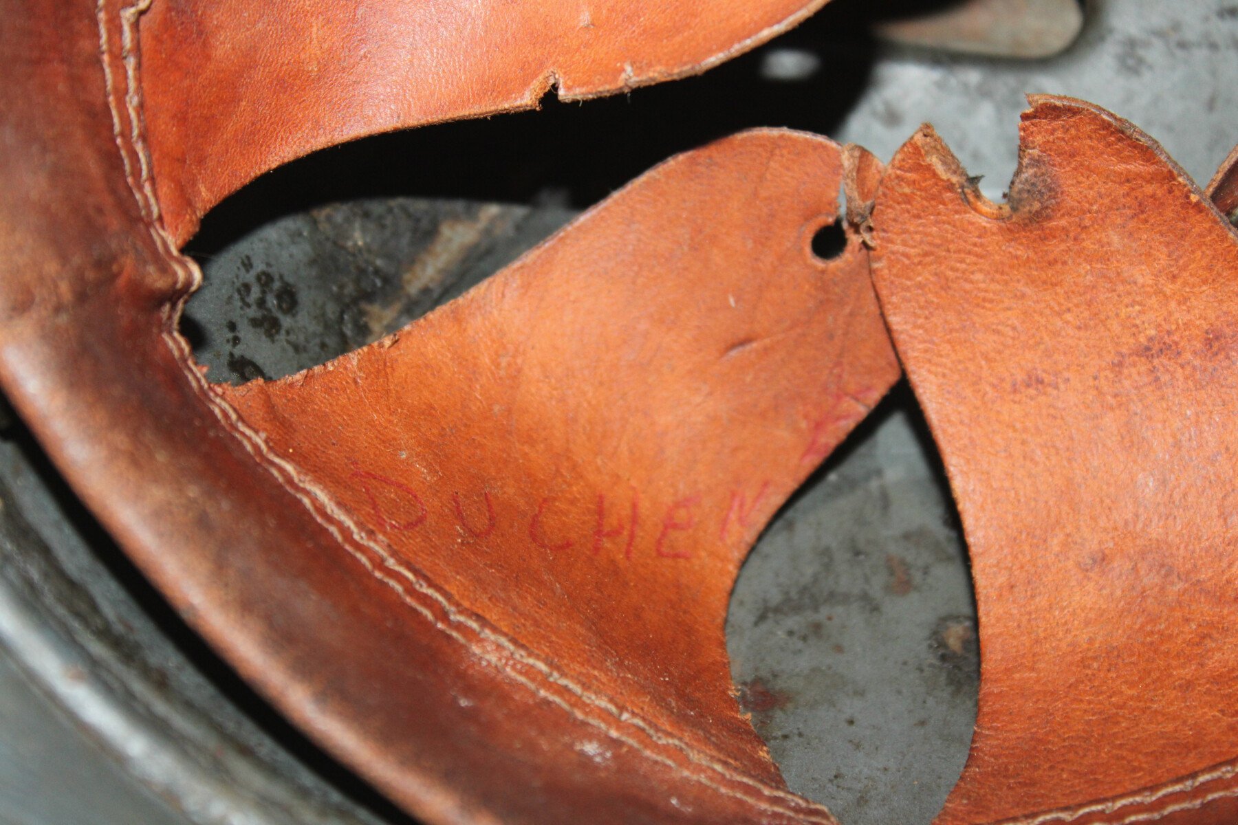 Casque Adrian modèle 15 avec attribut modèle 15 de l'artillerie. Peinture bleu faite à la main. Cuir intérieur du deuxième type en bon état de couleur fauve en taille 56, 2 dents légèrement abimées. Une jugulaire modèle 26 monté. Un nom et marqués sur l'intérieur.