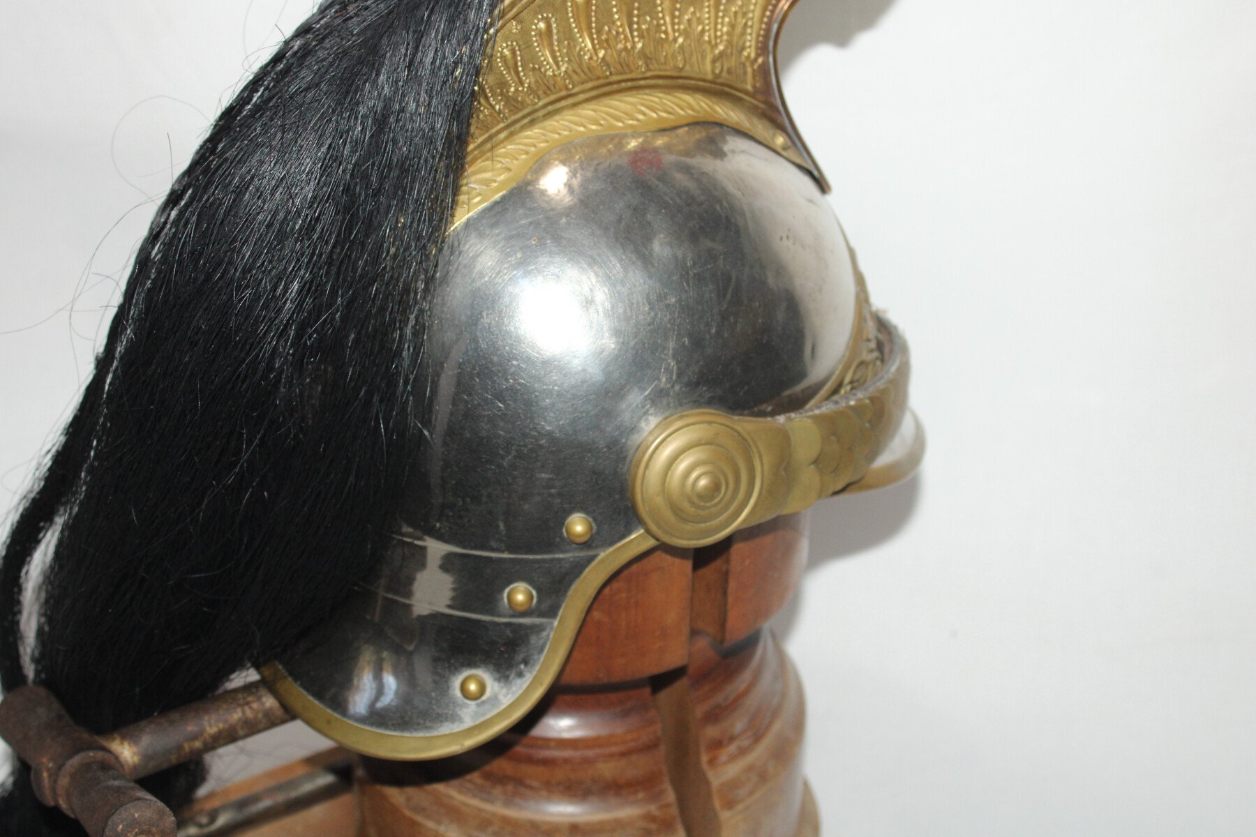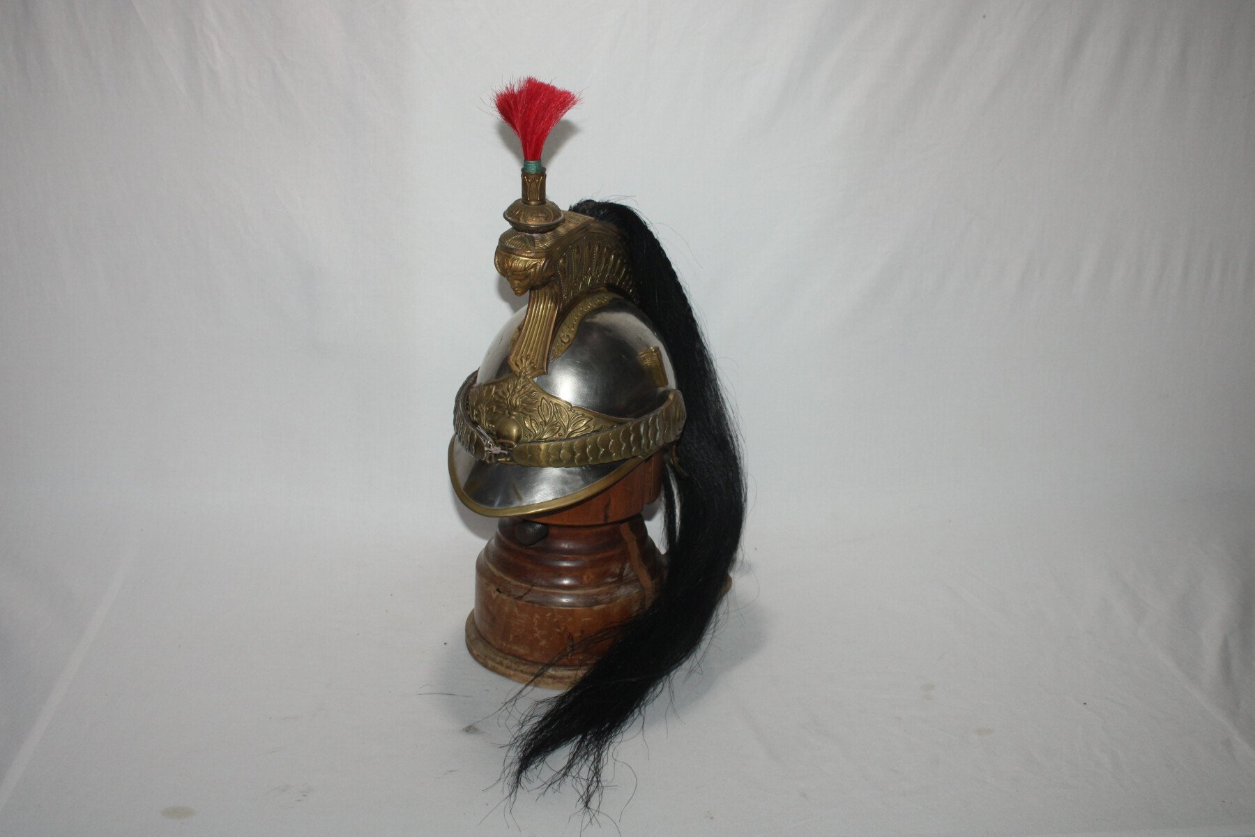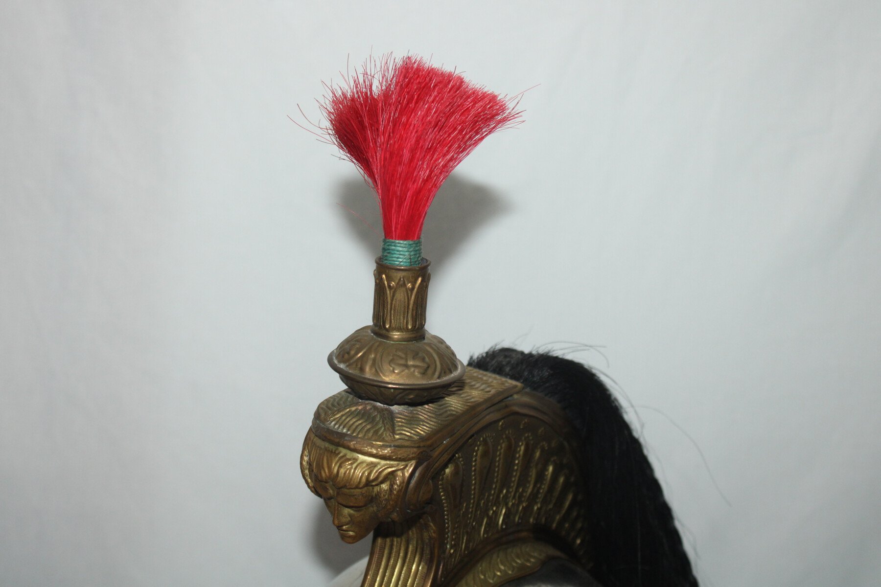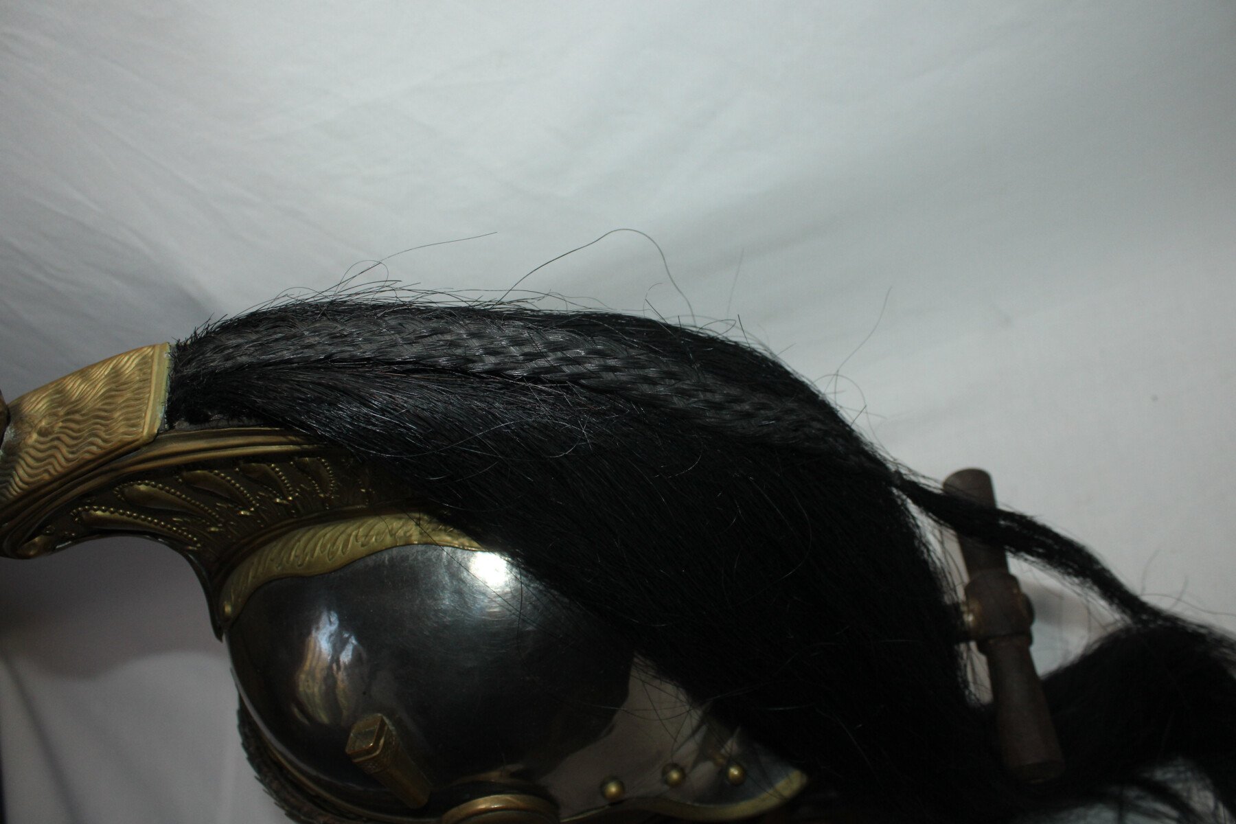 Casque modèle 1872 de cuirassier. Attache de jugulaire absente. Plumet rouge non d'origine. Taille 56-57 environs. Intérieur présent. Crinière présente.