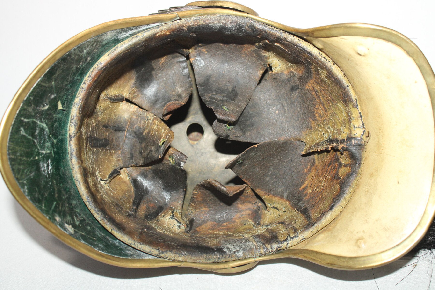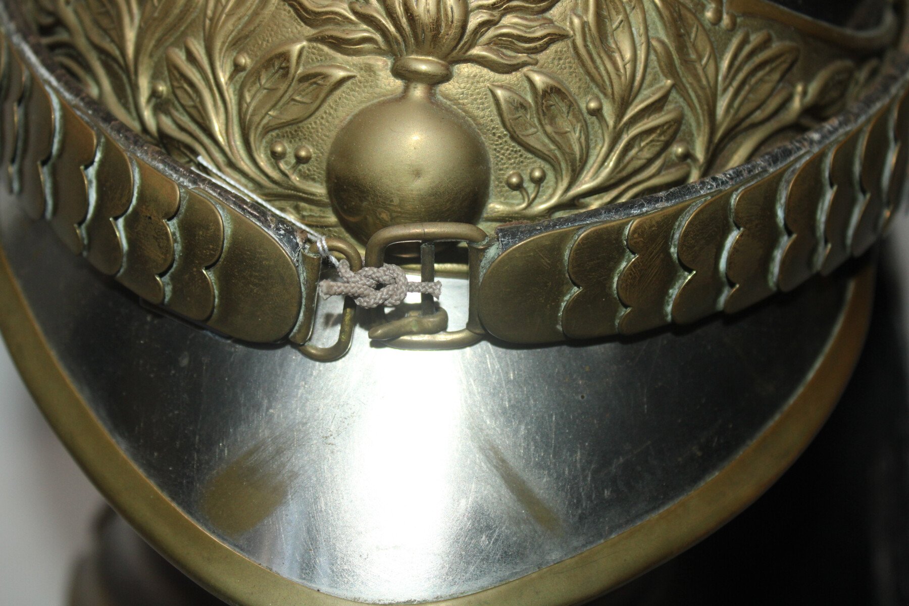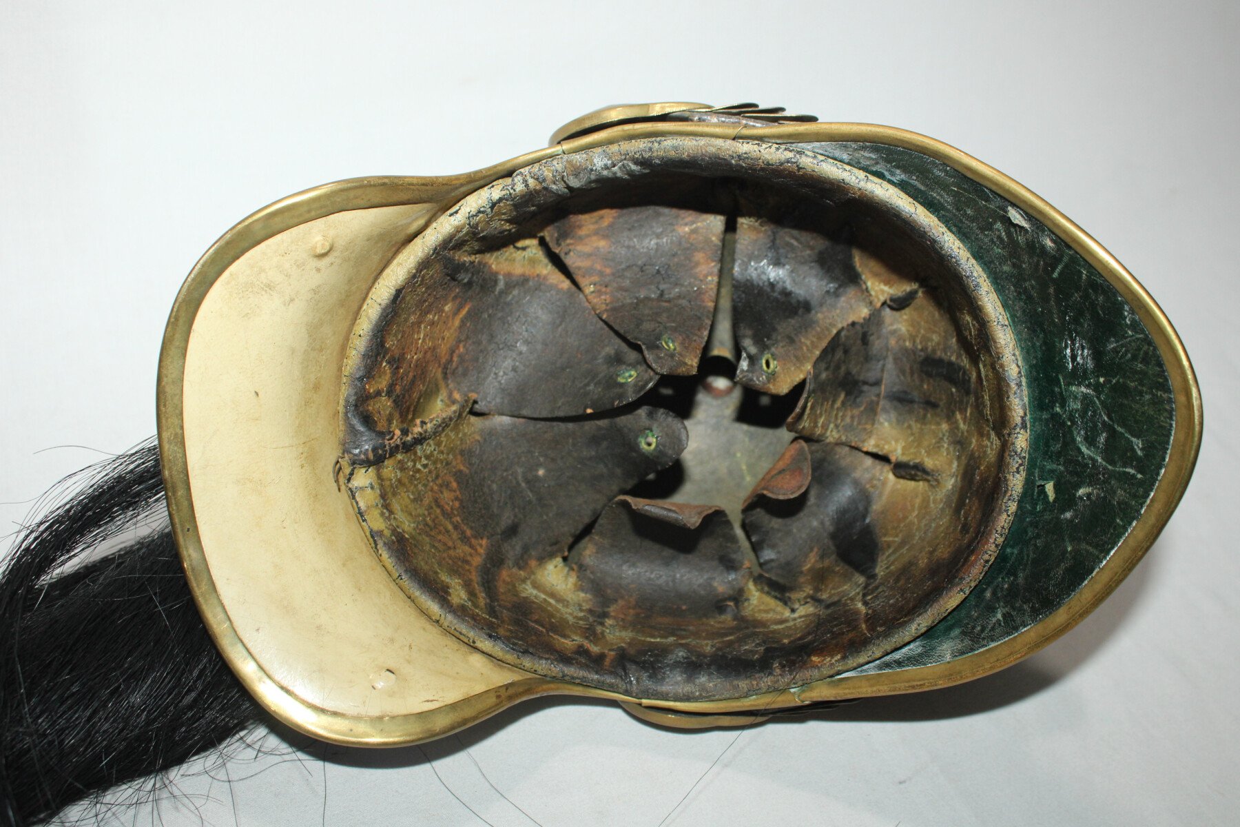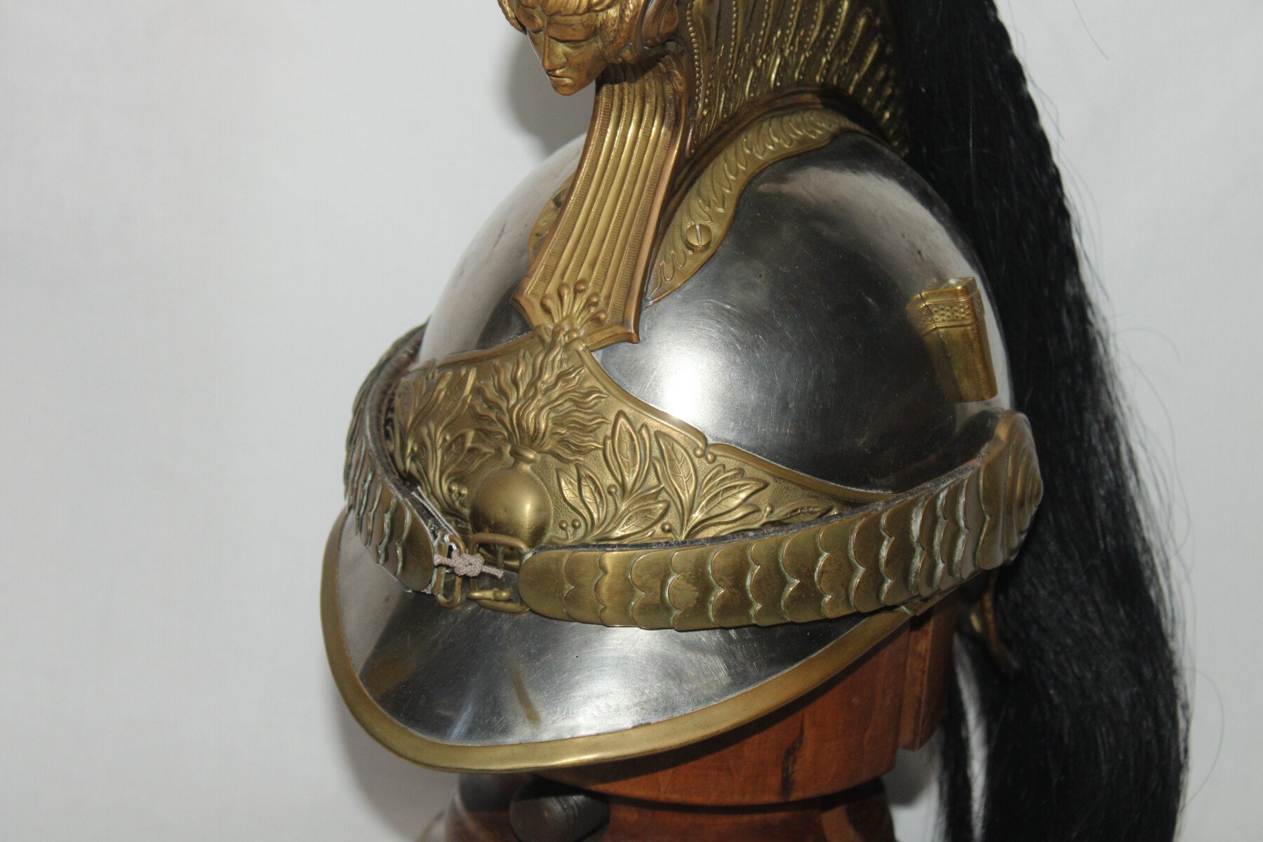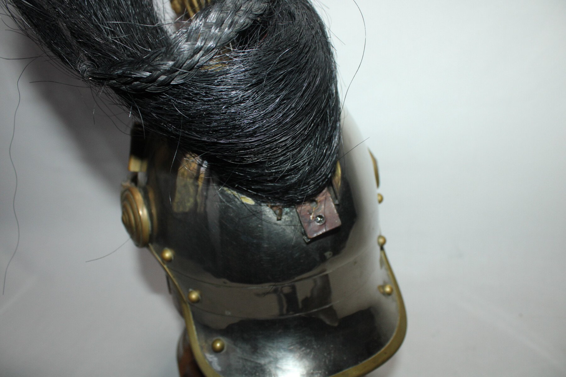 Casque modèle 1872 de cuirassier. Attache de jugulaire absente. Plumet rouge non d'origine. Taille 56-57 environs. Intérieur présent. Crinière présente.