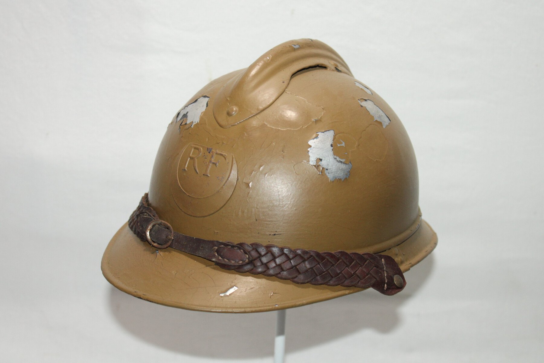 Casque Adrian du commerce en aluminium pour officiers avec attribut modèle 15 des troupes d'Afrique. Peinture moutarde. Jugulaire officier tressée. Intérieur à 9 dents. Peinture très fragiles,...