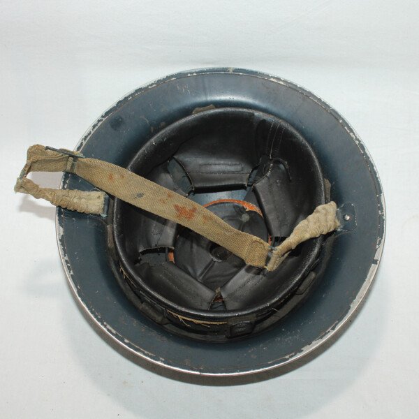Beau casque Mark II fabrication ROCo. La peinture d'origine est bleu satiné de la civil police repeinte en blanc crème au pinceau. Coque daté 1939. Intérieur 1er type fabrication VERO 1938, taille...