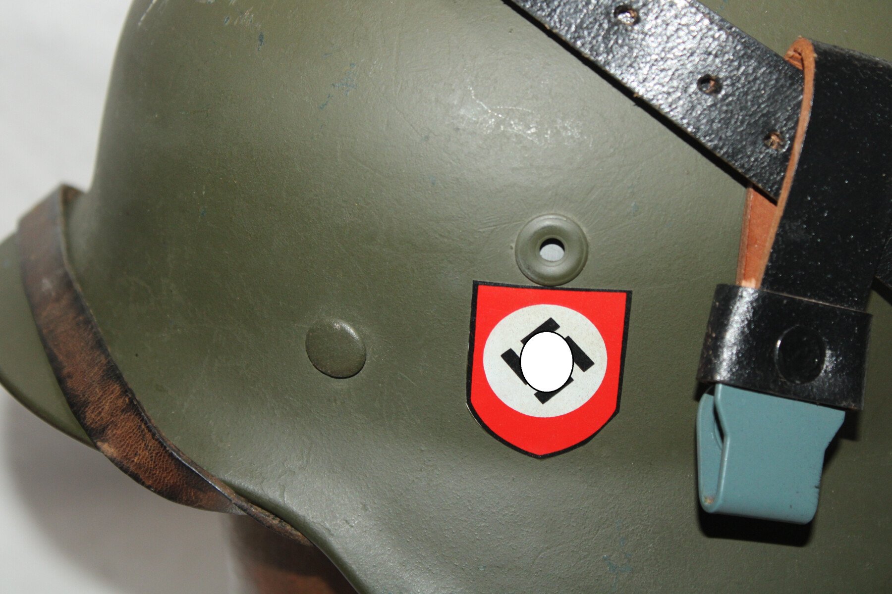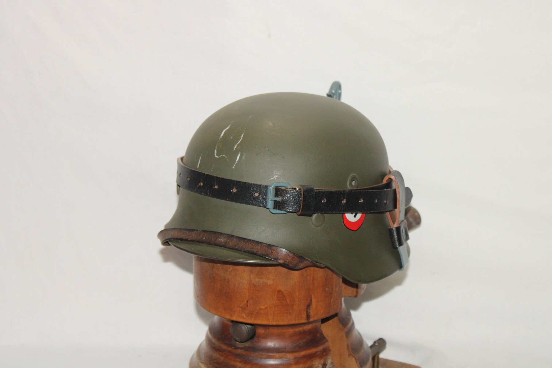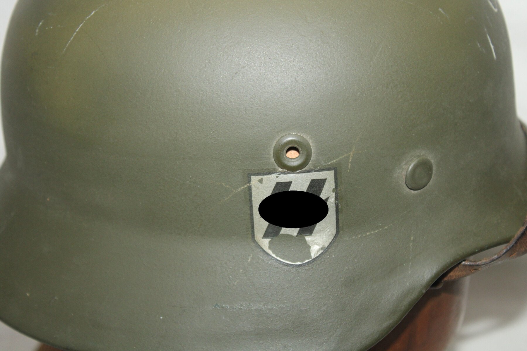Casque modèle 35 aux couleurs de la waffen-SS. Le tout et en reproduction. Eclats sur le décalcomanie SS. Un porte casque vendu avec. Intérieur taille 57-61.