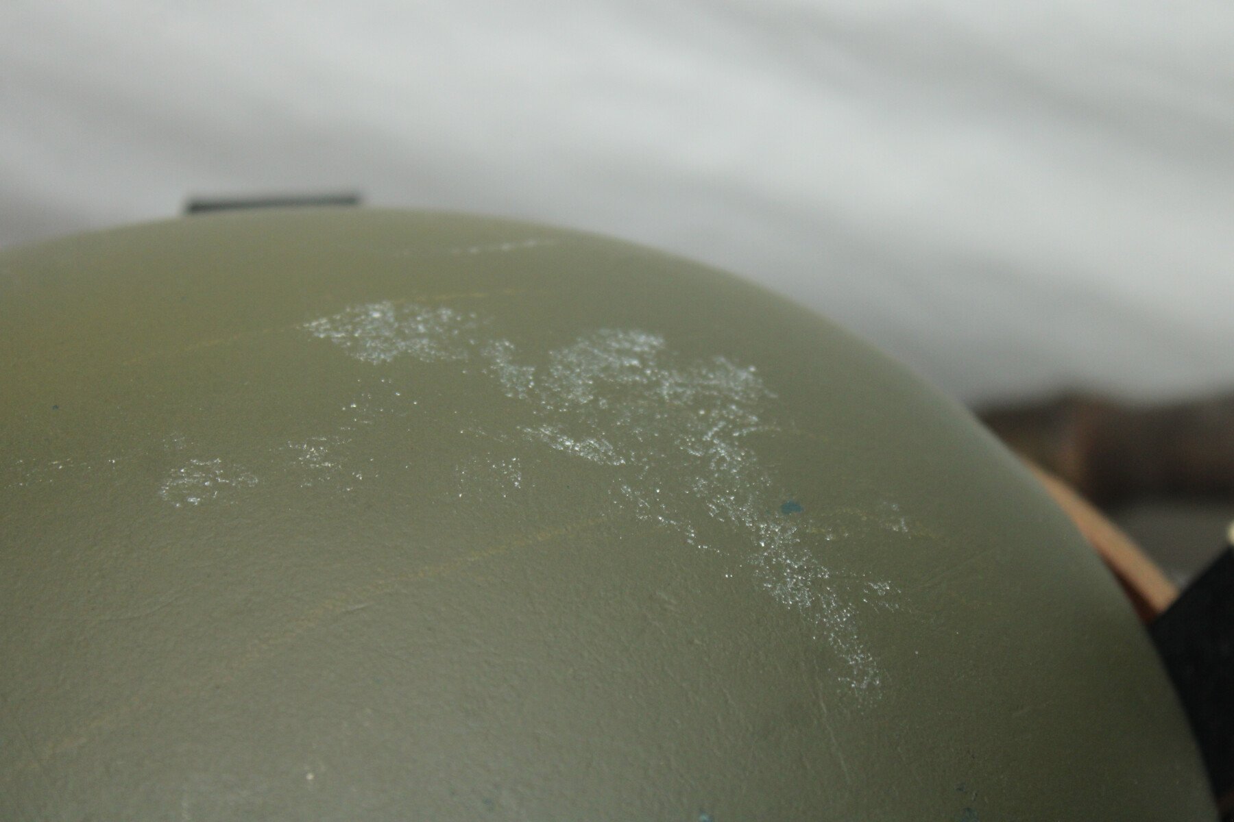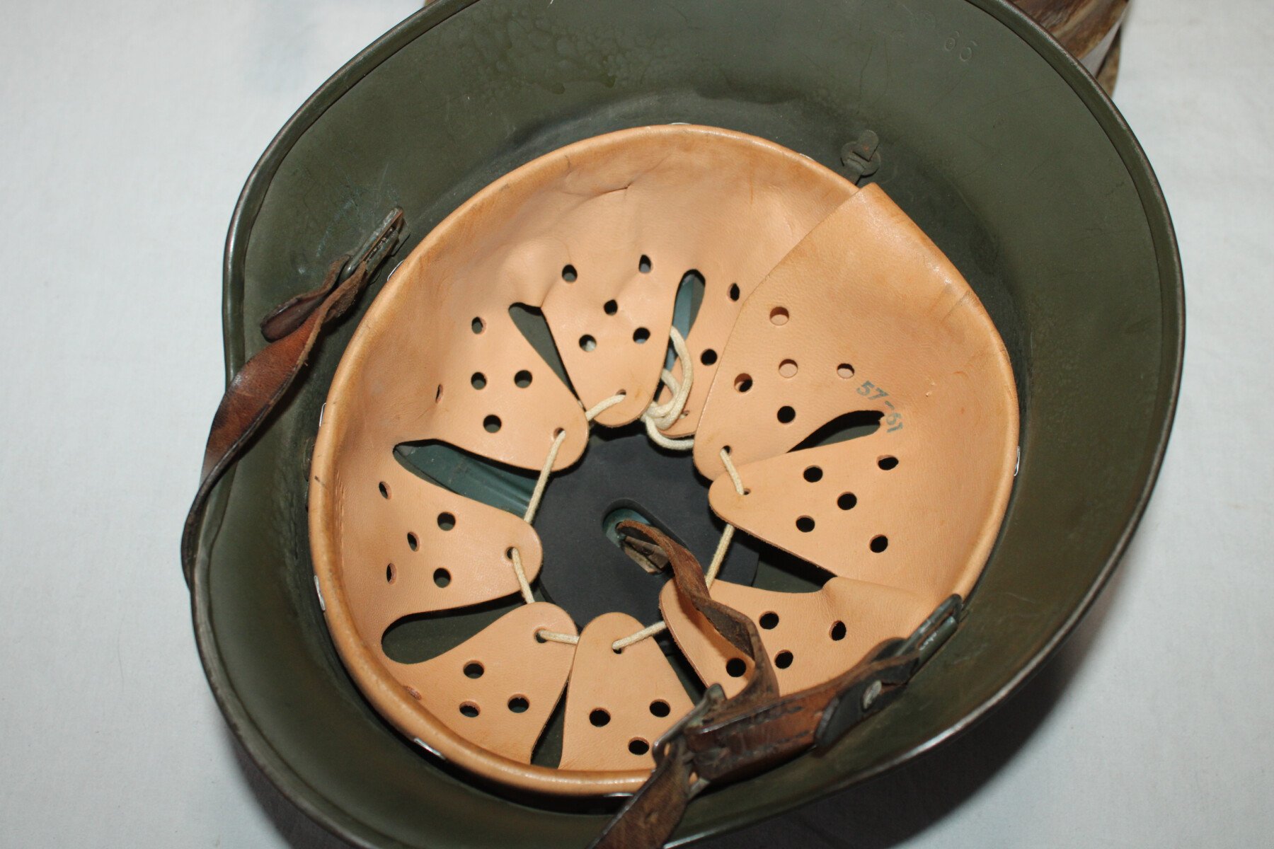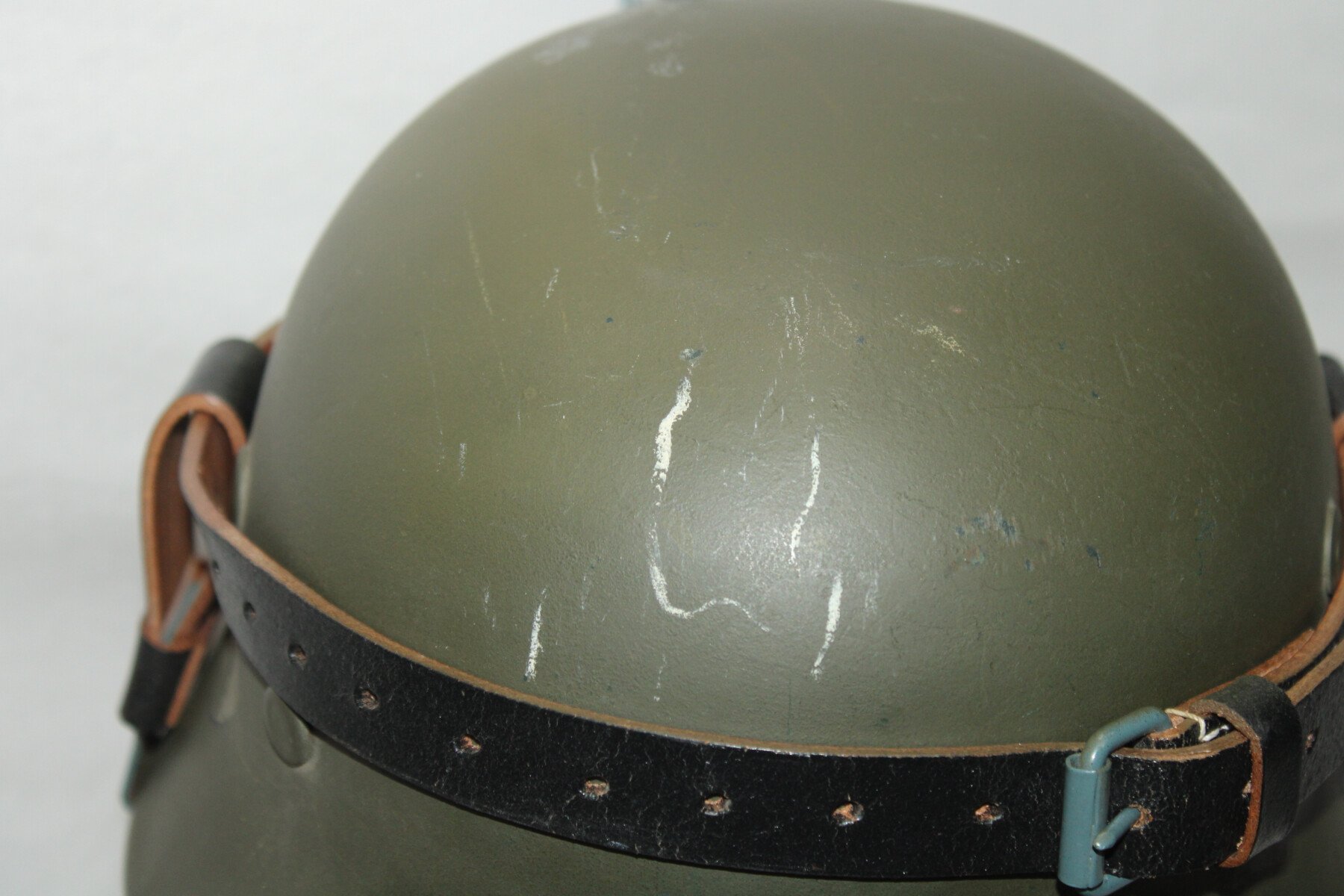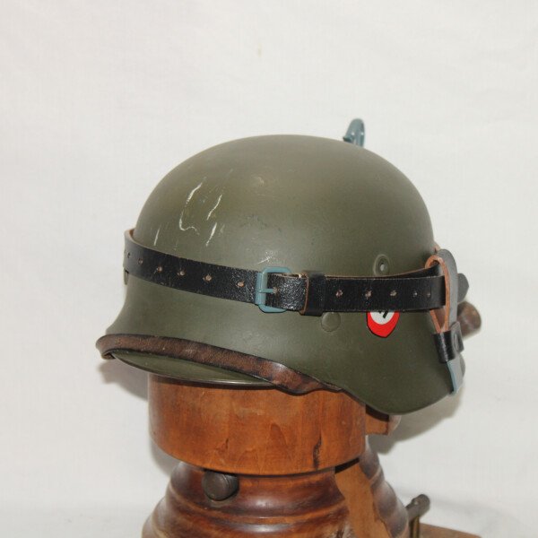 Casque modèle 35 aux couleurs de la waffen-SS. Le tout et en reproduction. Eclats sur le décalcomanie SS. Un porte casque vendu avec. Intérieur taille 57-61.