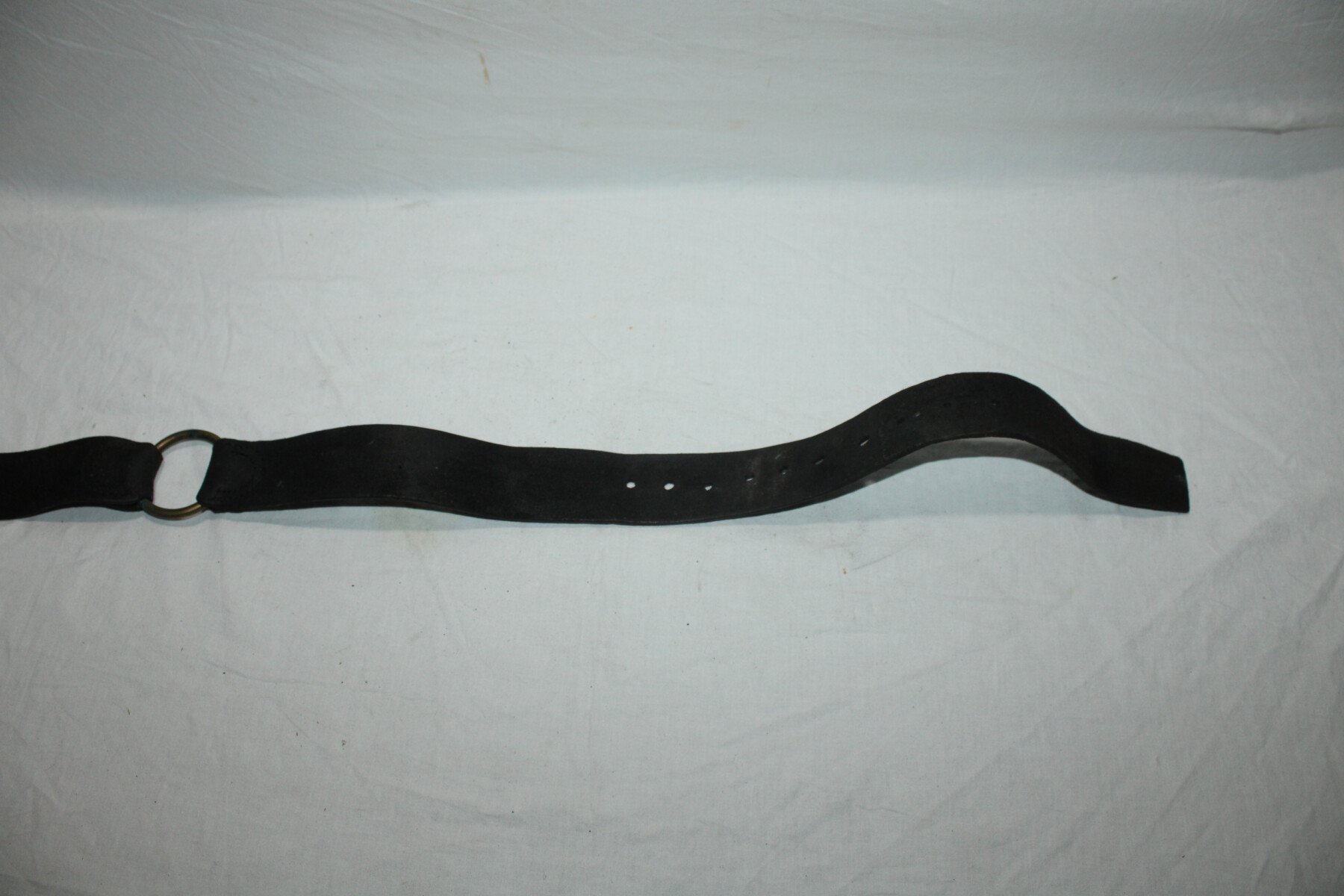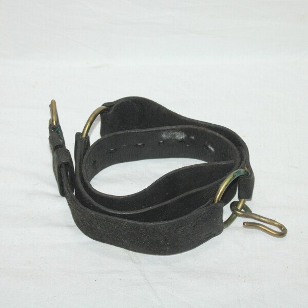 Ceinturon d'artilleur et du train des équipages modèle 1879 en cuir noir. Cuir à nourrir. Longueur 104cm. Réparation au niveau de la boucle avec du fil de fer.
