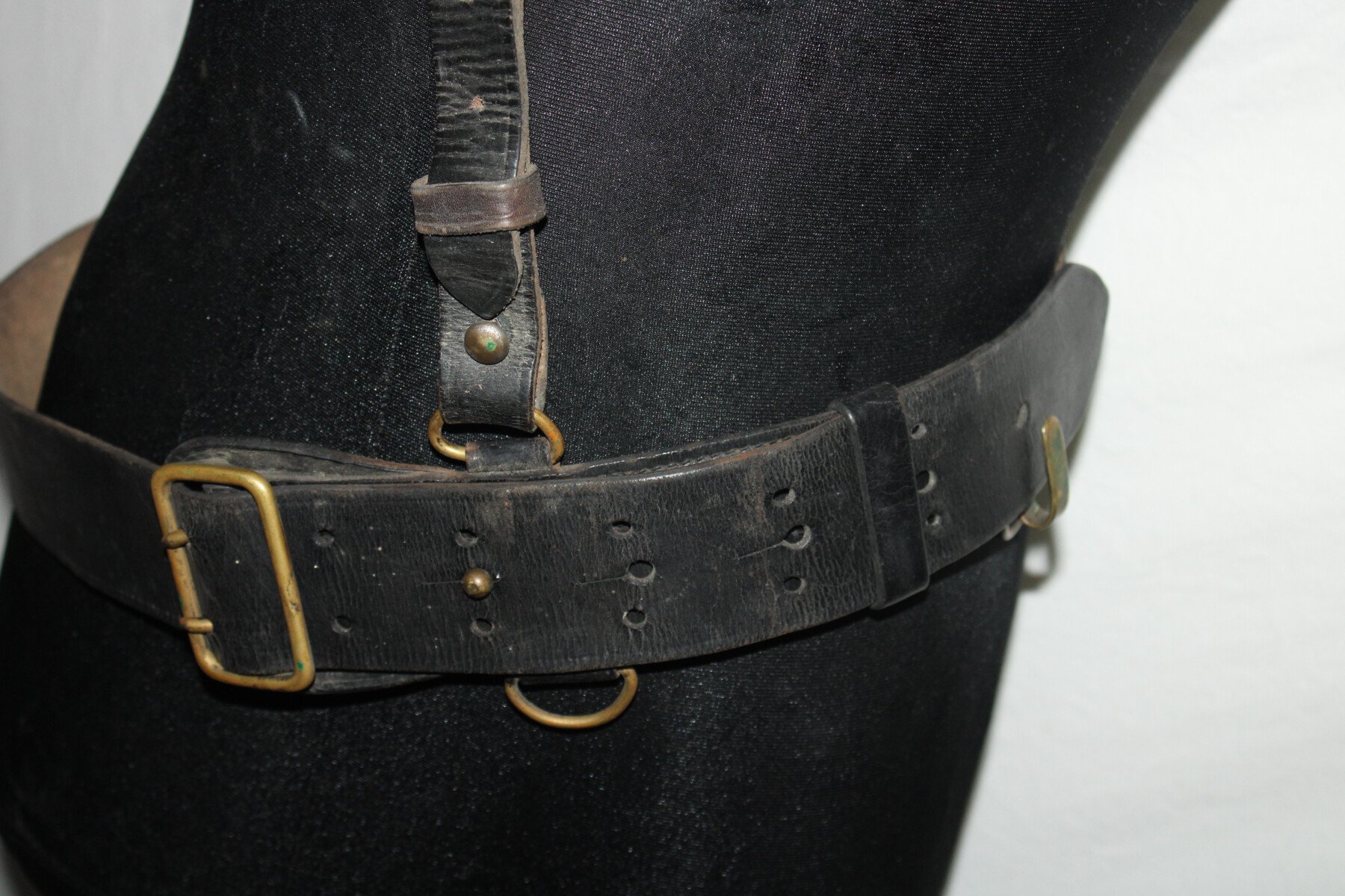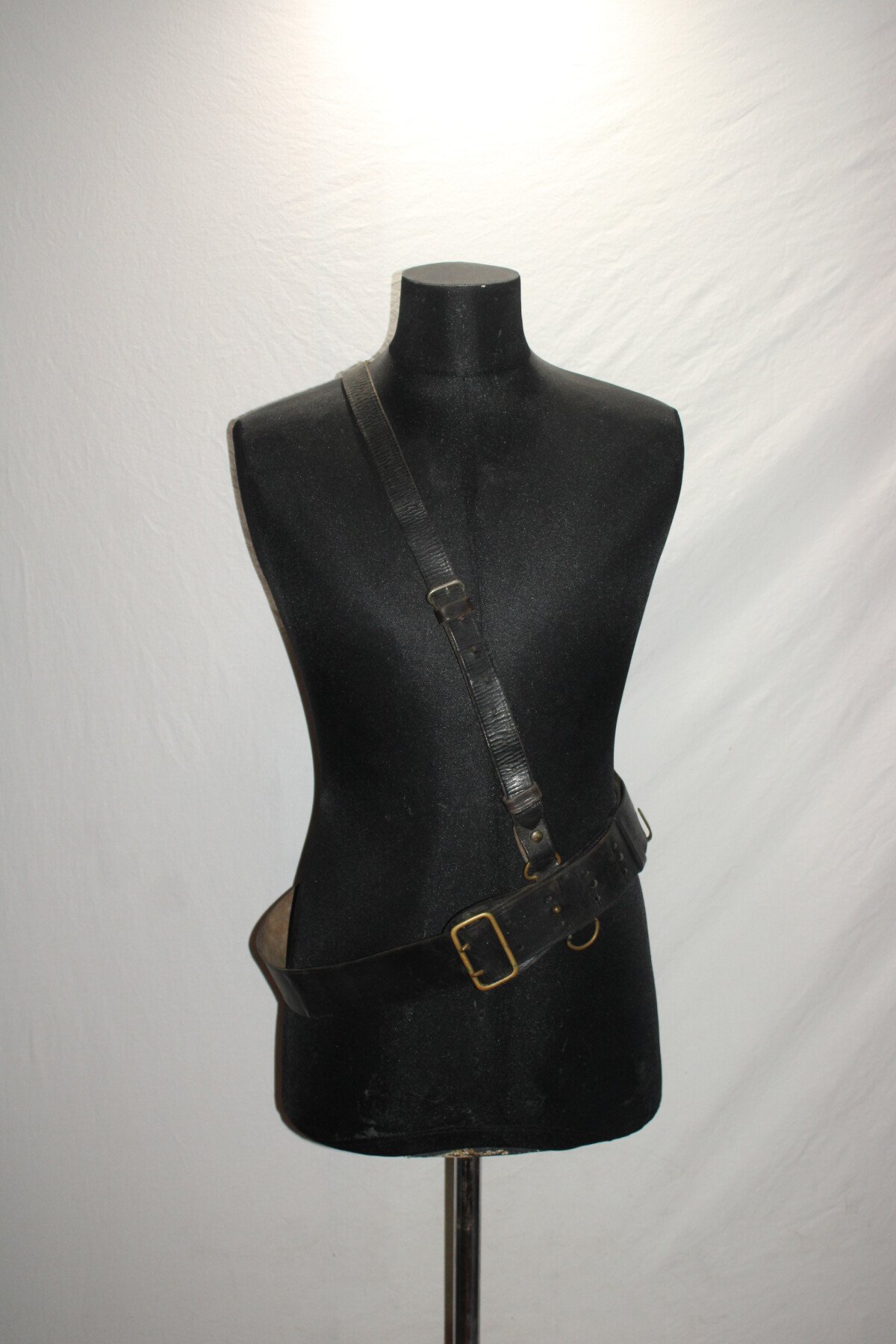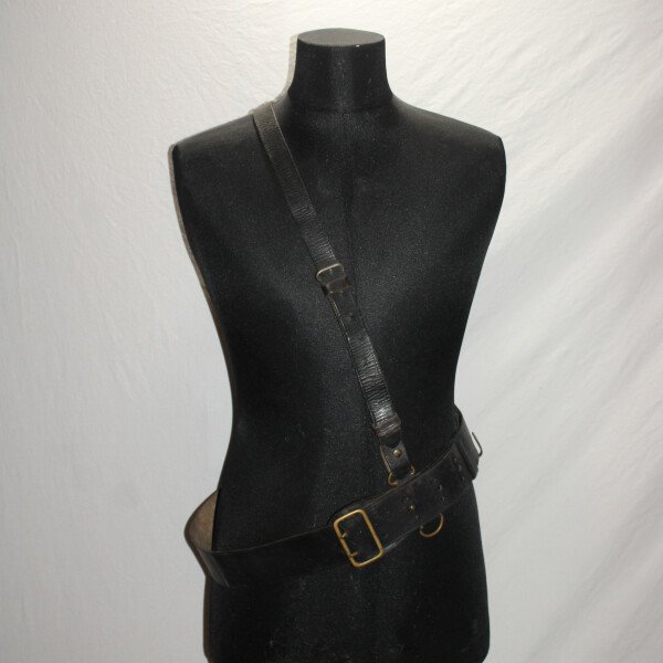 Ceinturon pour officier avec son baudrier le tout a été teinté en noir, cuir en très bon état. Une rallonge faite. Grande taille. Longueur 126cm.