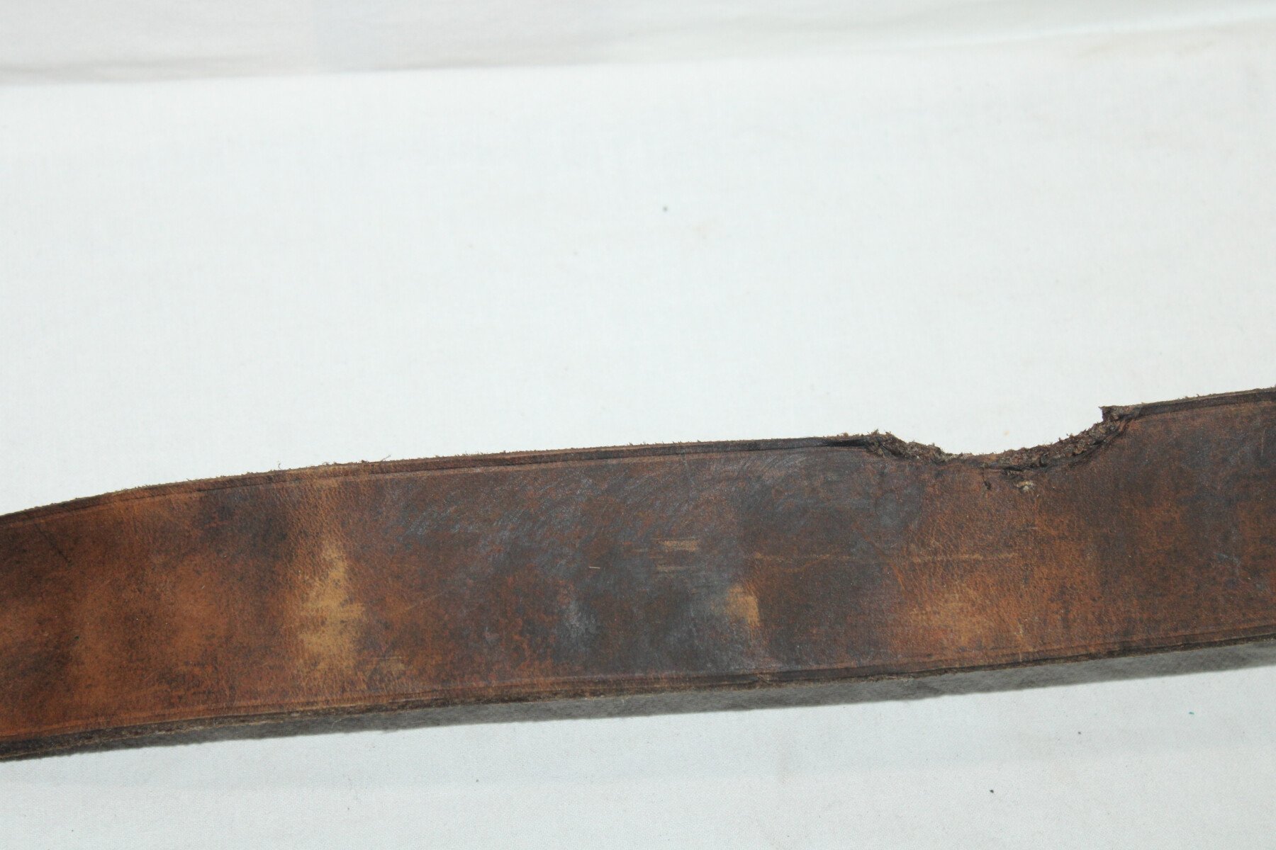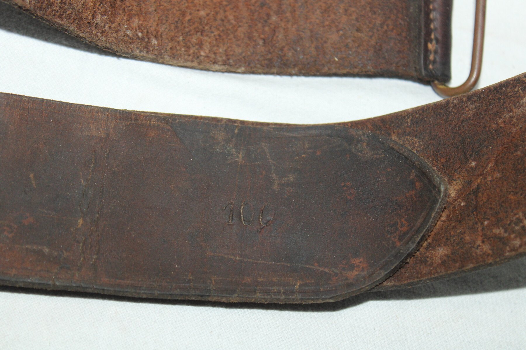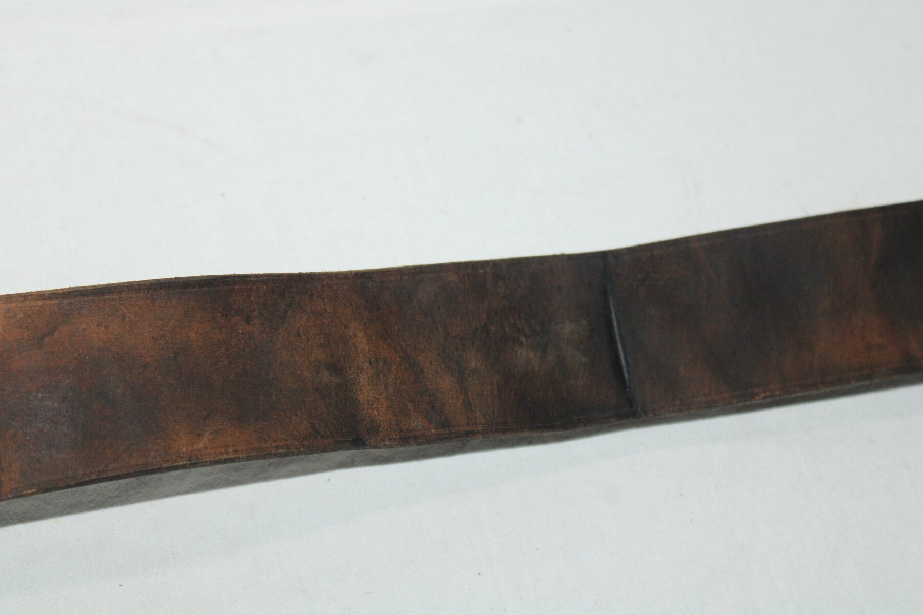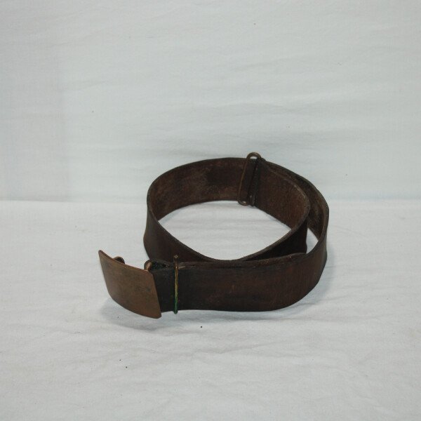 Ceinturon modèle 1845 en cuir fauve, longueur 100 cm, pas de tampon de date visible. Bon état général, légèrement abimé sur un coté. Cuir a nourrir.