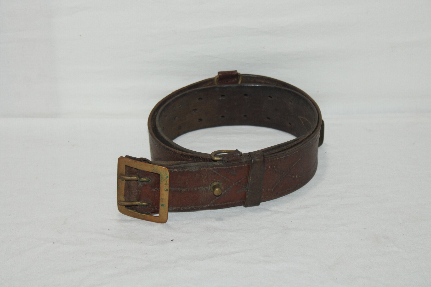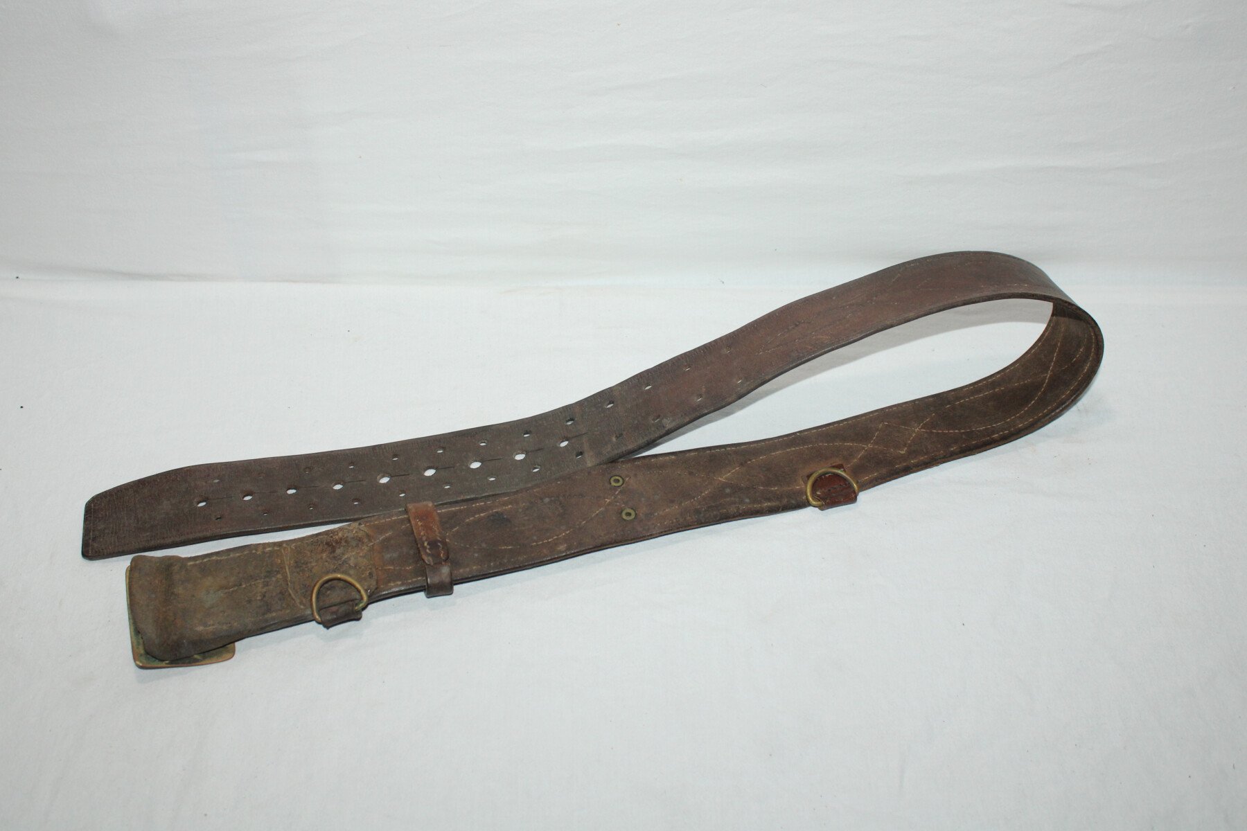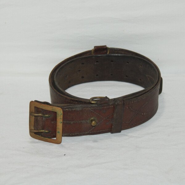 Ceinturon pour officier avec passant de bélière et crochet porte sabre. Cuir en très bon état, longueur 120 cm.