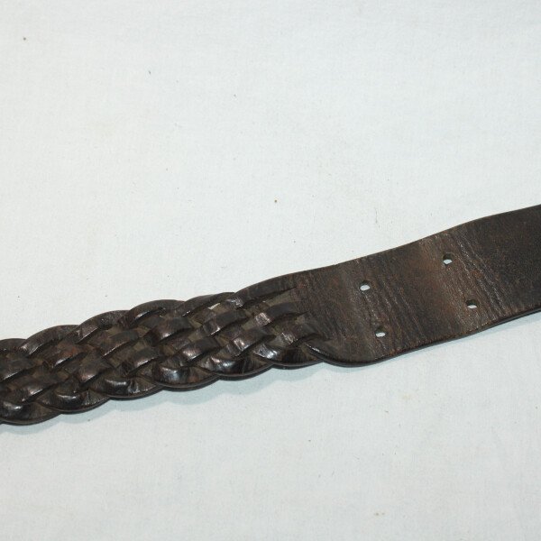 Ceinturon modèle 1903/1914 en cuir brun qui a été tressé, longueur 100cm. Un mousqueton type gourde allemande a été ajouté avec une bélière ( utilisation combat de 40?, maquis ?). Cuir bien souple.