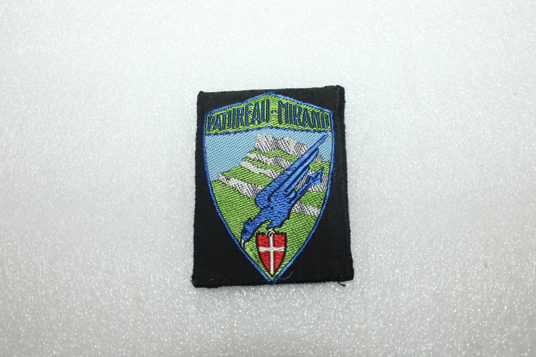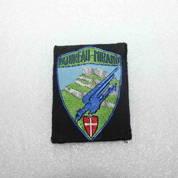Insigne du centre Patureau Mirand de l'organisation Jeunesse et montagne. Fabrication tissés, monté sur drap noir.