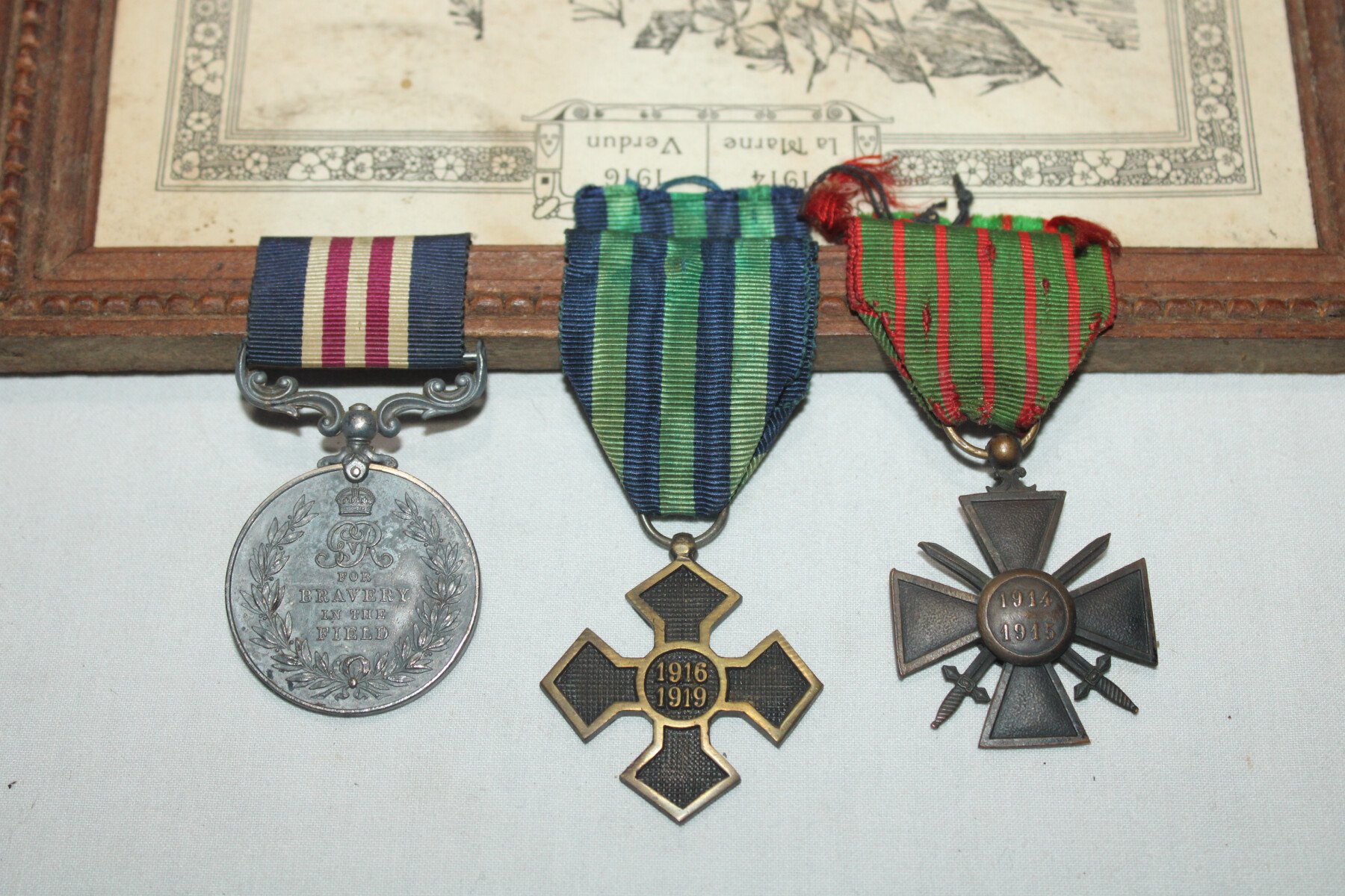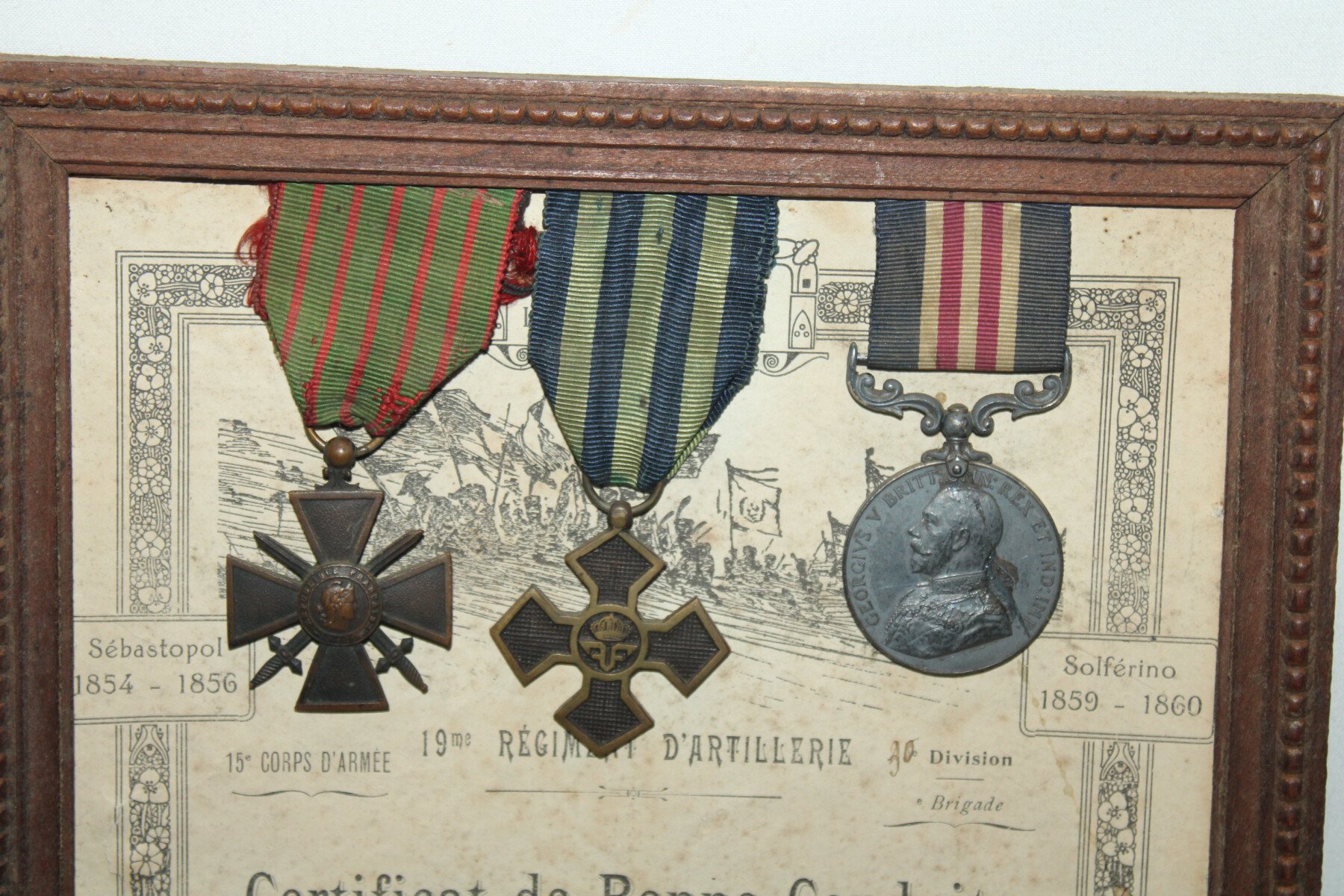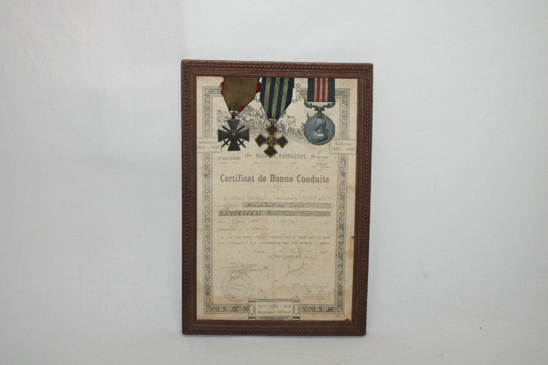 Certificat de bonne conduite signé du 19e Régiment D'artillerie. Y sont fixé 3 médailles reçu par le propriétaire: une croix de guerre 1914/1915, une médaille commémorative Roumaine 1916-1919 et une médaille anglaise Military Medal George V en argent. Ensemble Intouchés.
