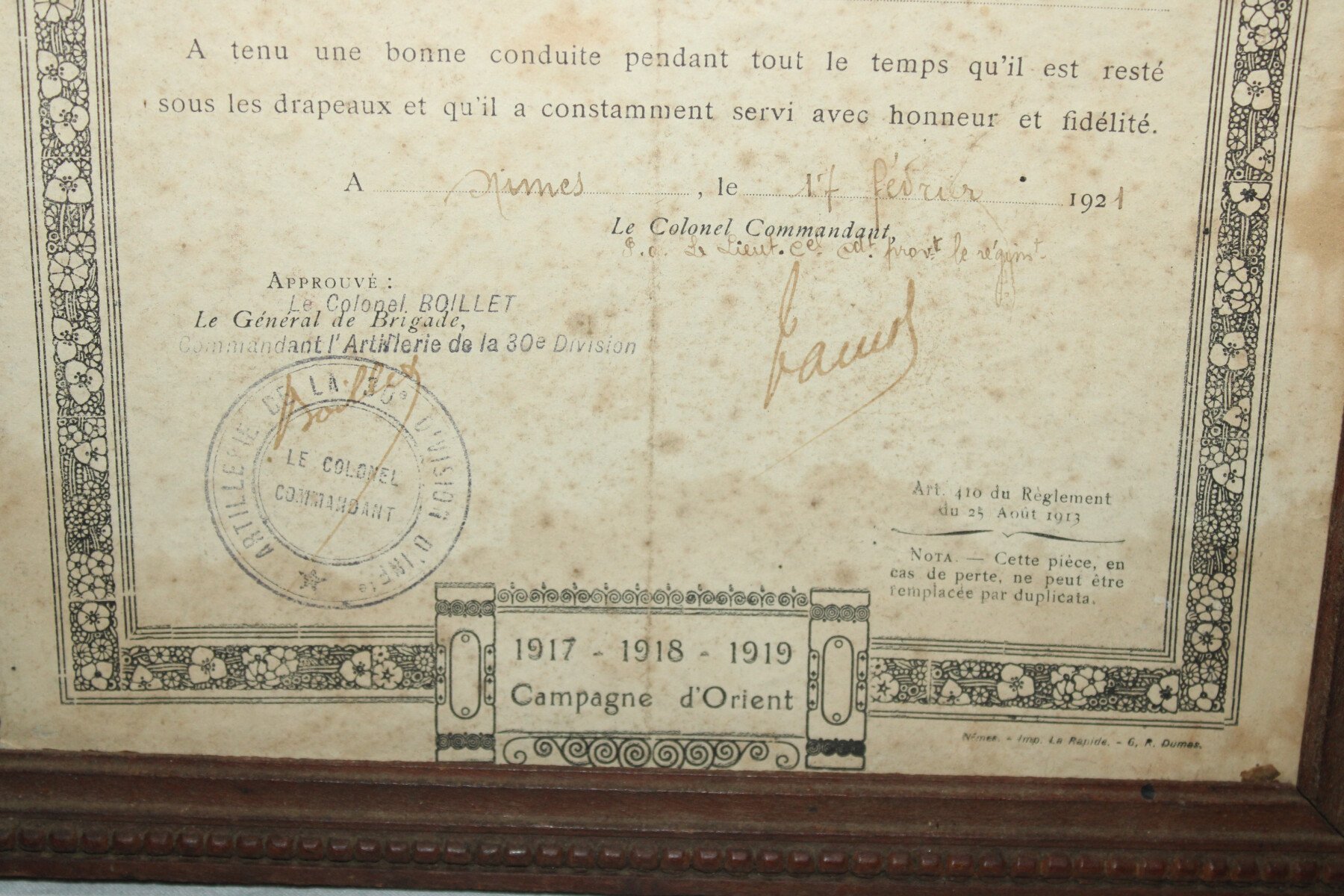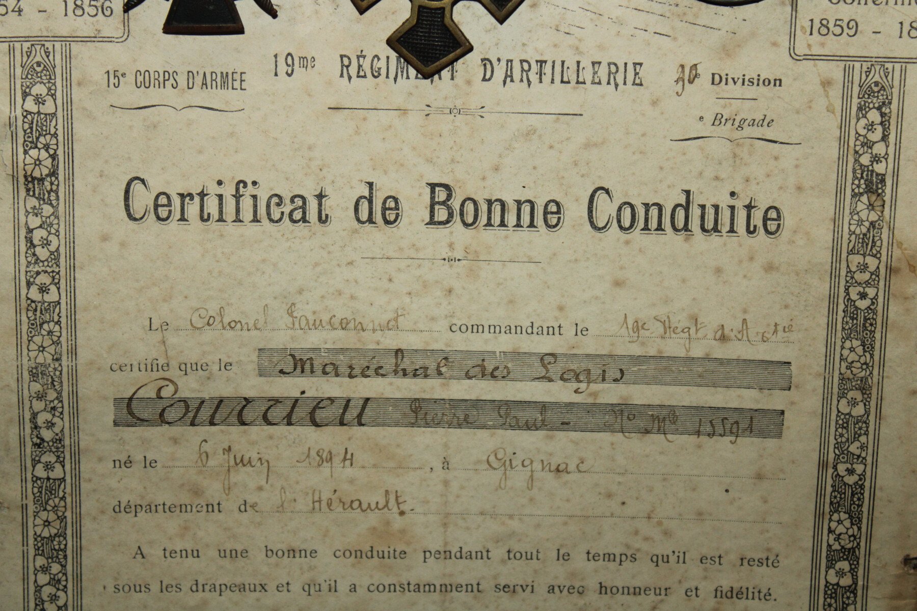 Certificat de bonne conduite signé du 19e Régiment D'artillerie. Y sont fixé 3 médailles reçu par le propriétaire: une croix de guerre 1914/1915, une médaille commémorative Roumaine 1916-1919...
