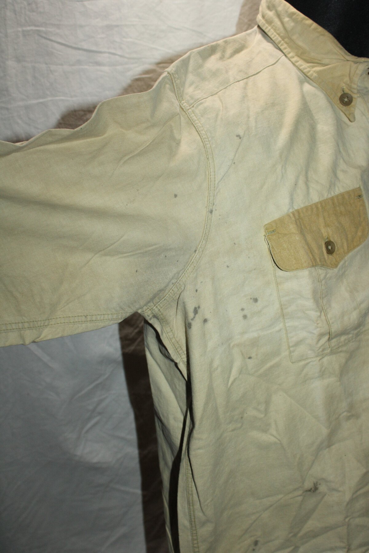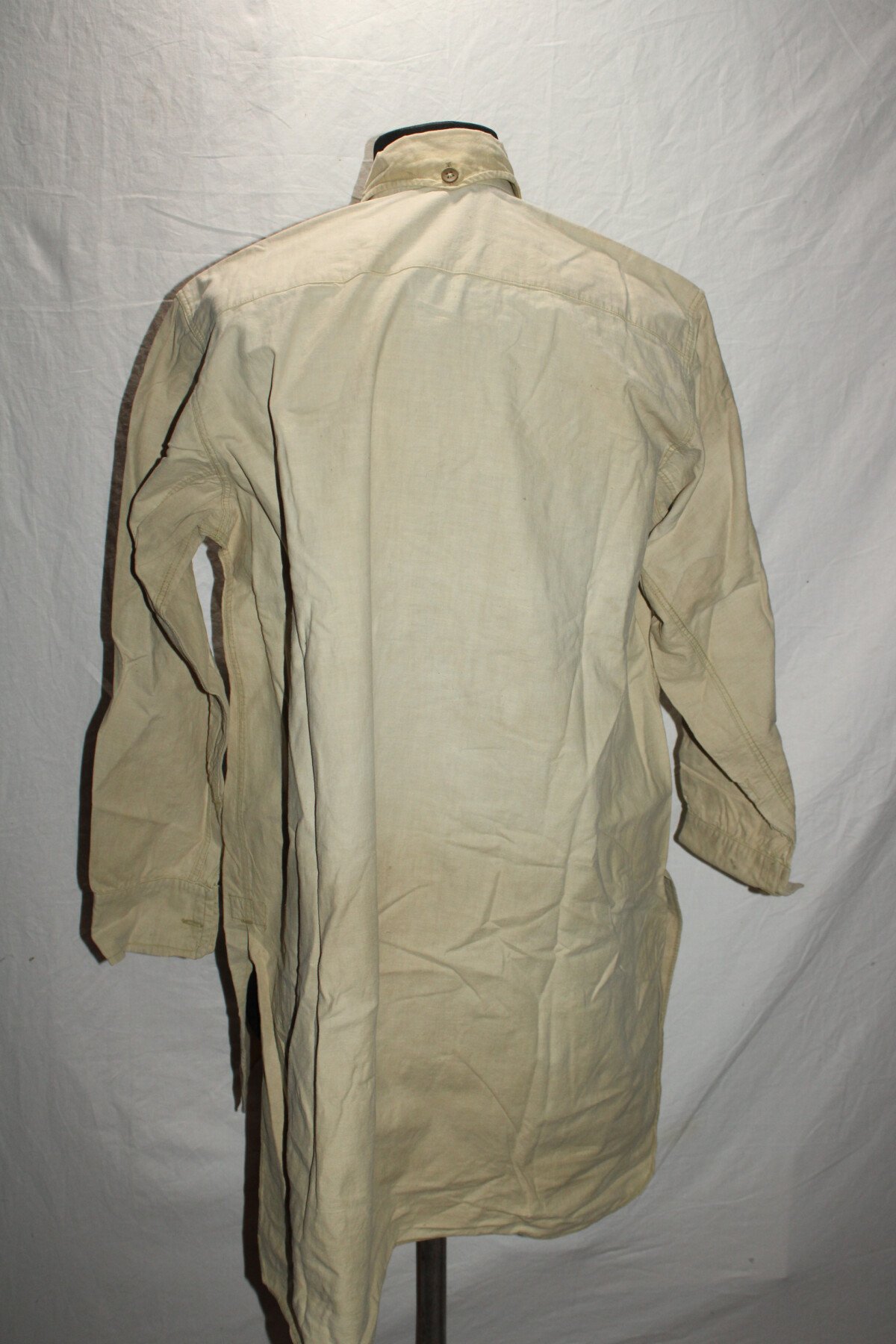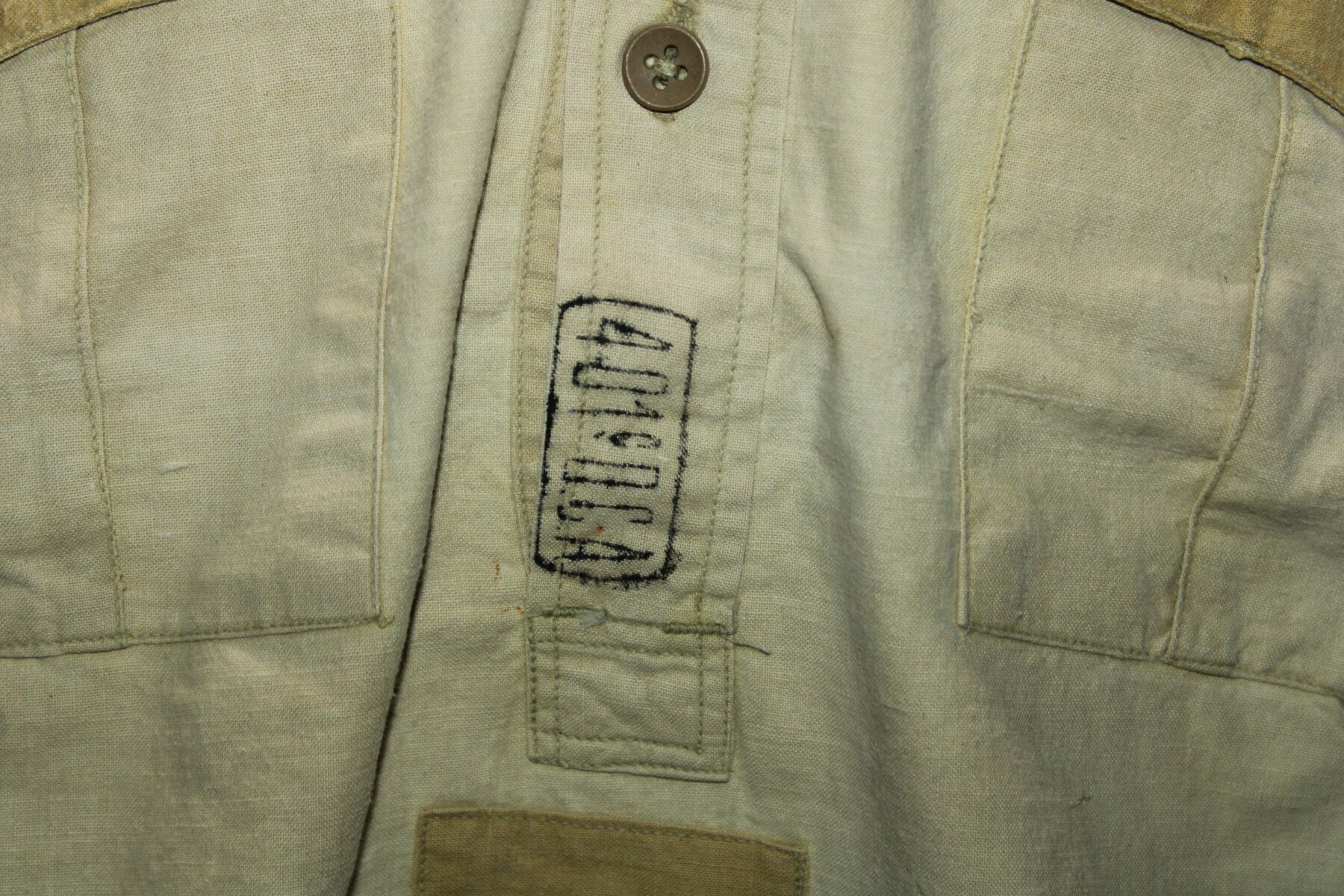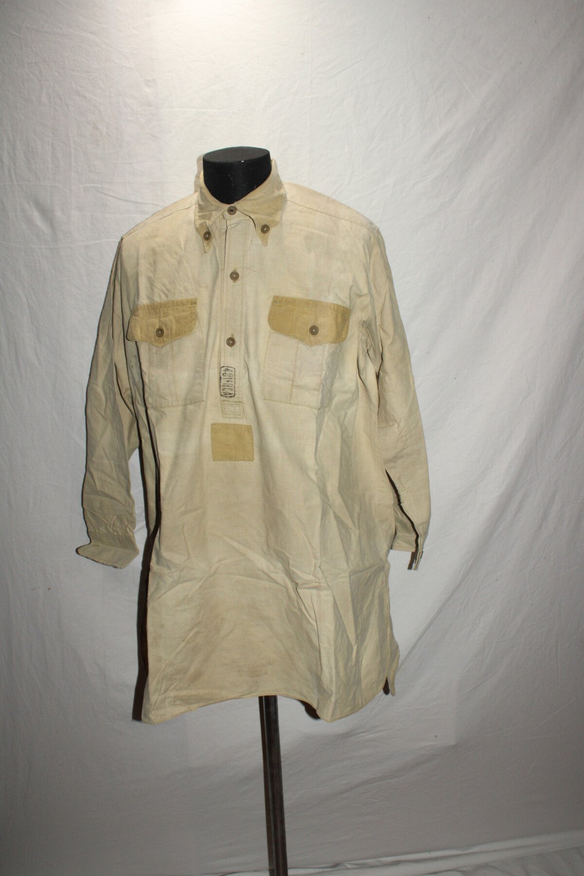Belle chemise modèle 1935. Tout les boutons présents. Pas de tampon de taille et date visible. Régimenté 401e DCA. Des taches présentes. Largeur d'épaule=45 cm, longueur de manche=58 cm.