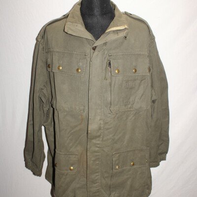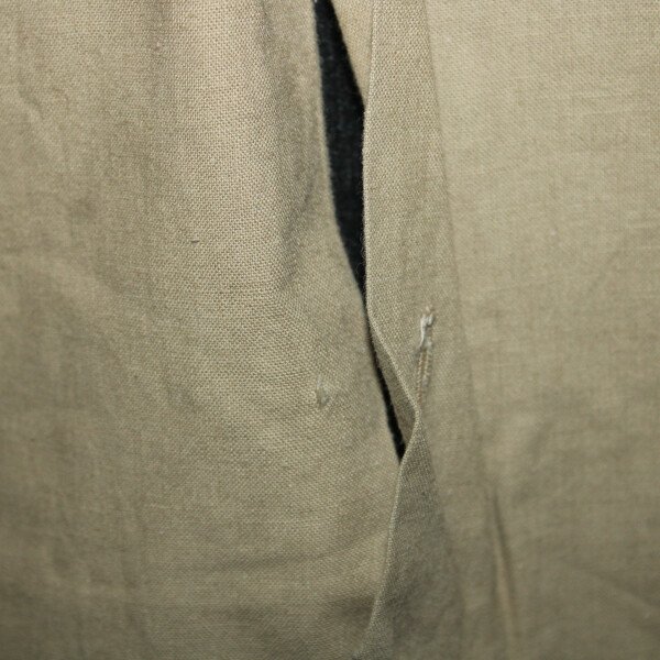 Chemise à manche courte en toile sable modèle 46. Daté 1952 ou 1956. Un bouton absent en bas. Taille 2. Taille à plat: largeur d'épaule=47 cm.