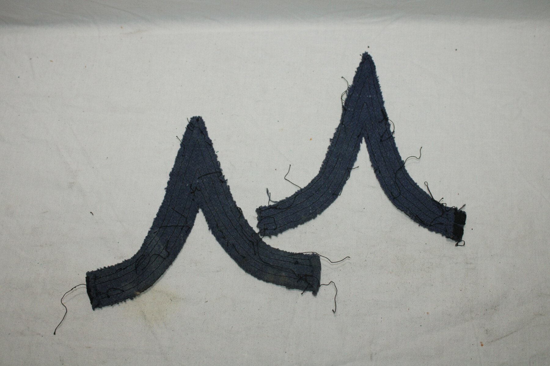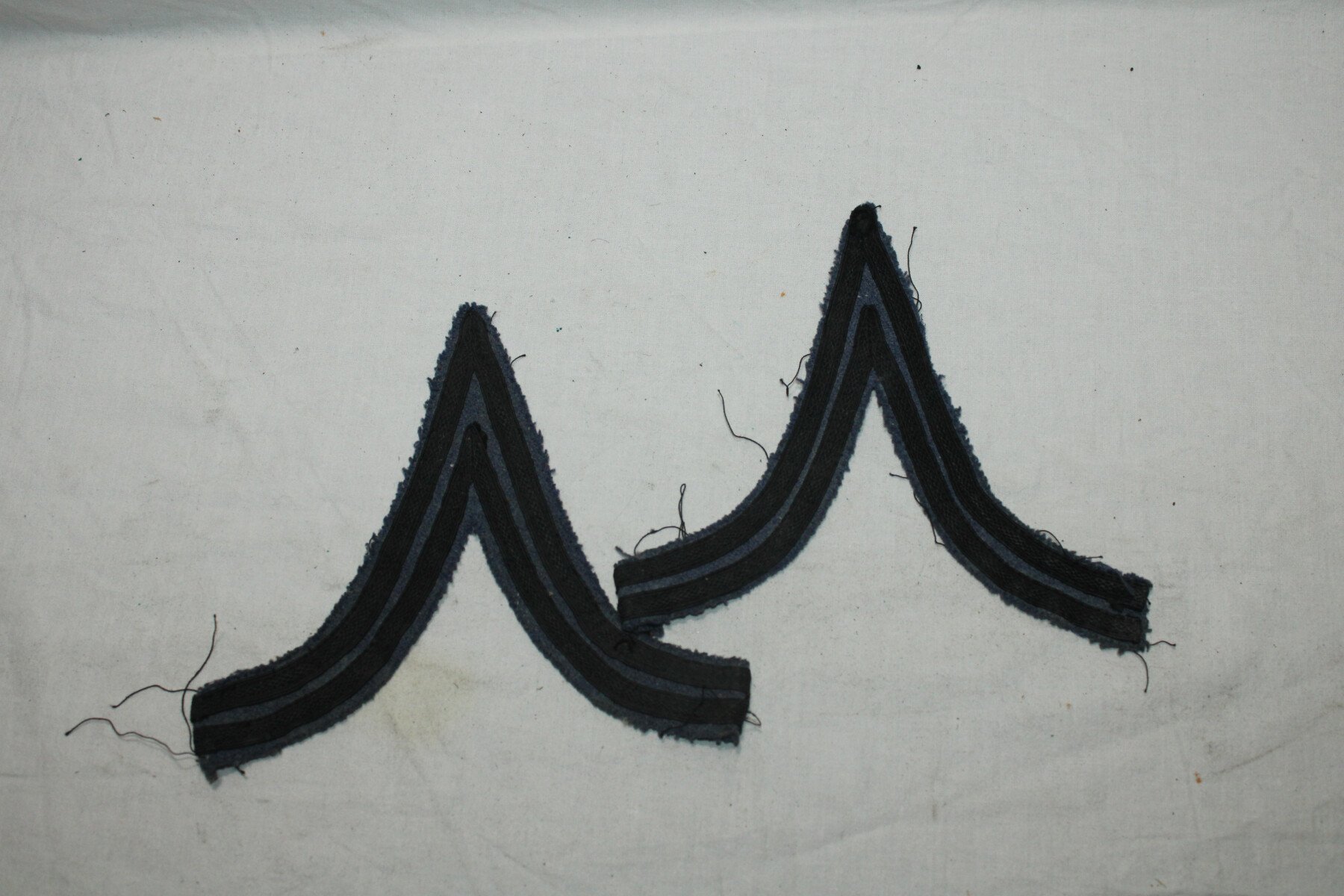 Paire d'nsigne de manche à deux chevrons bleu sur fond bleu horizon. Démonté d'un uniforme. Hauteur total 15cm.
