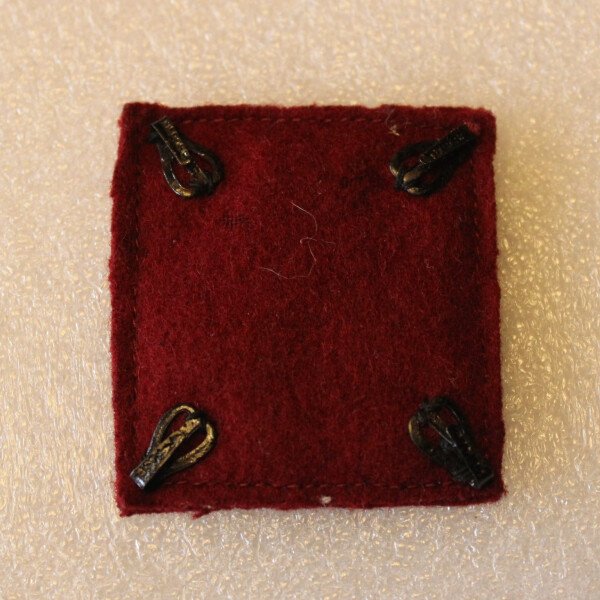 Insigne tissu de la brigade de parachutistes d'outre mer. L'insigne représente un dragon ailé avec griffe. La chimère fut surnommé également “lapin à Gilles” . Version de type V. monté sur feutre amarante avec 4 crochets de fixation pour tenue. Il sera porté par la suite par le 1er RPIMA. L'insigne est une évolution de la demi brigade coloniale de commandos parachutistes en Indochine