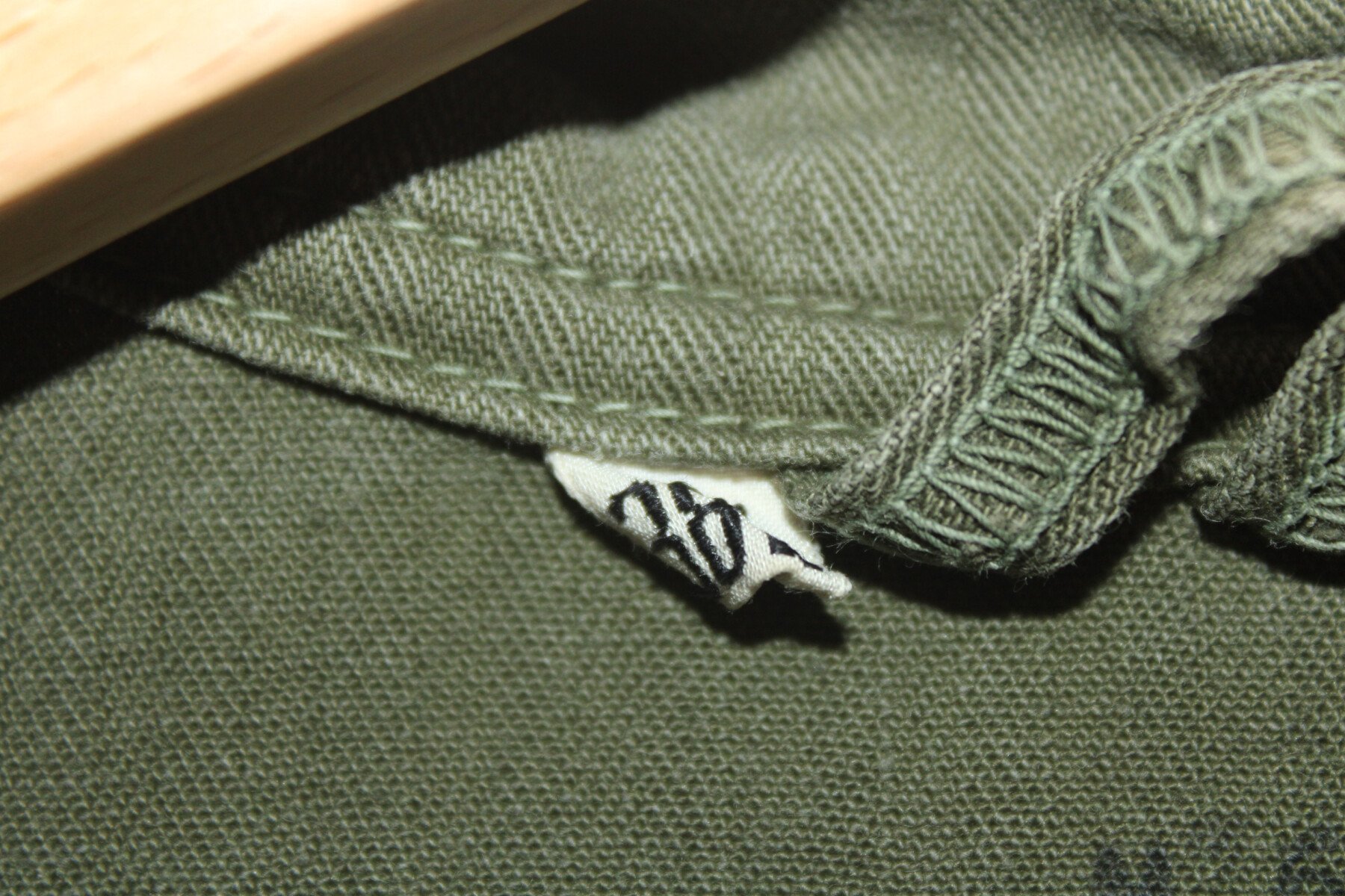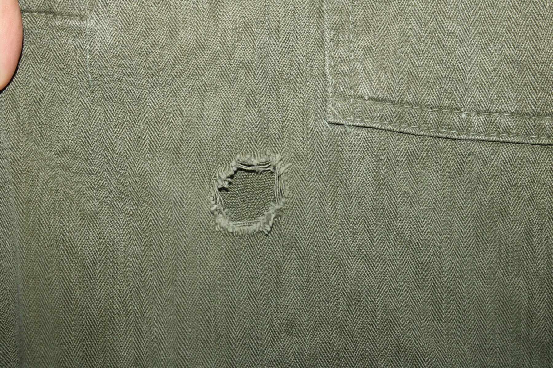 Combinaison en Toile Hbt 2e modèle. Taille 38L. Bon état général, quelques trous. Ceinture présente. Etiquette présente dans la poche. Un Laundry number y figure à l'intérieur. Provient de camps cigarettes en Seine-Maritime. Largeur d'épaule: 50,5cm.