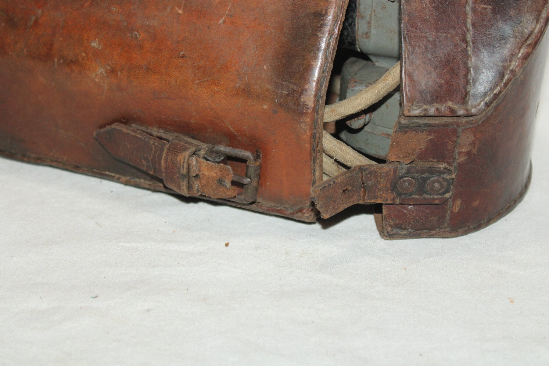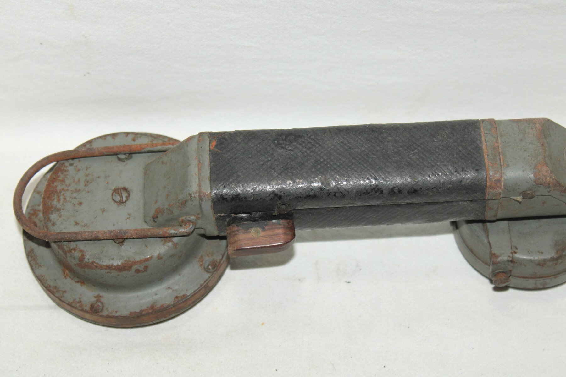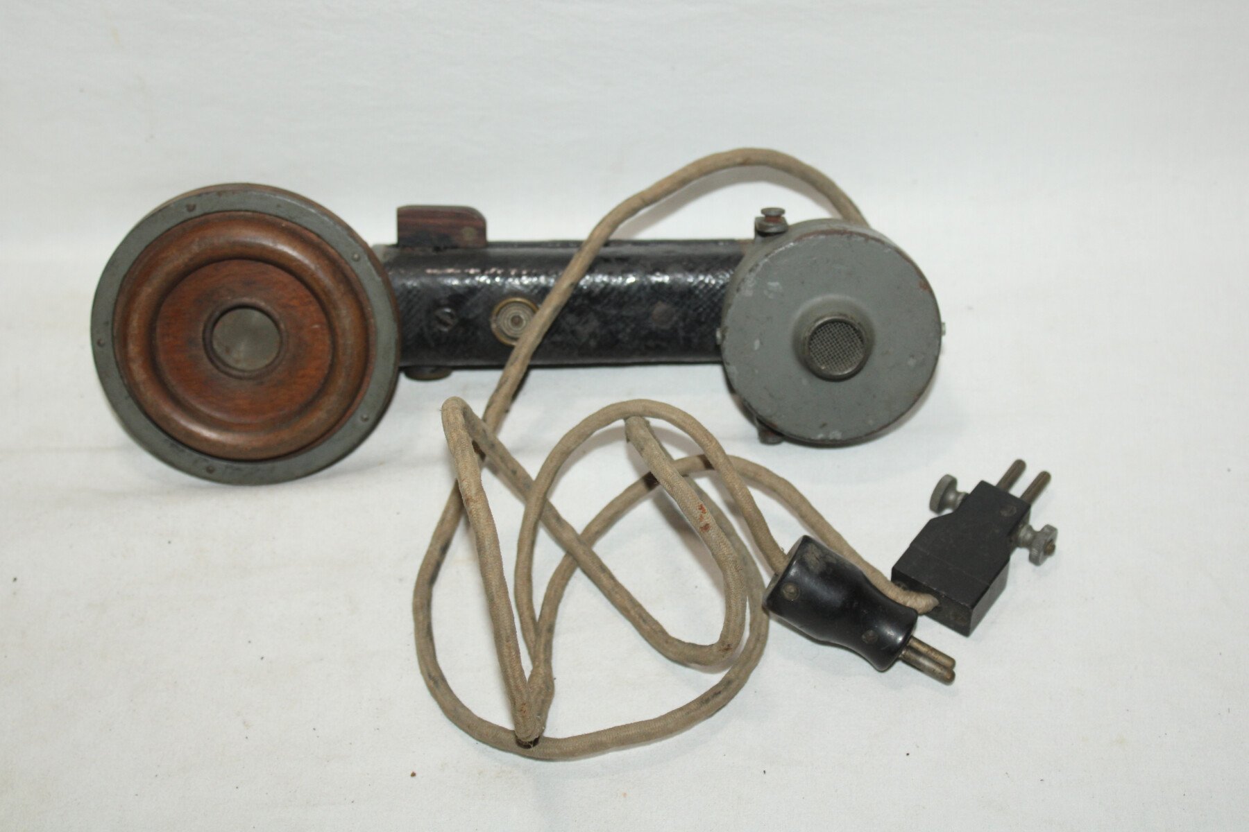 Combiné pour téléphone de campagne prussien dans son étui de transport. Peinture feldgrau présente, complet avec son câble à deux fiches et tout ses boutons. Etui en cuir, sanglon de fermeture cassé mais présent. Marquage dans le couvercle. Intérieur en partie abimée. Sangle absente. Bel ensemble.