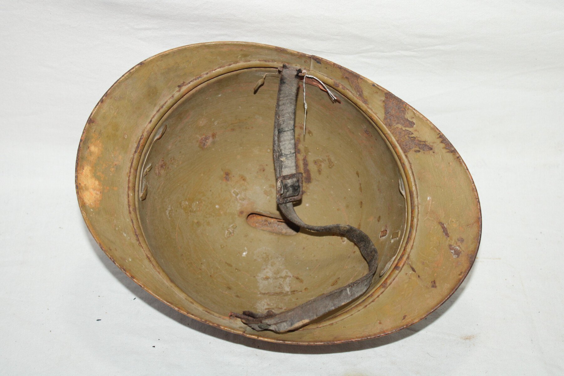 Coque de casque Adrian modèle 15 avec insigne de l'infanterie coloniale. Insigne original. Peinture refaite. A l'intérieur les 4 agrafes de maintiens sont présentes mais 1 cassé. Bombe de taille 56. Jugulaire modèle 1926, cuir cassant.