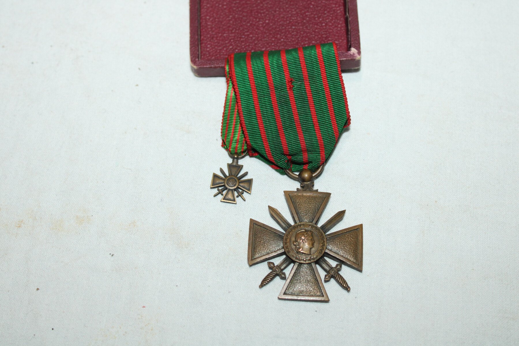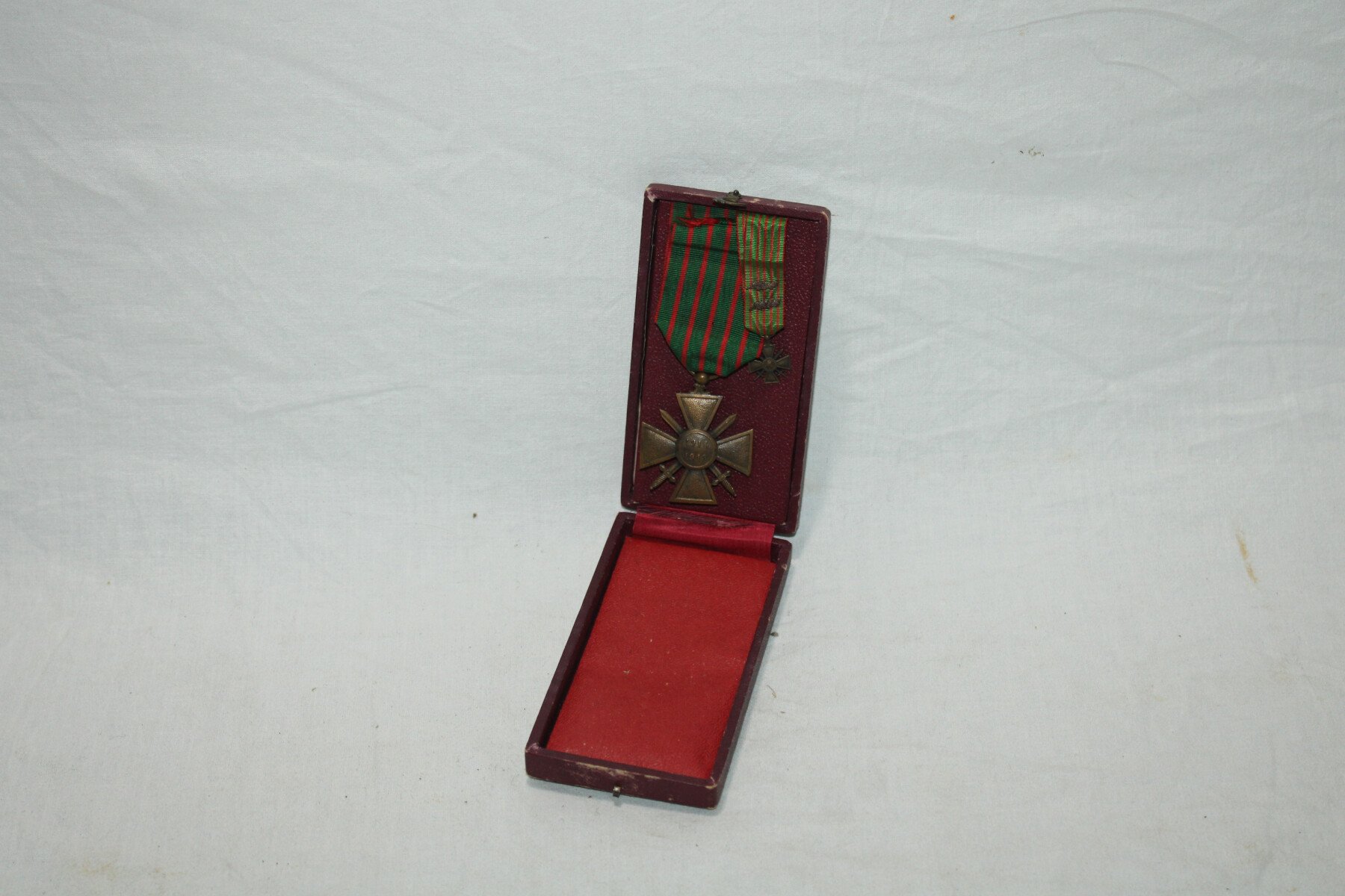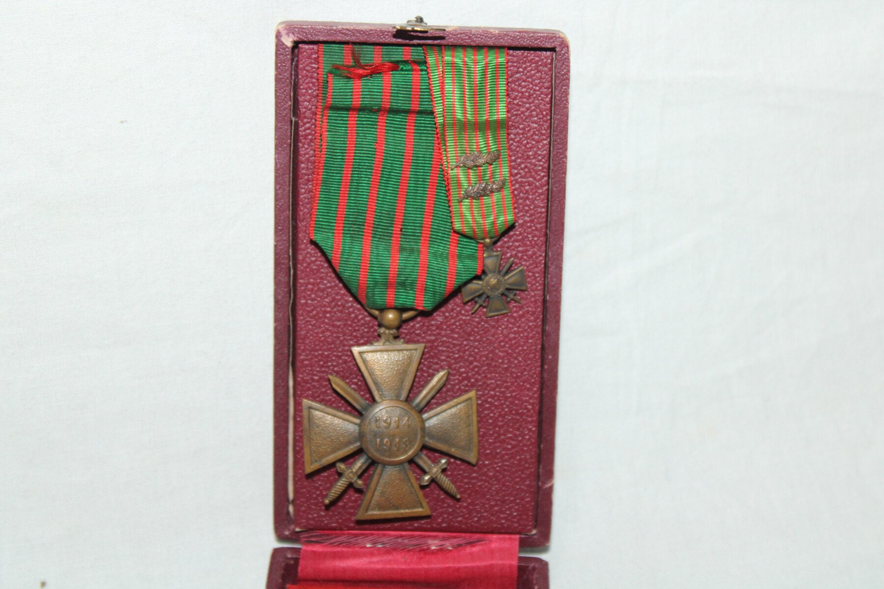 Croix de guerre 1914/1918 dans sa boite, avec une miniature a deux palmes.