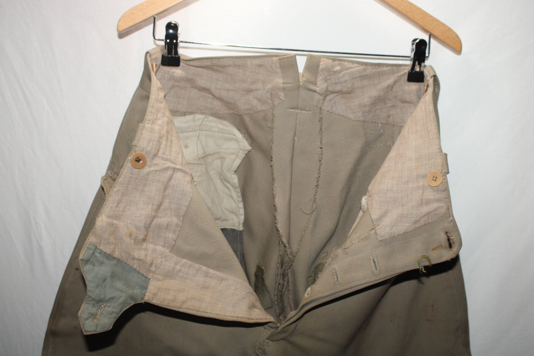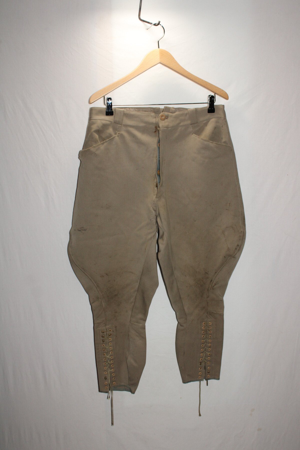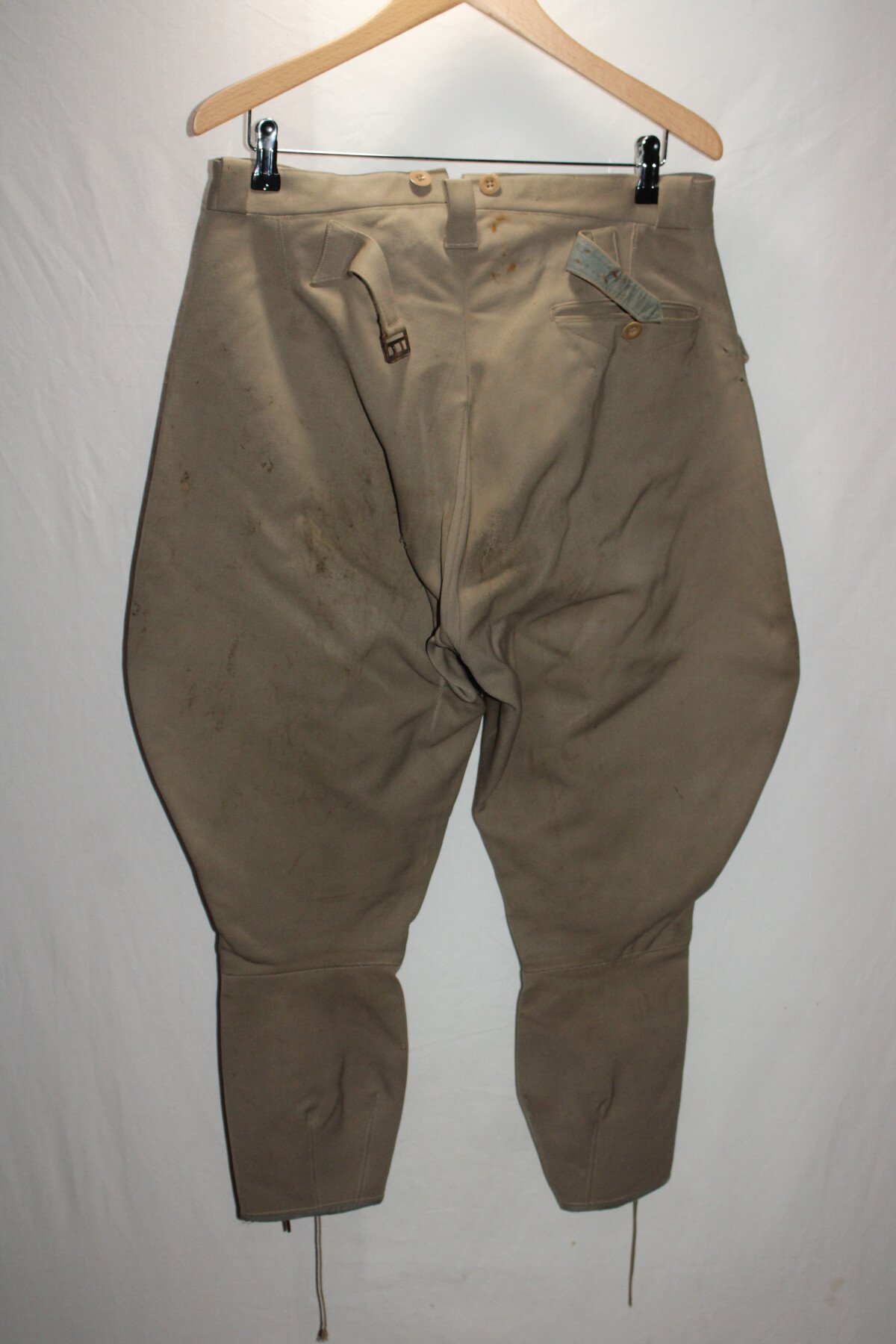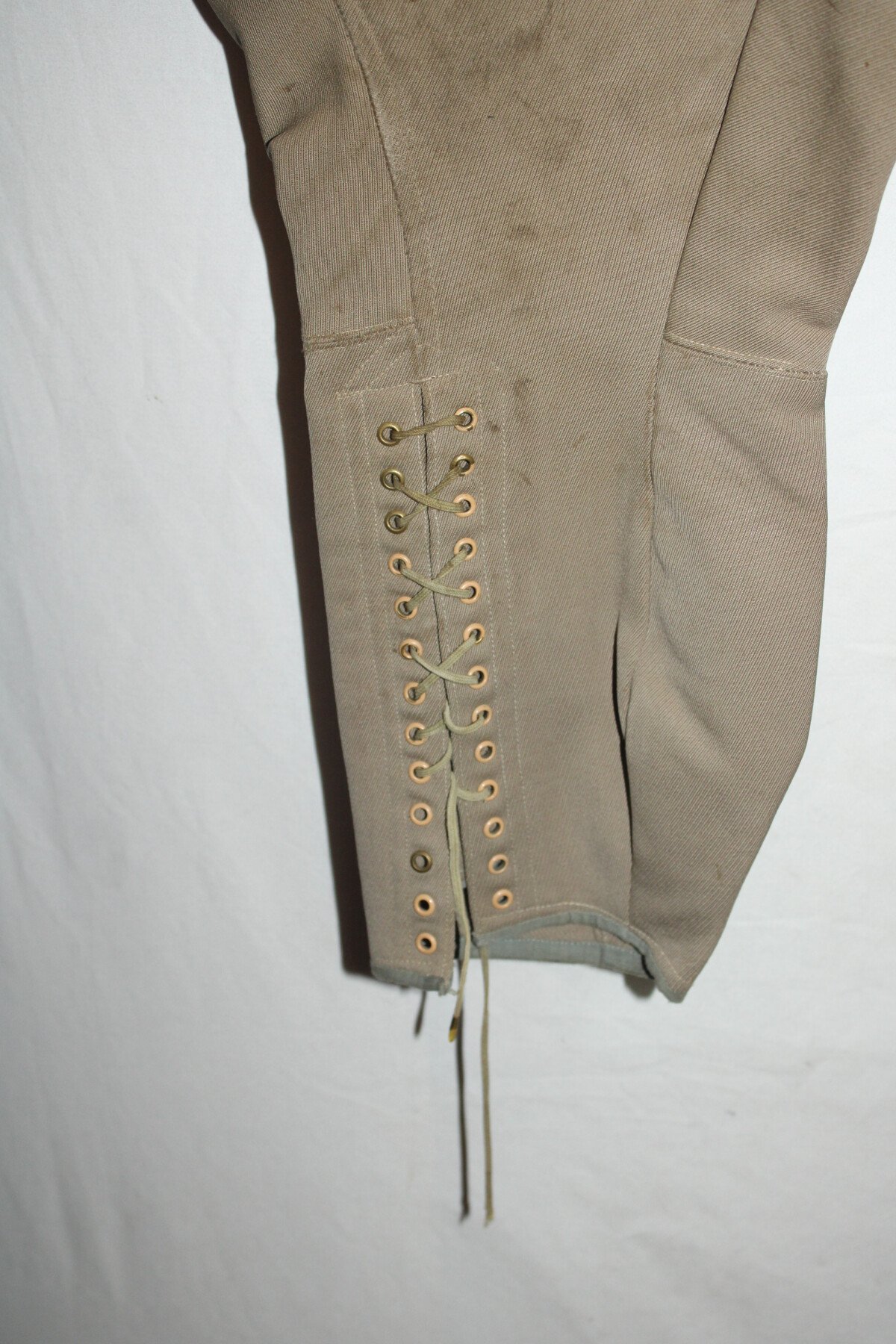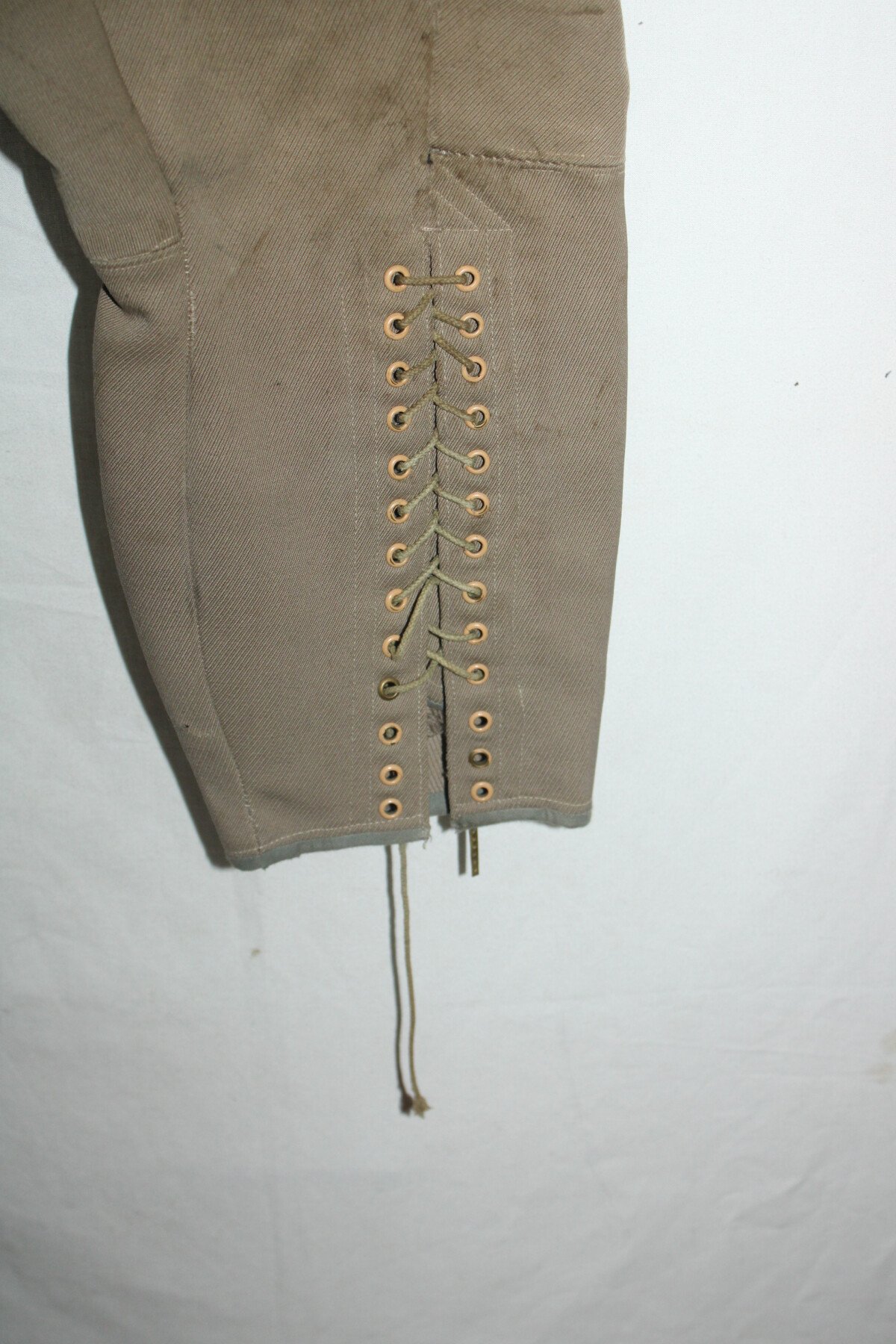 Pantalon-culotte d'officier en tissu mastic. Nombreux petits trous et accrocs, lacets présents. Tour de taille à plat 43cm, hauteur total 90cm.
