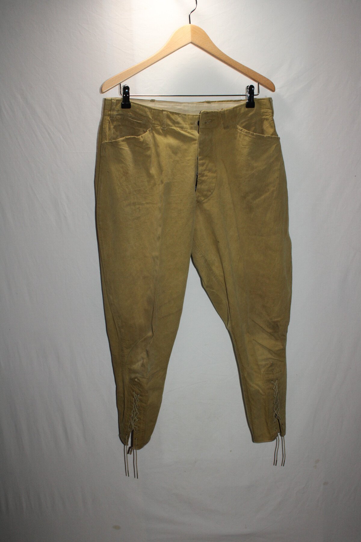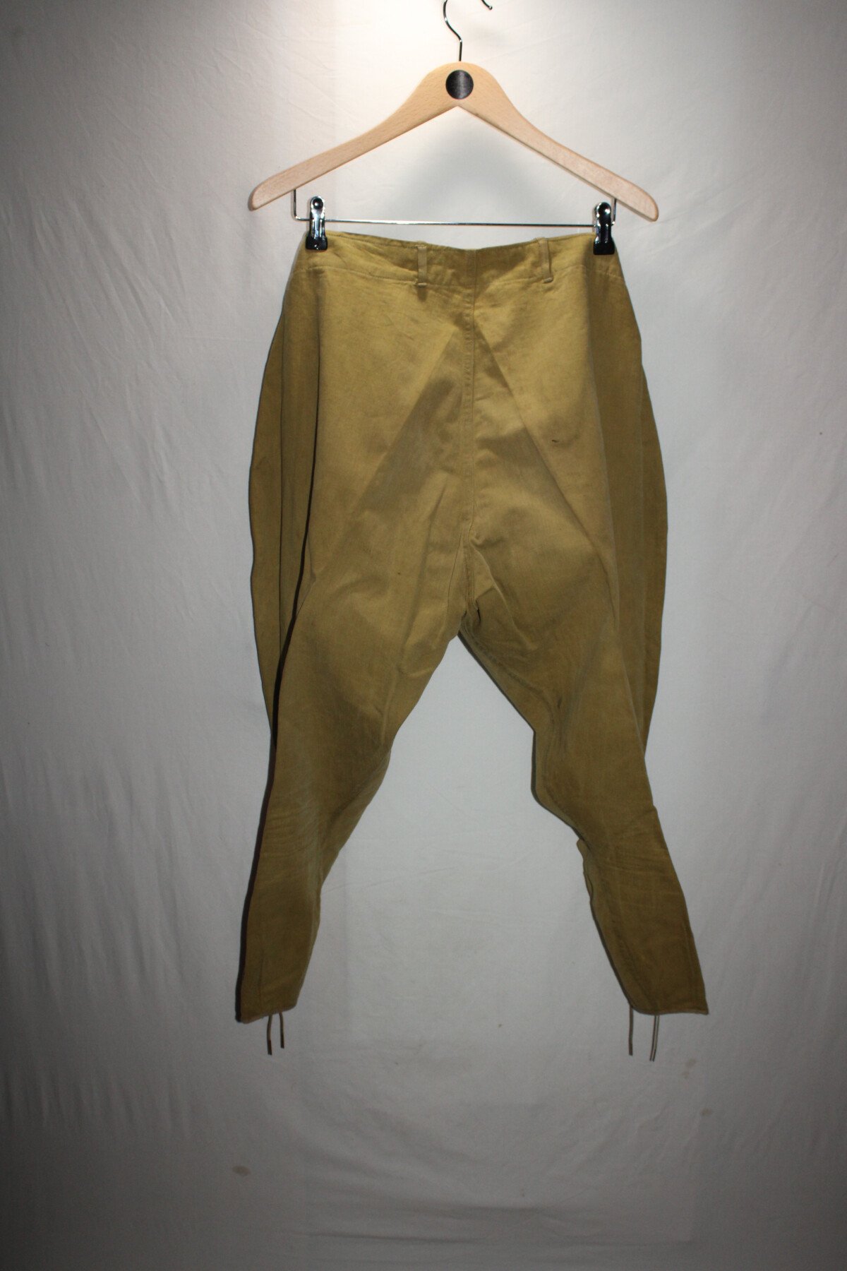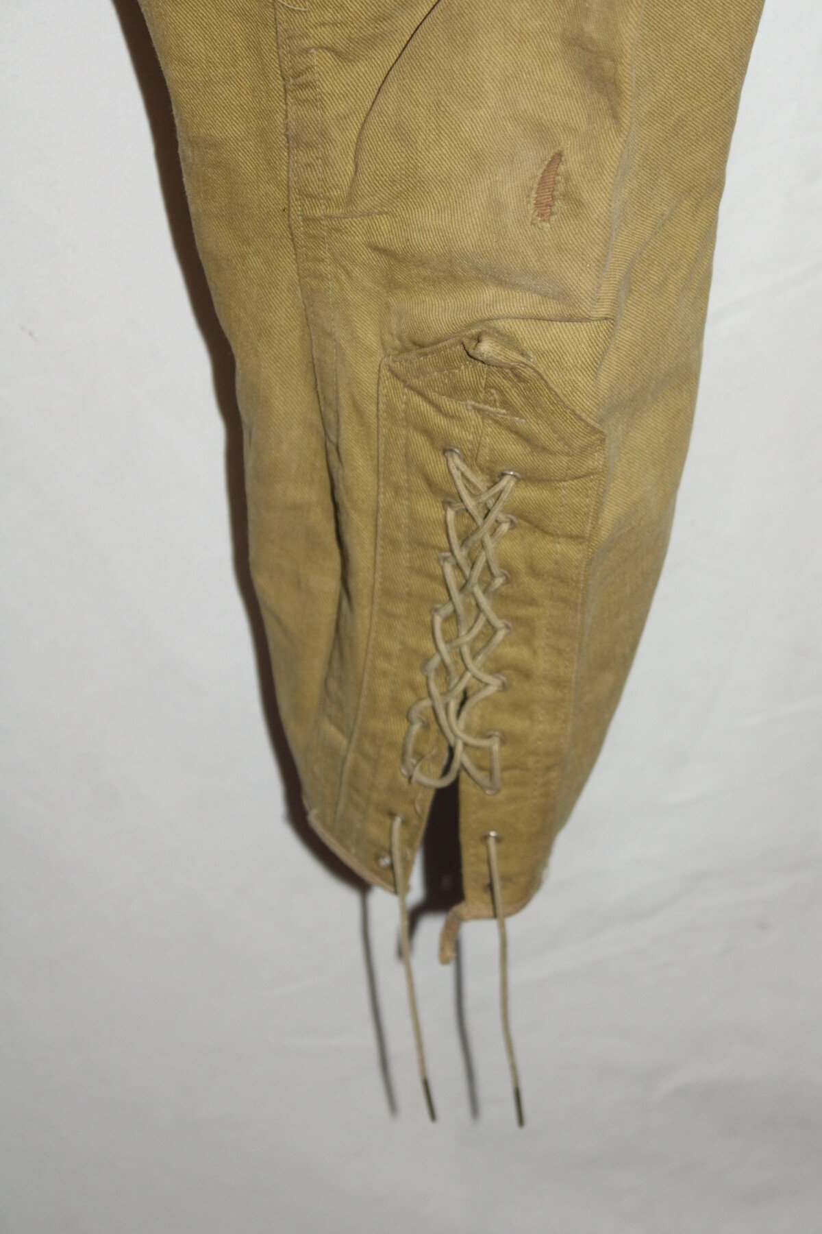 culotte troupe Américaine modèle 1926 en toile kaki clair. Passants toile de ceinturon. Boutons en fer "US Army" cousus d'origine. Bas des jambes à lacets. Lacets d'origines en coton. Deux poches avant. Poche a gousset. Intérieur doublé en toile de coton blanc. Tour de Taille à plat 42 cm. Longueur totale 90cm. pas d'Etiquette.Une petite réparation en bas de jambe.