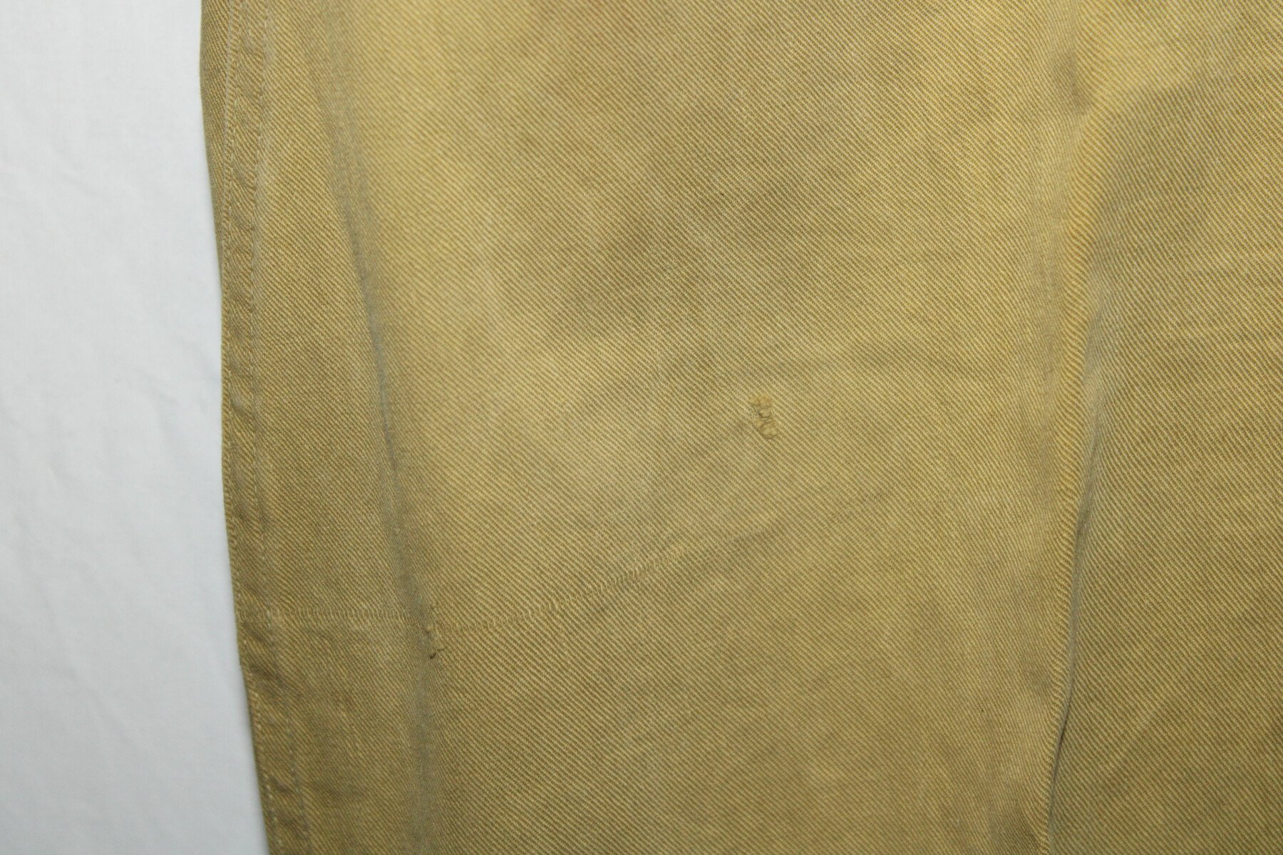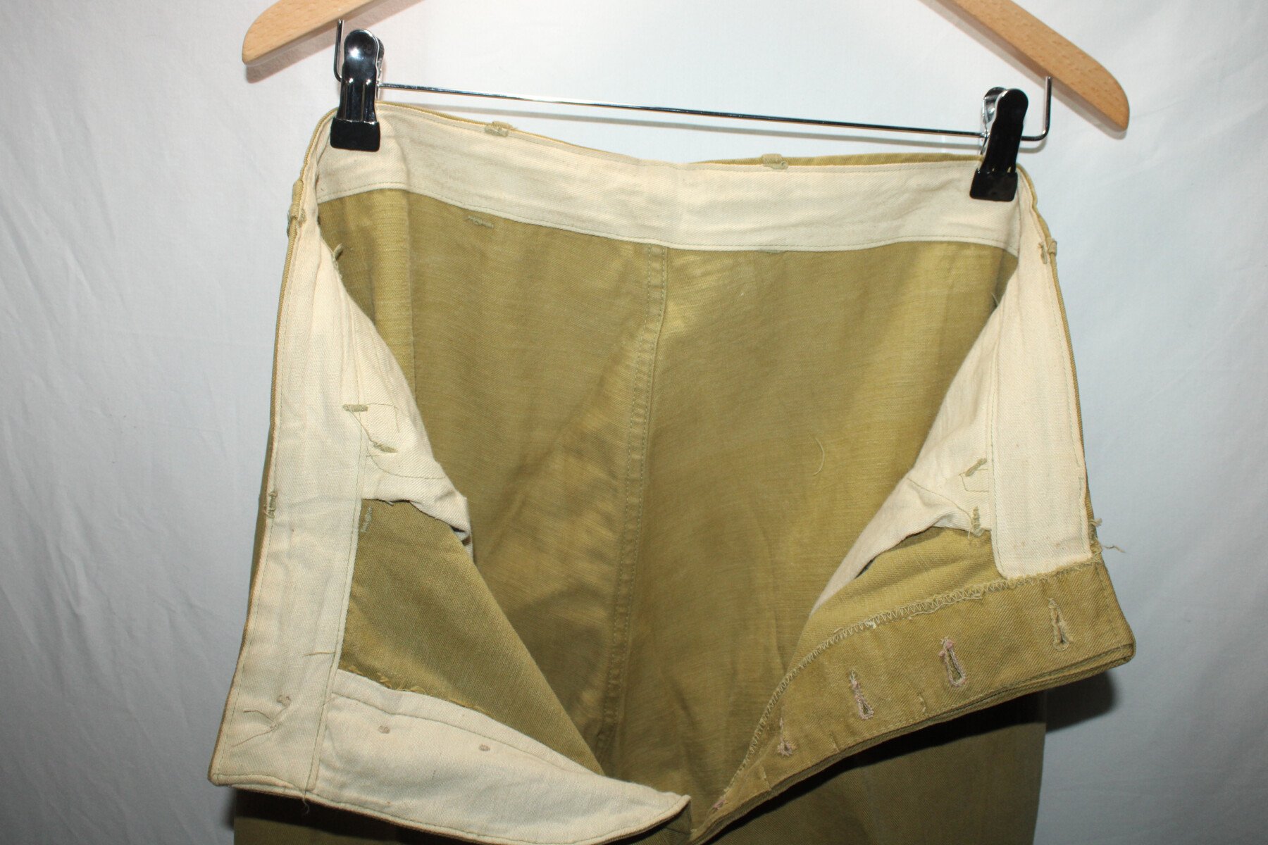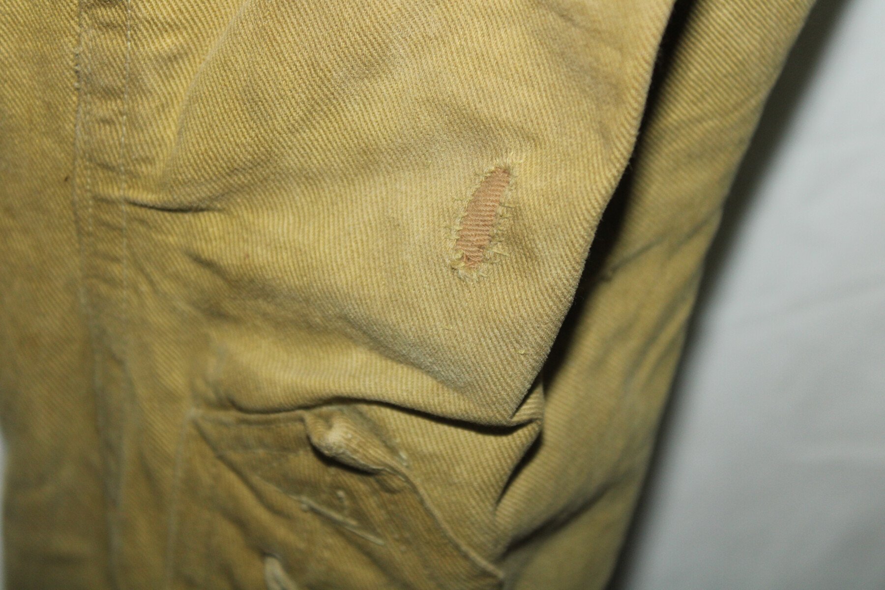 culotte troupe Américaine modèle 1926 en toile kaki clair. Passants toile de ceinturon. Boutons en fer "US Army" cousus d'origine. Bas des jambes à lacets. Lacets d'origines en coton. Deux poches avant. Poche a gousset. Intérieur doublé en toile de coton blanc. Tour de Taille à plat 42 cm. Longueur totale 90cm. pas d'Etiquette.Une petite réparation en bas de jambe.