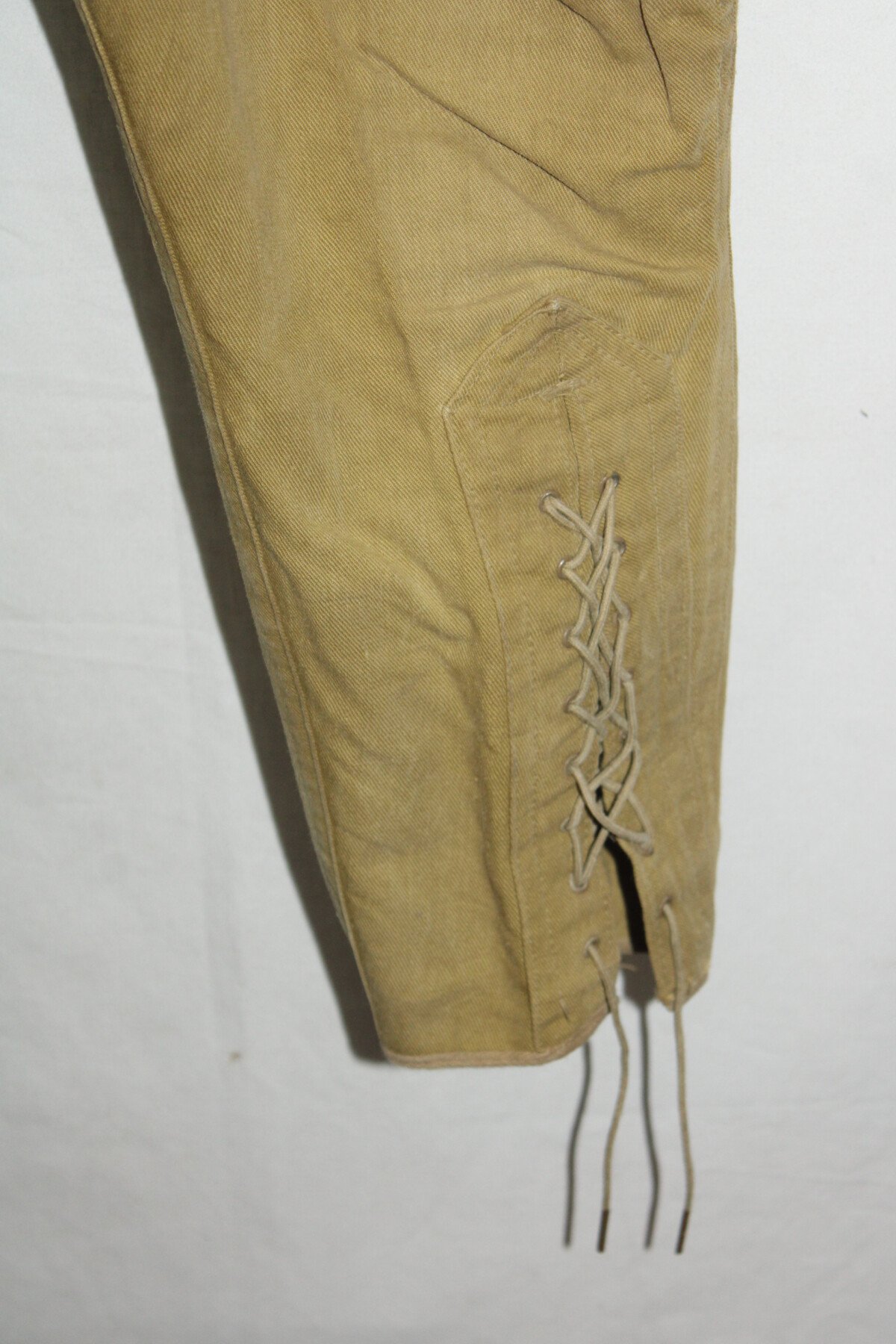 culotte troupe Américaine modèle 1926 en toile kaki clair. Passants toile de ceinturon. Boutons en fer "US Army" cousus d'origine. Bas des jambes à lacets. Lacets d'origines en coton. Deux poches...