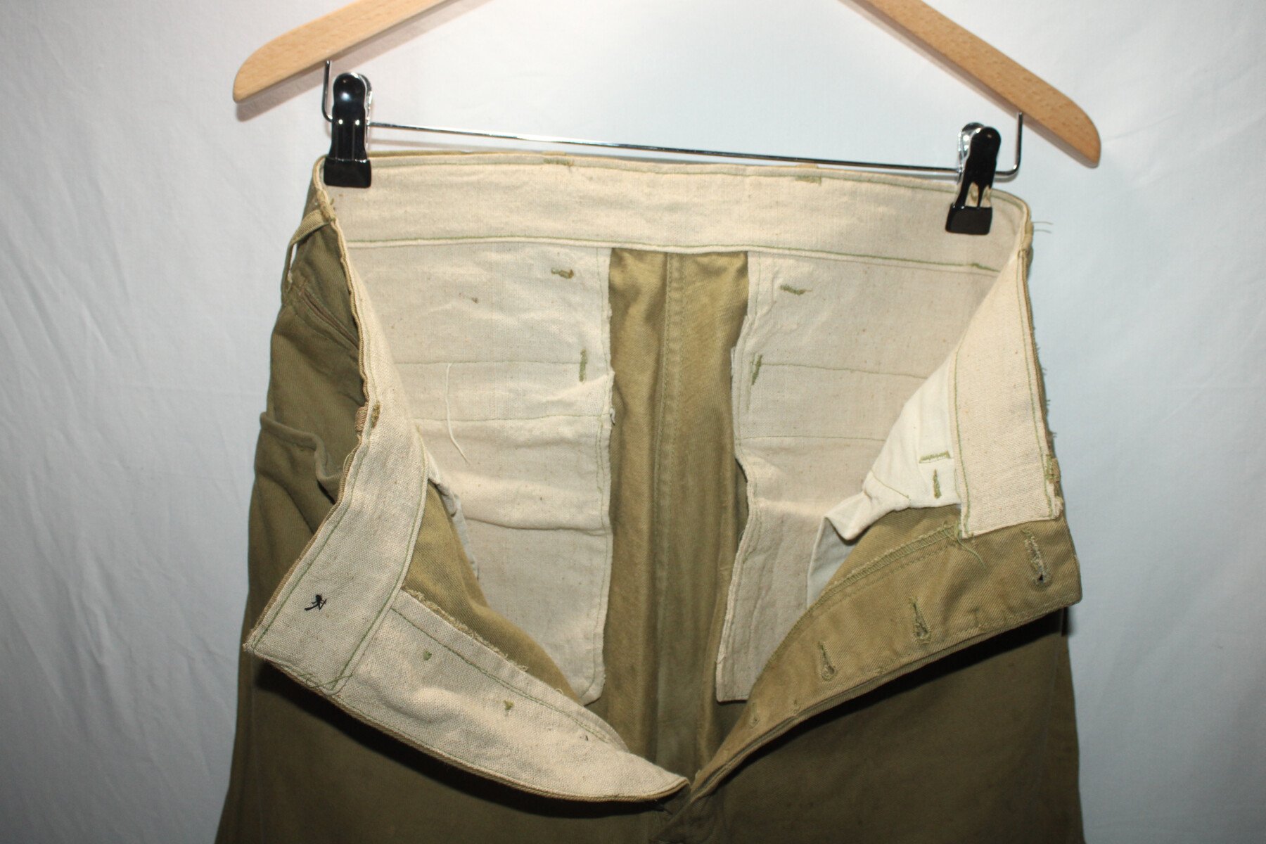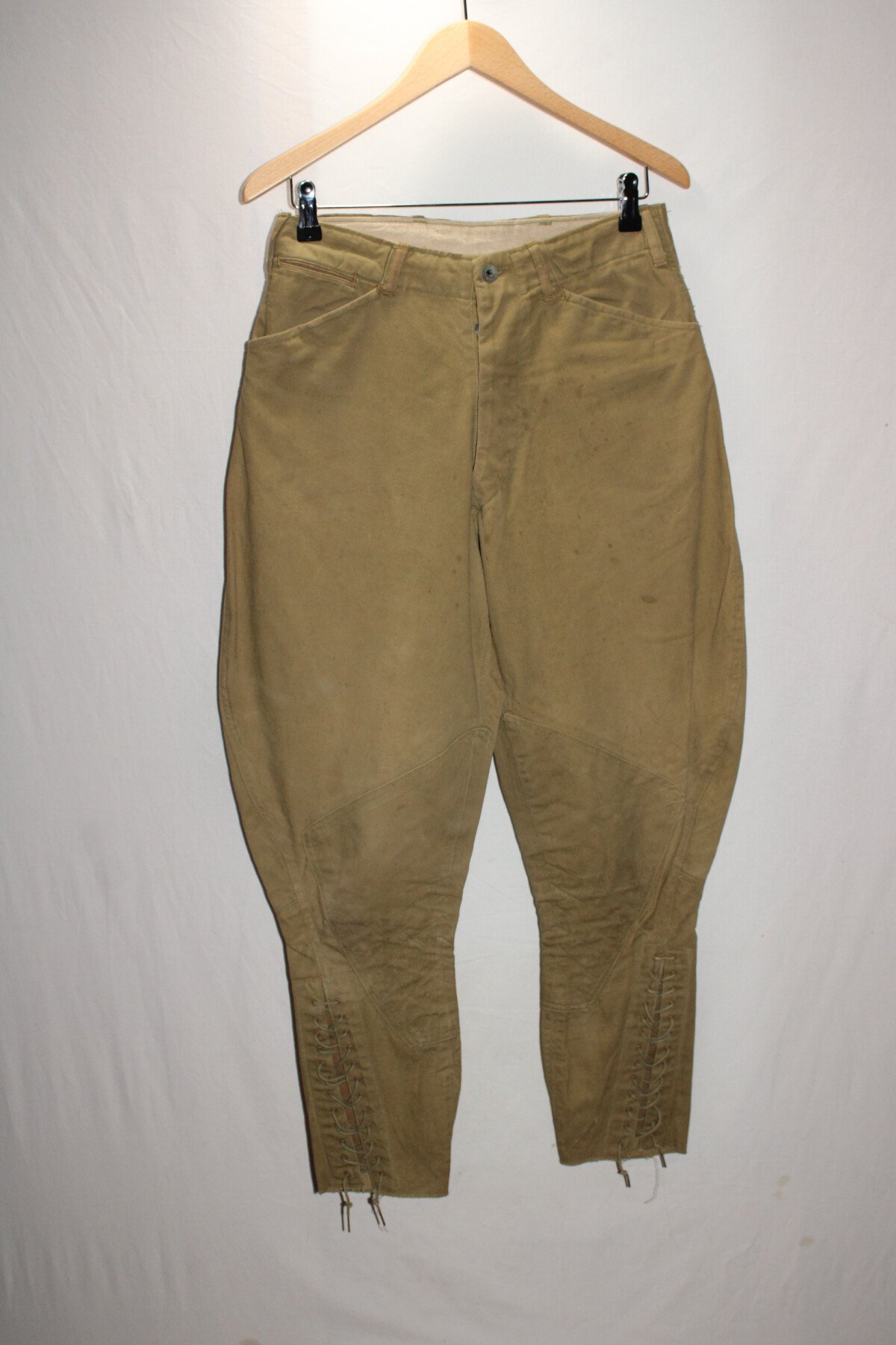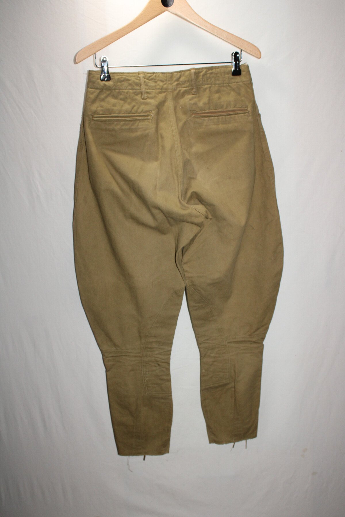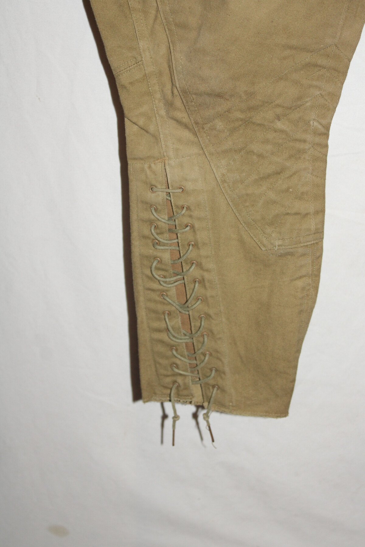 culotte troupe Américaine modèle 1912 en toile kaki clair. Passants toile de ceinturon. Boutons en fer "US Army" cousus d'origine. Bas des jambes à lacets. Lacets d'origines en coton. Quatre poches. Poche à gousset. Intérieur doublé en toile de coton blanc. Tour de taille à plat 38/40. Longueur totale 100cm. pas d'Etiquette.