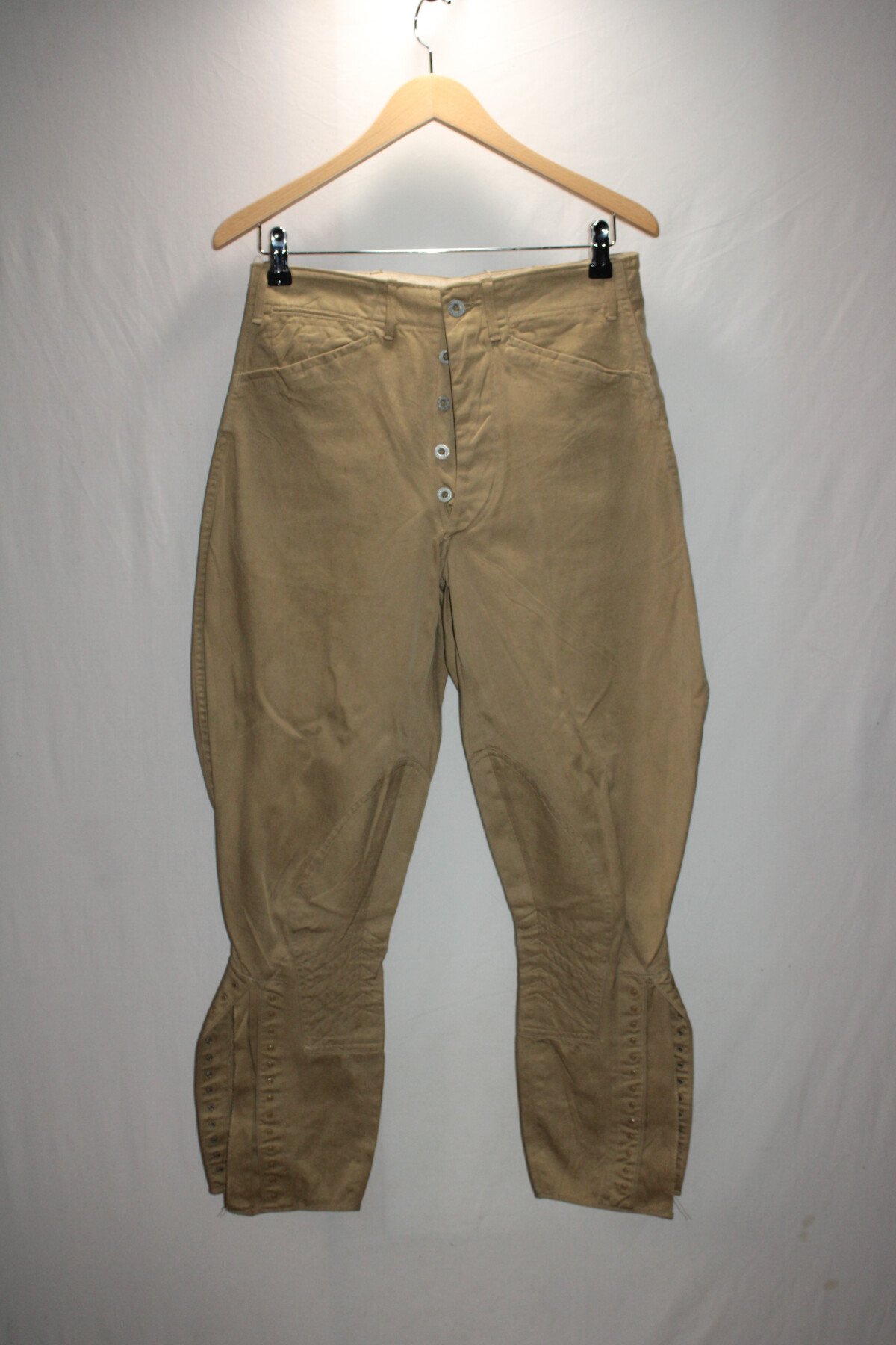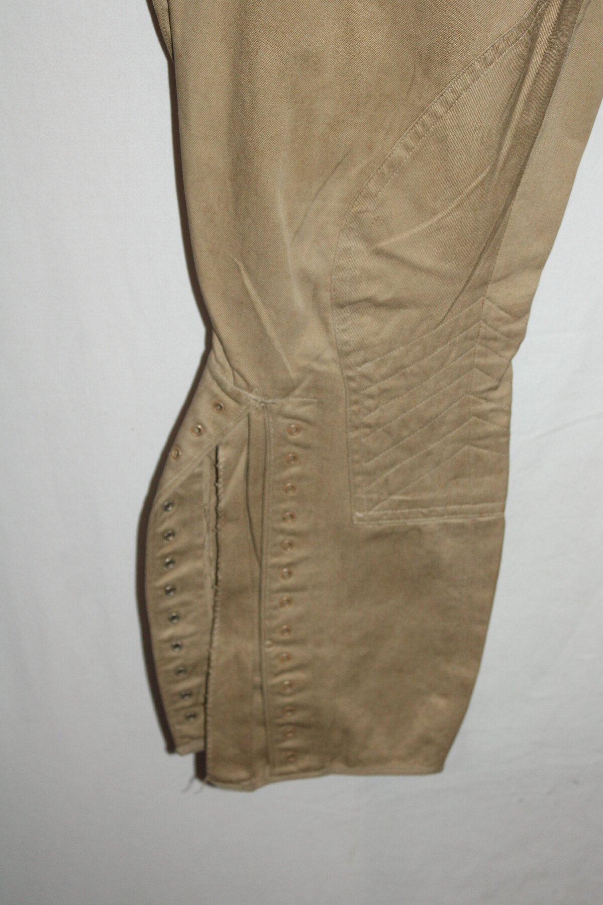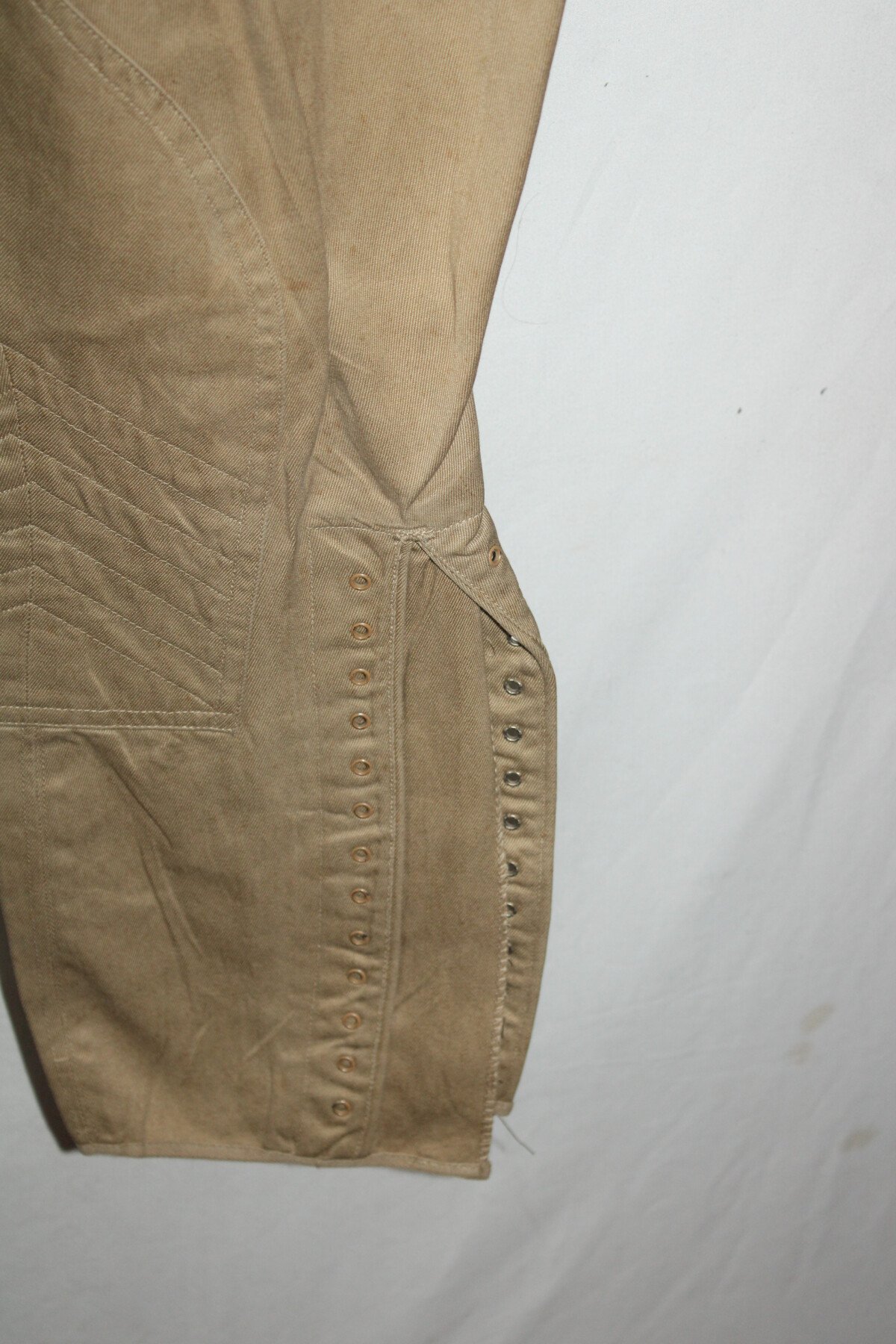 culotte troupe Américaine modèle 1912 en toile kaki clair. Passants toile de ceinturon. Boutons en fer "US Army" cousus d'origine. Bas des jambes à lacets. Lacets non présents. Quatre poches....