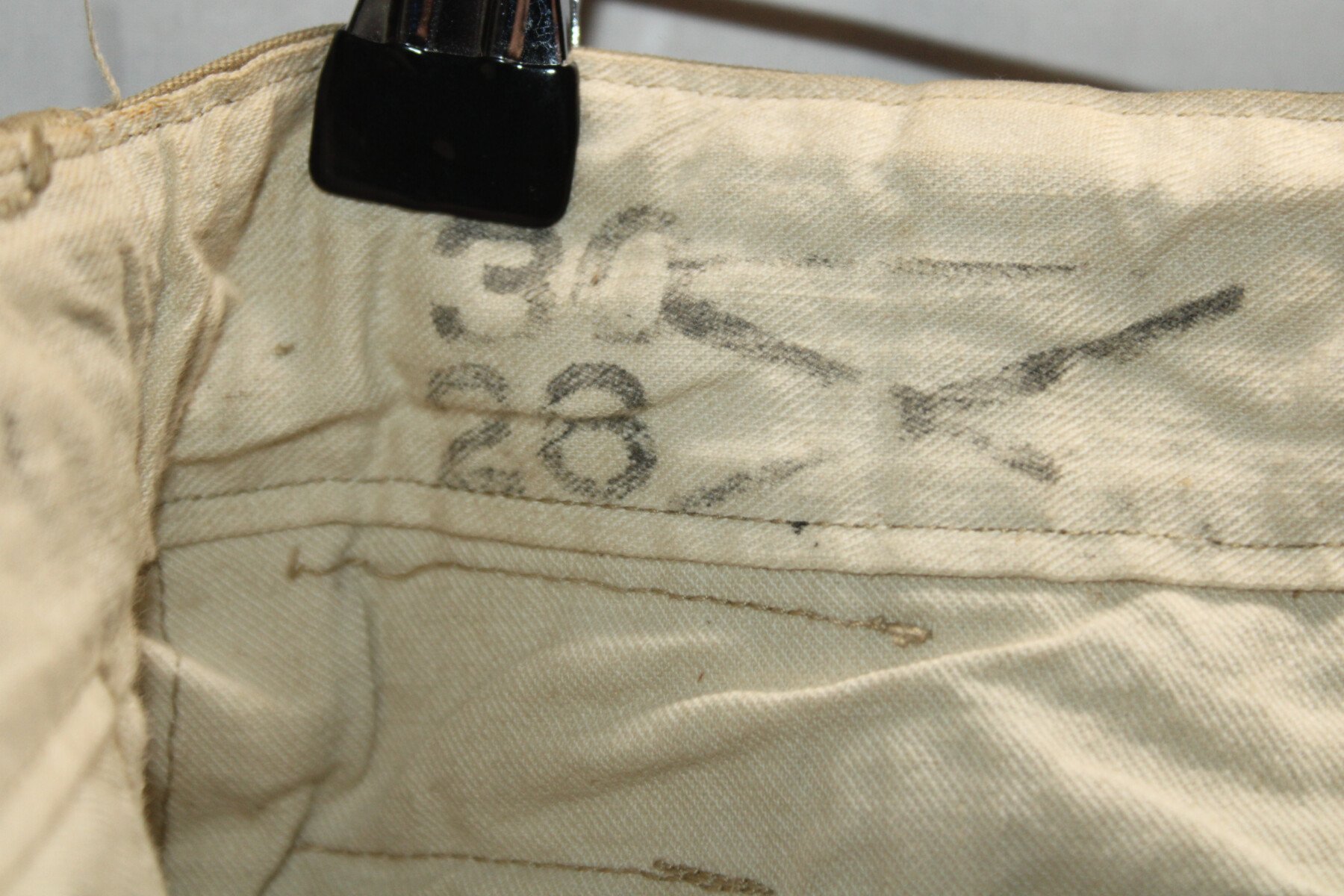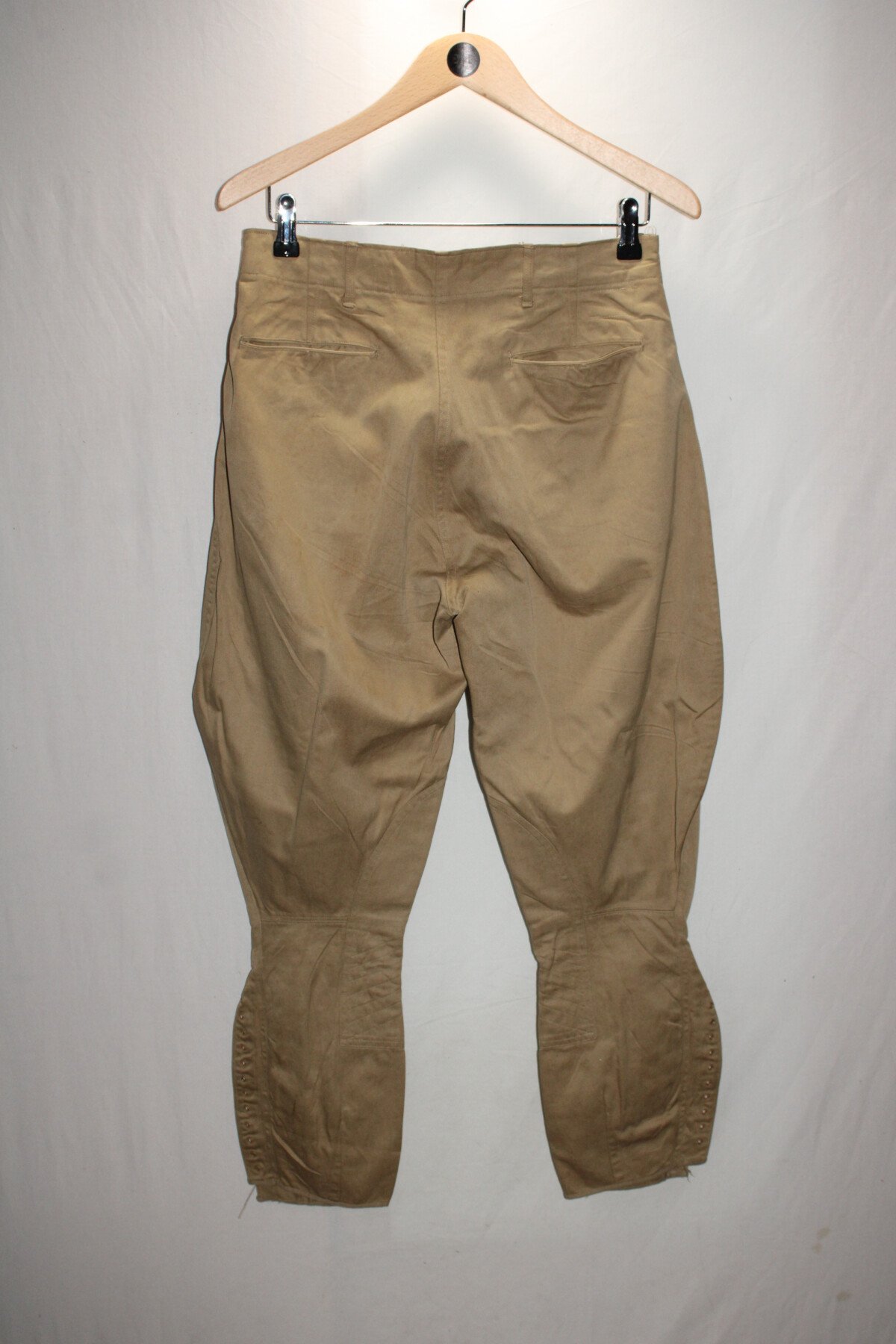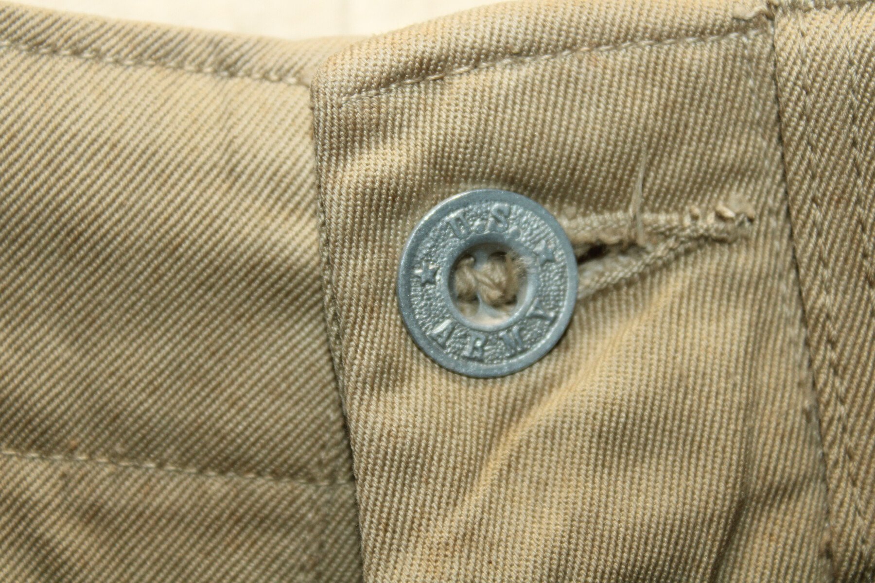 culotte troupe Américaine modèle 1912 en toile kaki clair. Passants toile de ceinturon. Boutons en fer "US Army" cousus d'origine. Bas des jambes à lacets. Lacets non présents. Quatre poches....