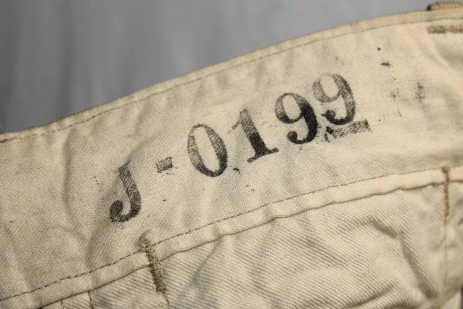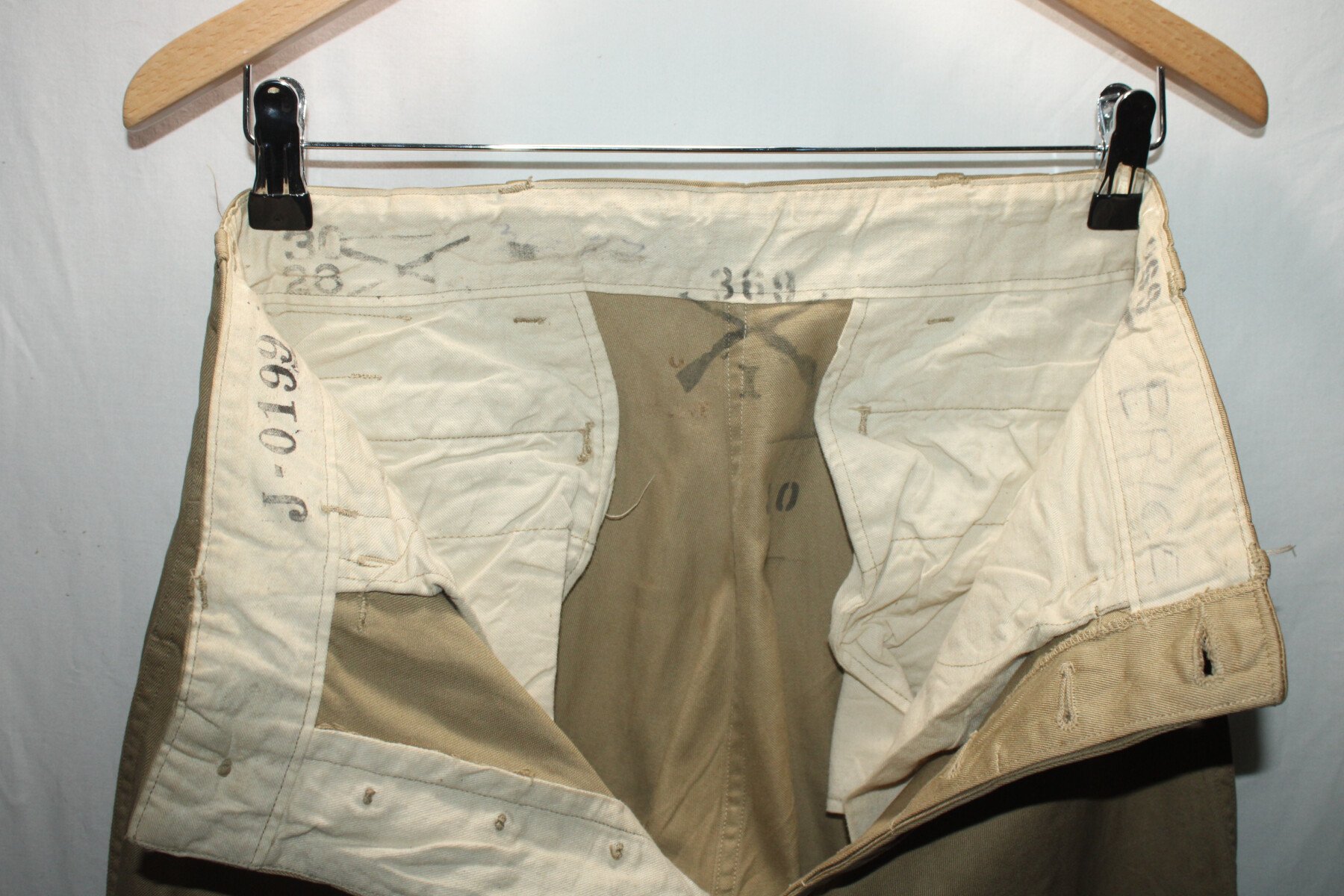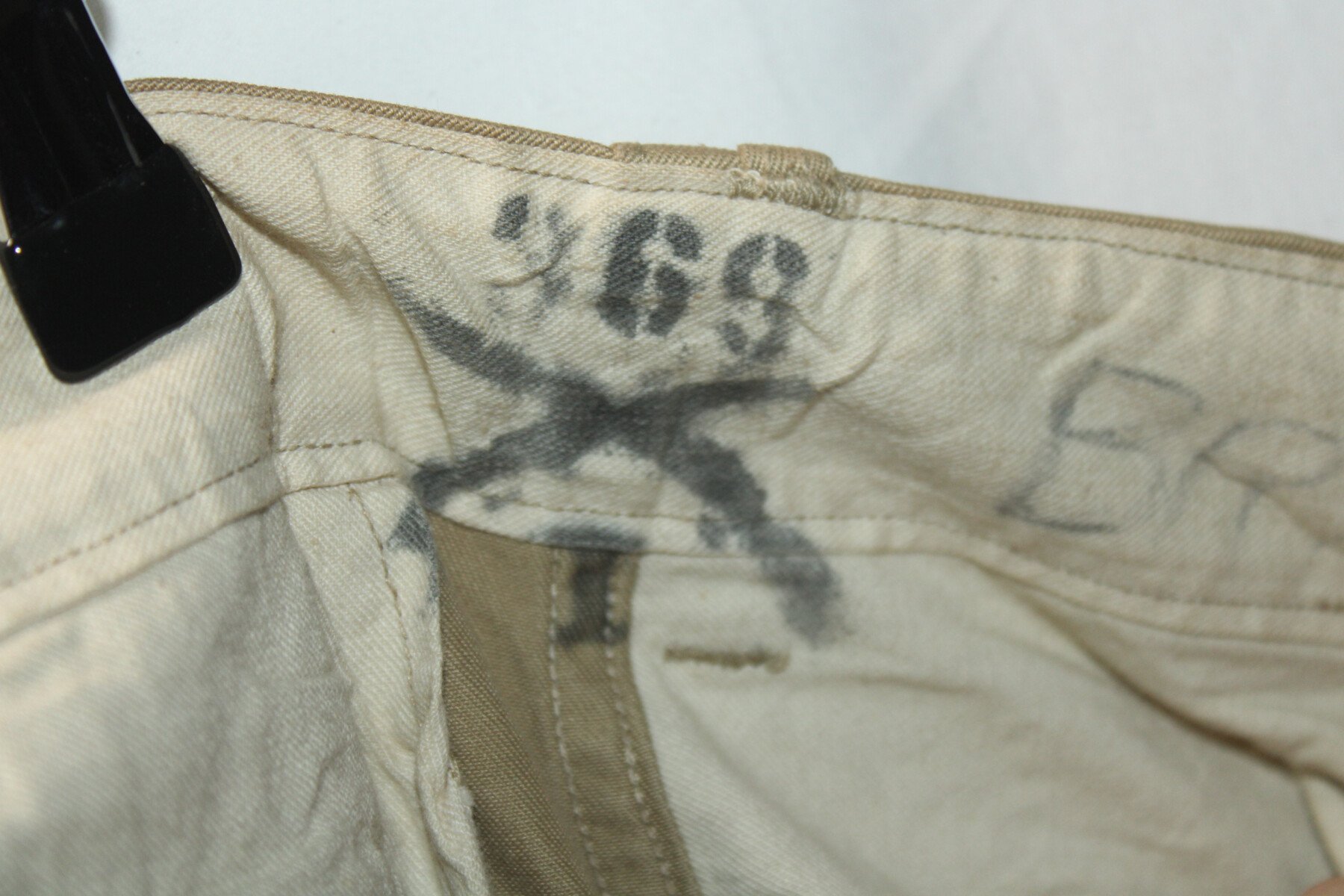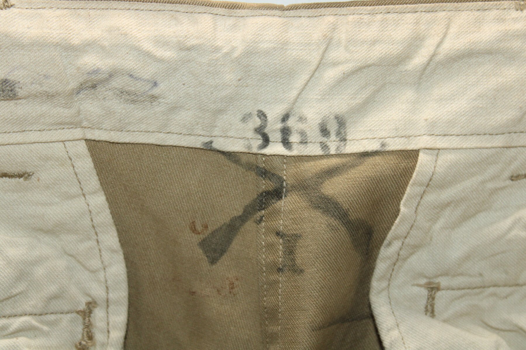 culotte troupe Américaine modèle 1912 en toile kaki clair. Passants toile de ceinturon. Boutons en fer "US Army" cousus d'origine. Bas des jambes à lacets. Lacets non présents. Quatre poches. Poche à gousset. Intérieur doublé en toile de coton blanc. Tampon du 369e régiment d'infanterie , compagnie I ainsi qu'un matricule. Tour de taille à plat 38/40. Longueur totale 96cm. Etiquette illisible.