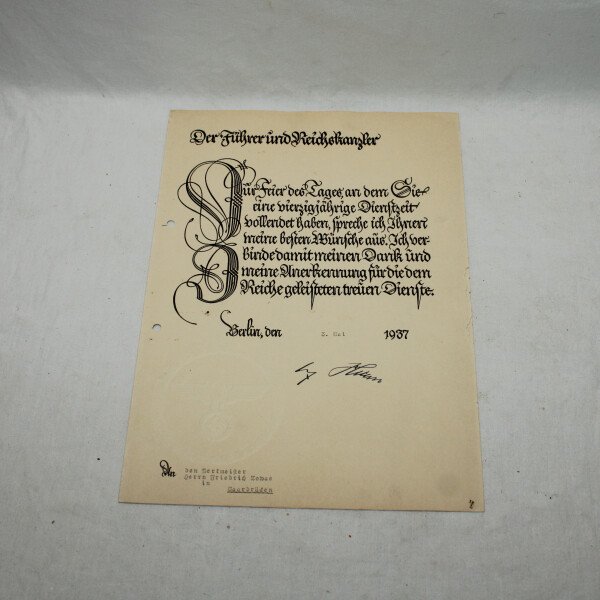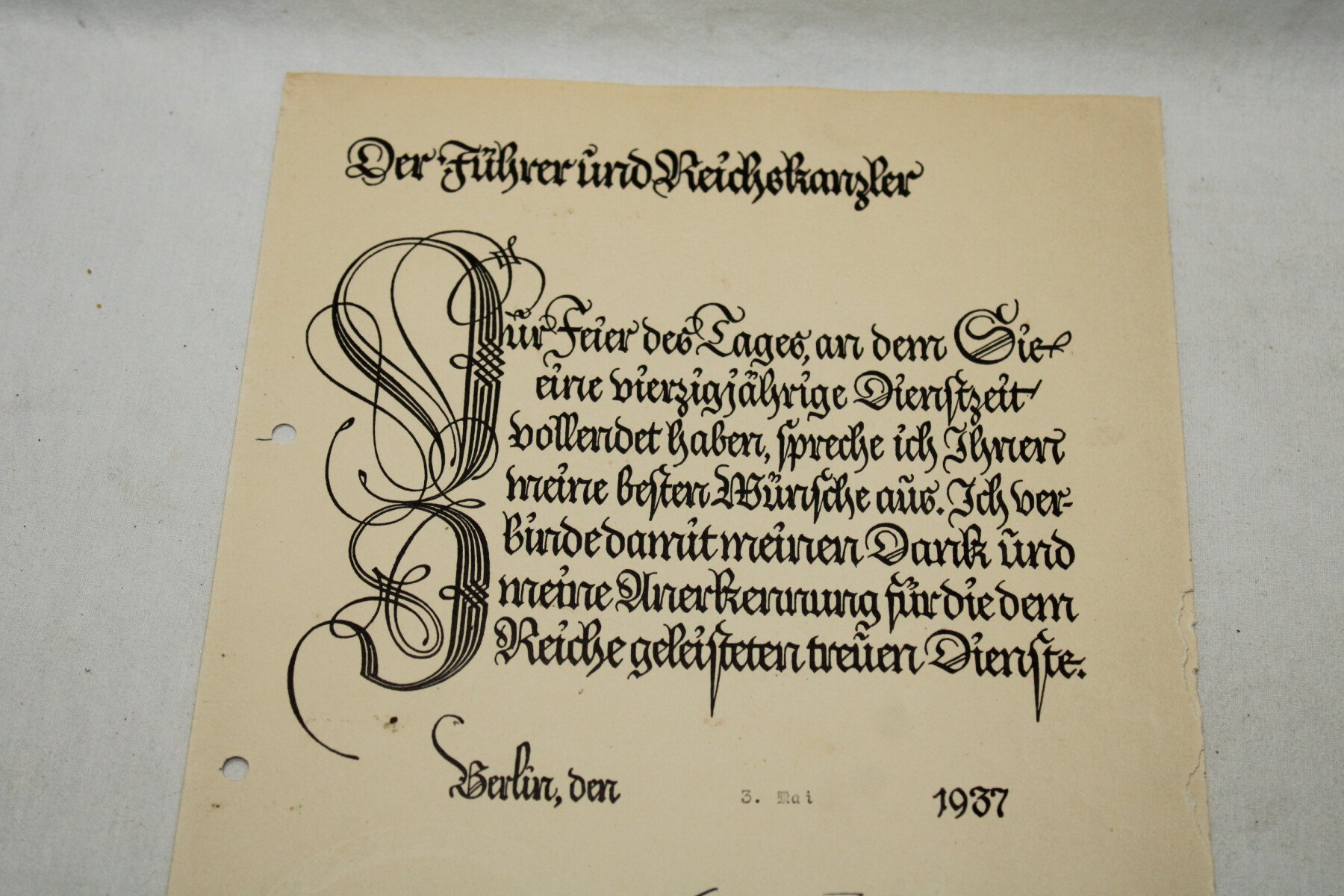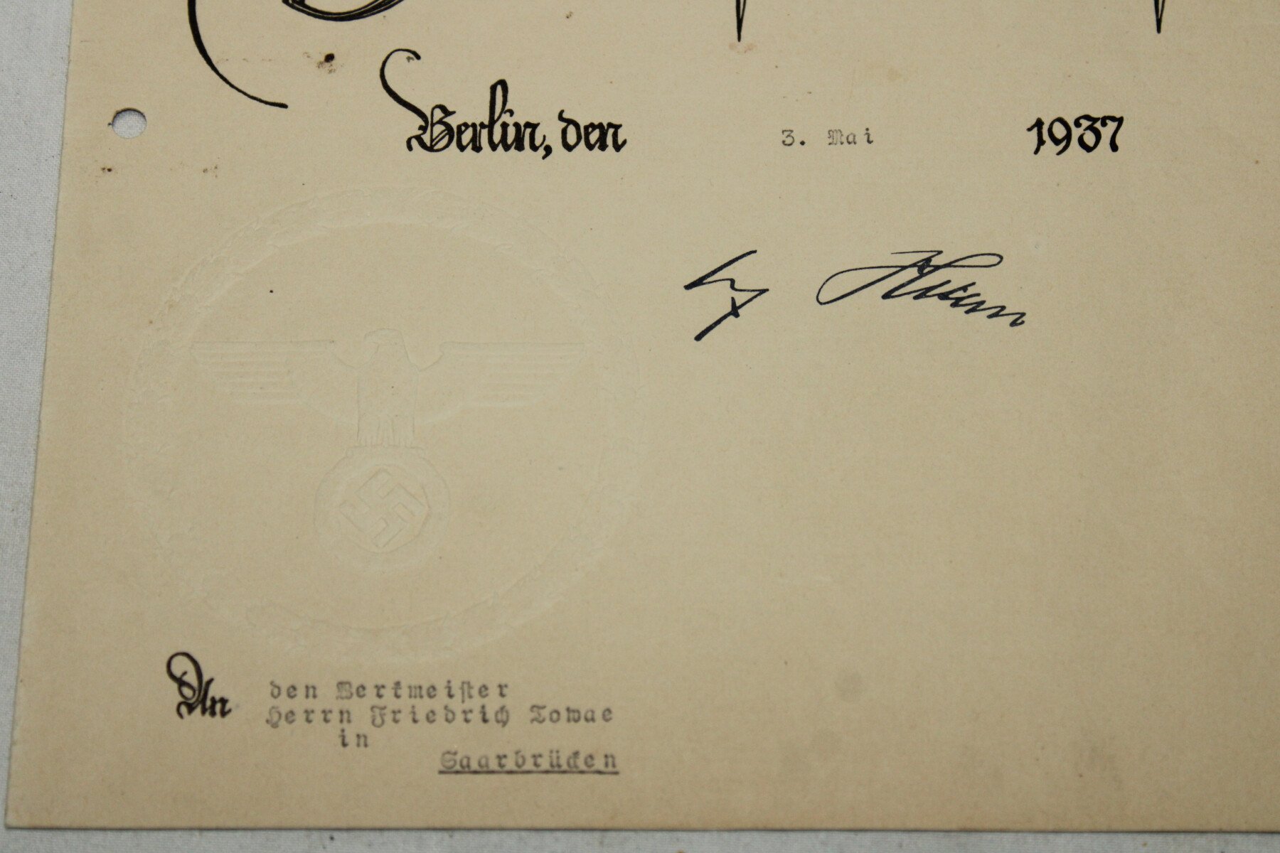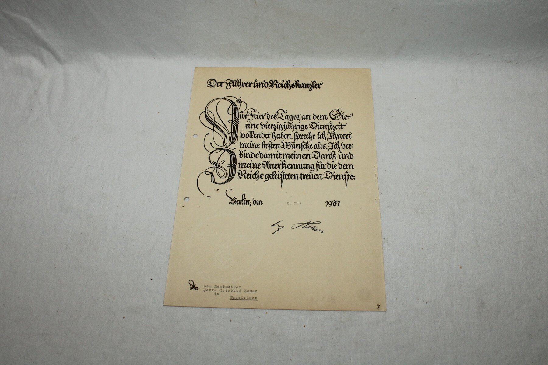 Diplôme de reconnaissance envers le Reich daté 1937.