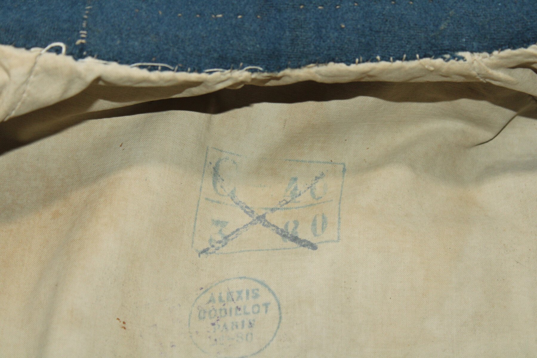 Dolman du 12e Régiment de chasseur a cheval modèle 1872/84 et sont calot. Nombreux défauts visible sur photos, tampons militaire et de costumier. Tampon de date peu lisible. Calot modèle 1891 en drap gris de fer bleuté daté 1912, taille 56. Largeur d'épaules: 45cm à plat. Largeur sous les aisselles: 50cm. Longueur de manche: 60 cm. Hauteur totale: 69cm.