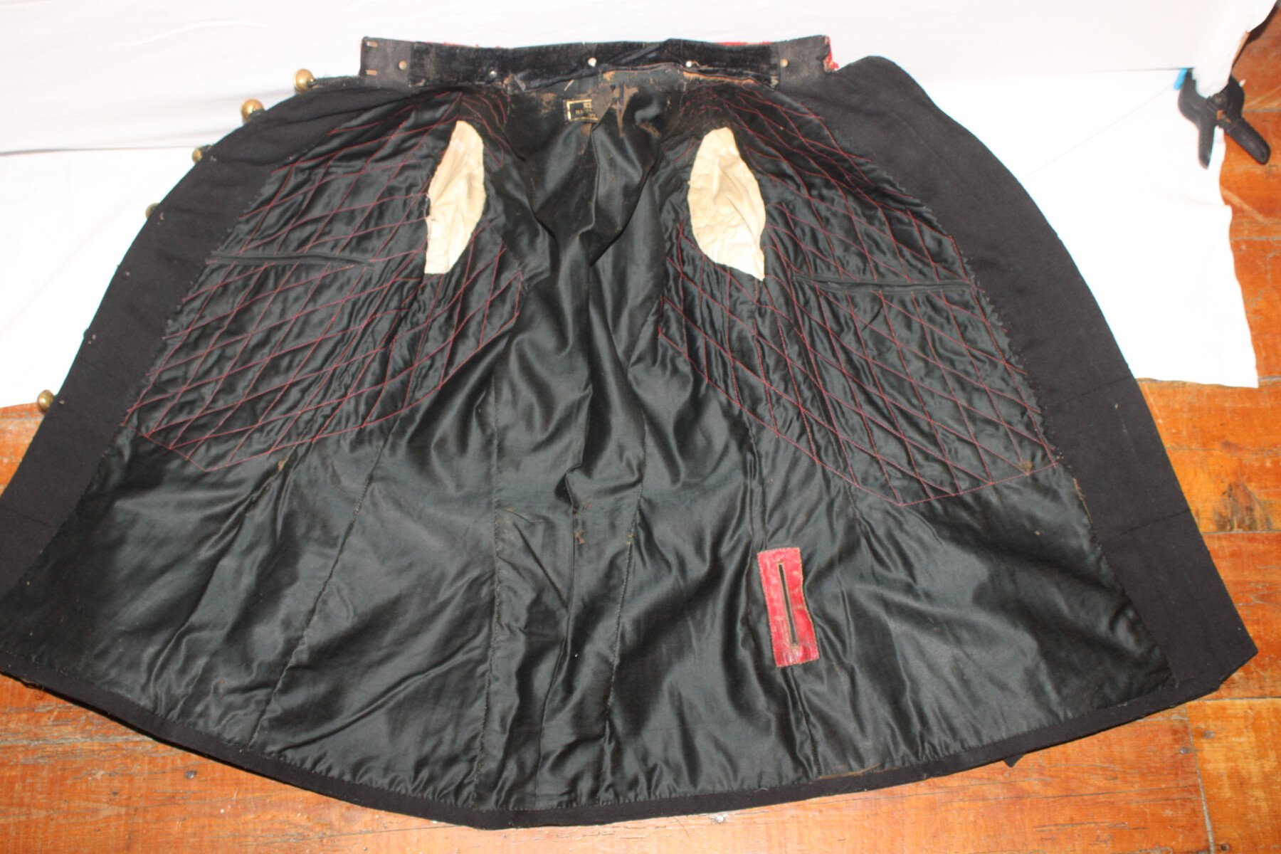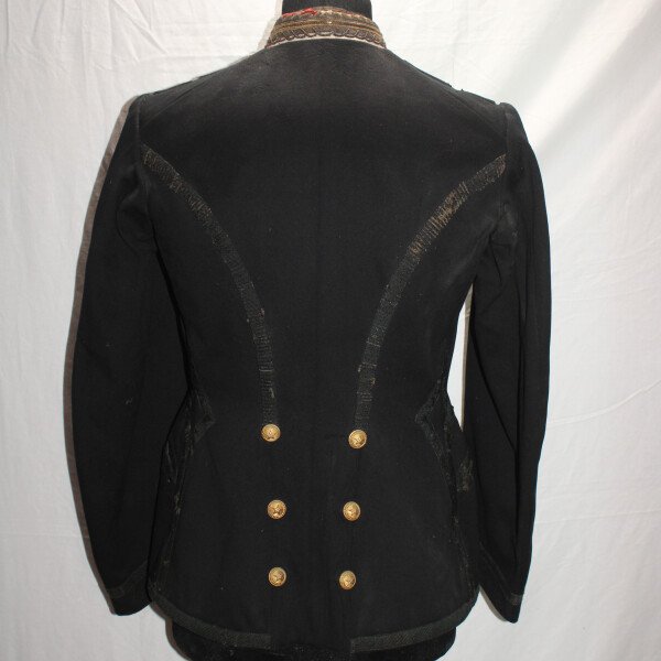Dolman modèle 1883 avec boutons grelots à l’étoile marqués Bureau de l’Intendance Militaire. Collet garance avec broderies en canetille et paillettes dorées. Doublure en bon état général....