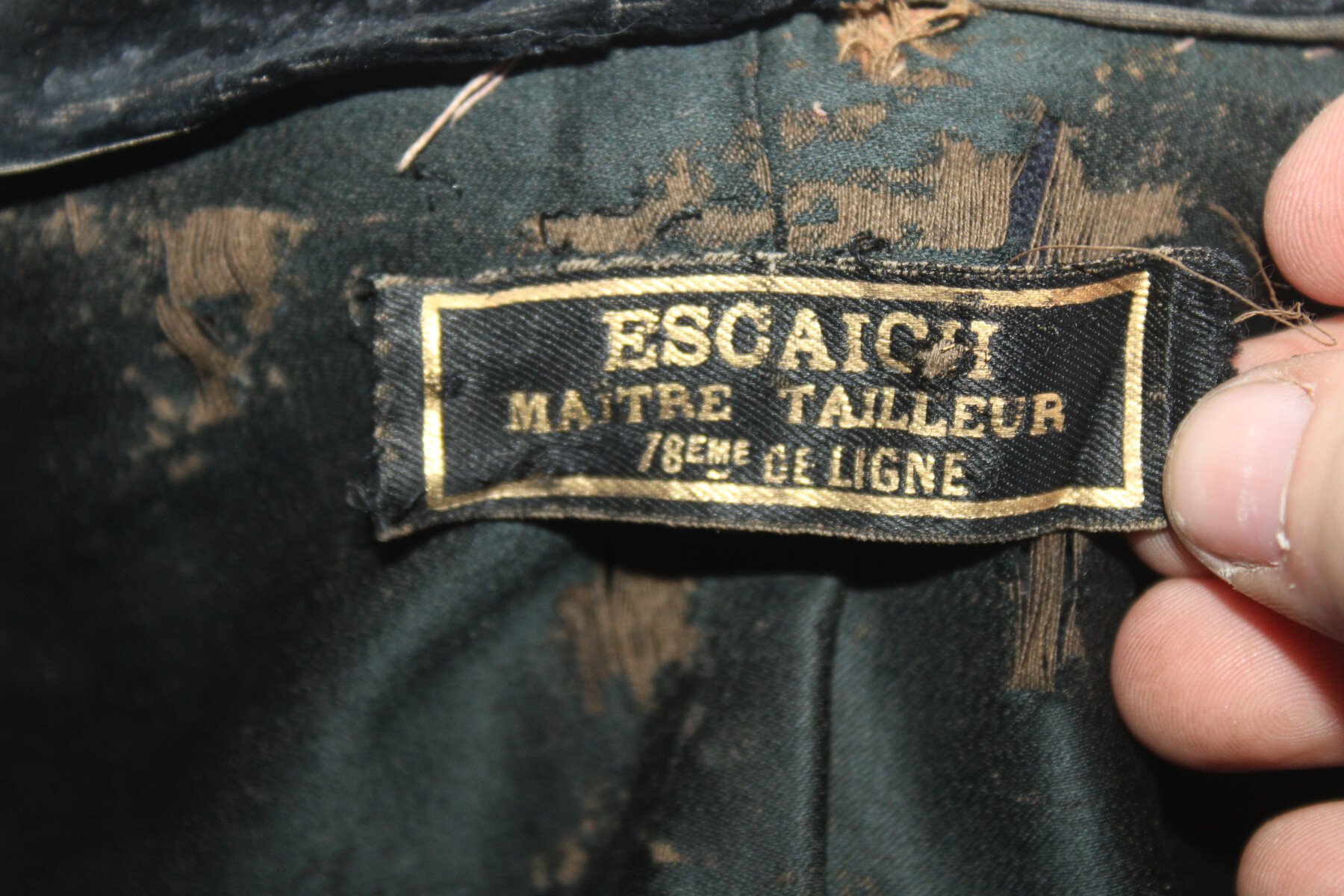 Dolman modèle 1883 avec boutons grelots à l’étoile marqués Bureau de l’Intendance Militaire. Collet garance avec broderies en canetille et paillettes dorées. Doublure en bon état général. Quelques trous et léchures de mites, poussière, usure et patine. Etiquette au col de tailleur du 78e de ligne. Largeur d'épaules: 41cm à plat. Largeur sous les aisselles: 48cm. Longueur de manche: 62cm. Hauteur totale: 70cm.